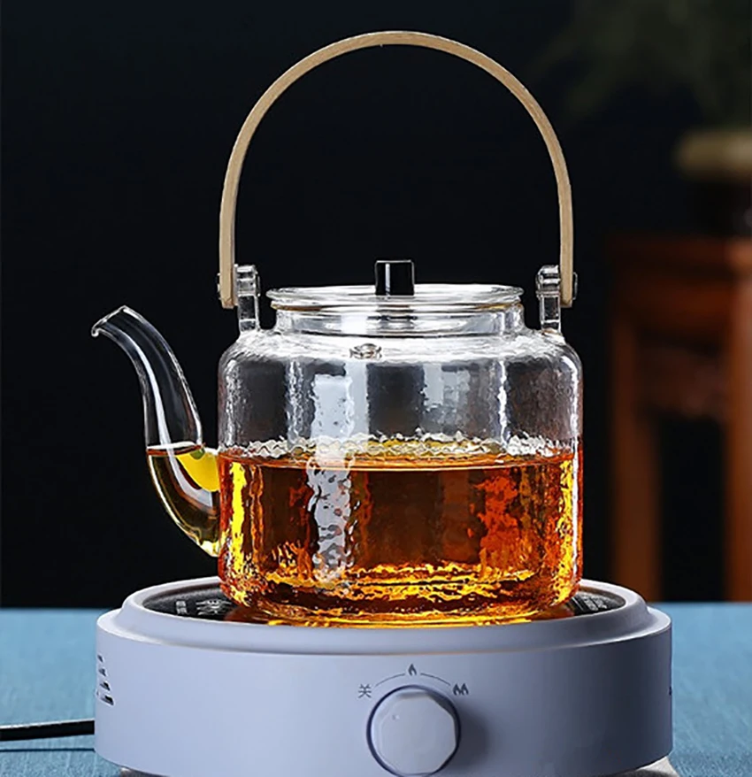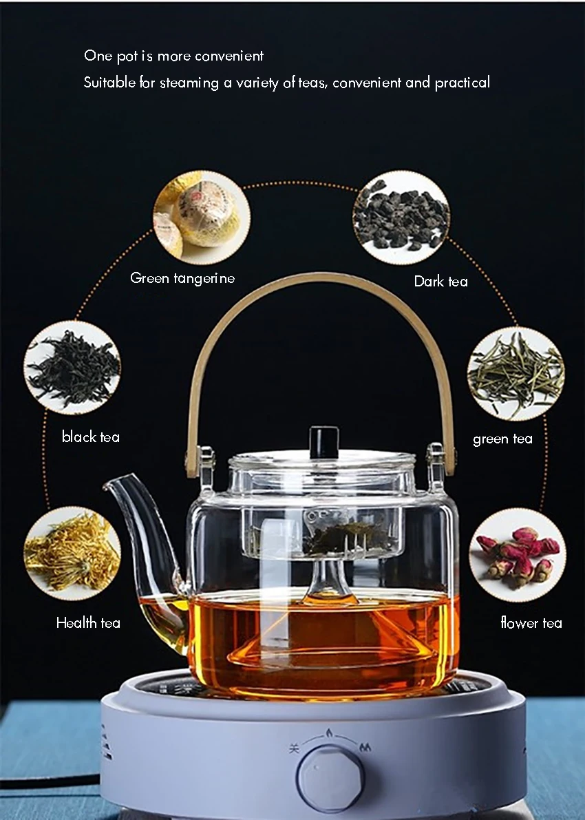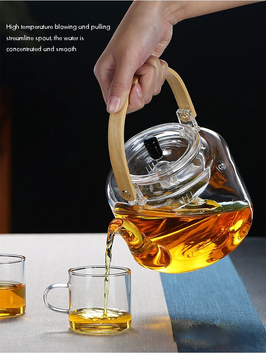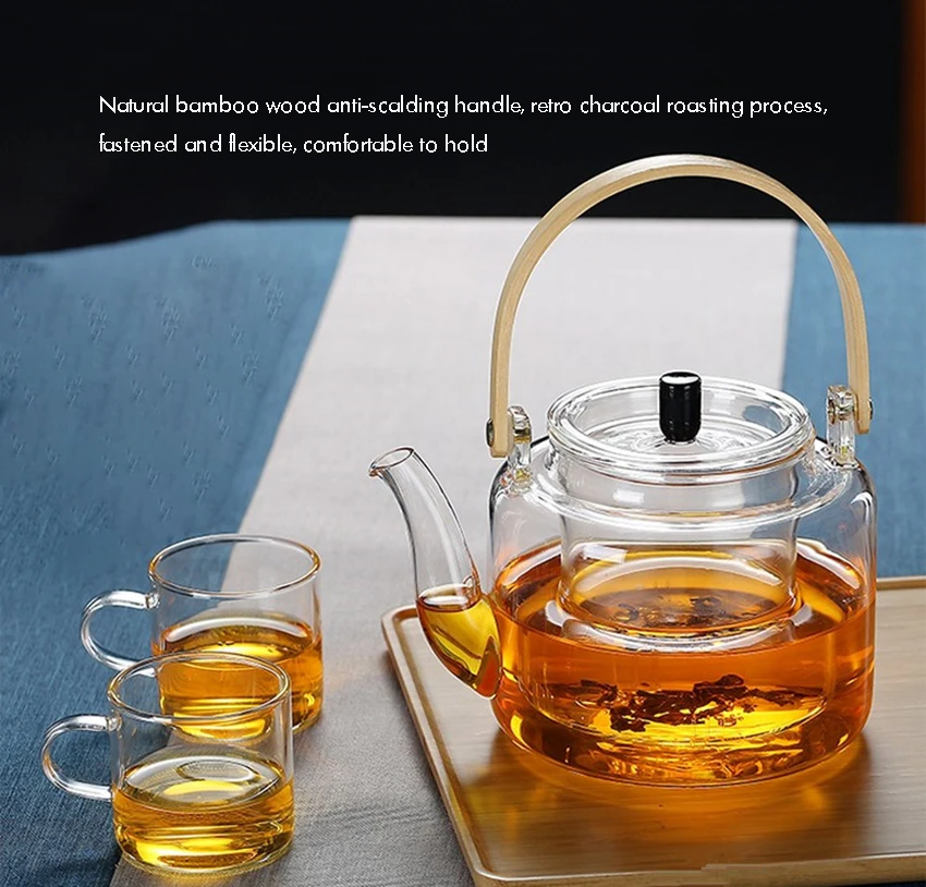 1000ml Glass Teapot, Stove Top Safe, Borosilicate Glass Kettle with Removable Infuser, Heat Resistant Wood Handle for Blooming Flower Tea