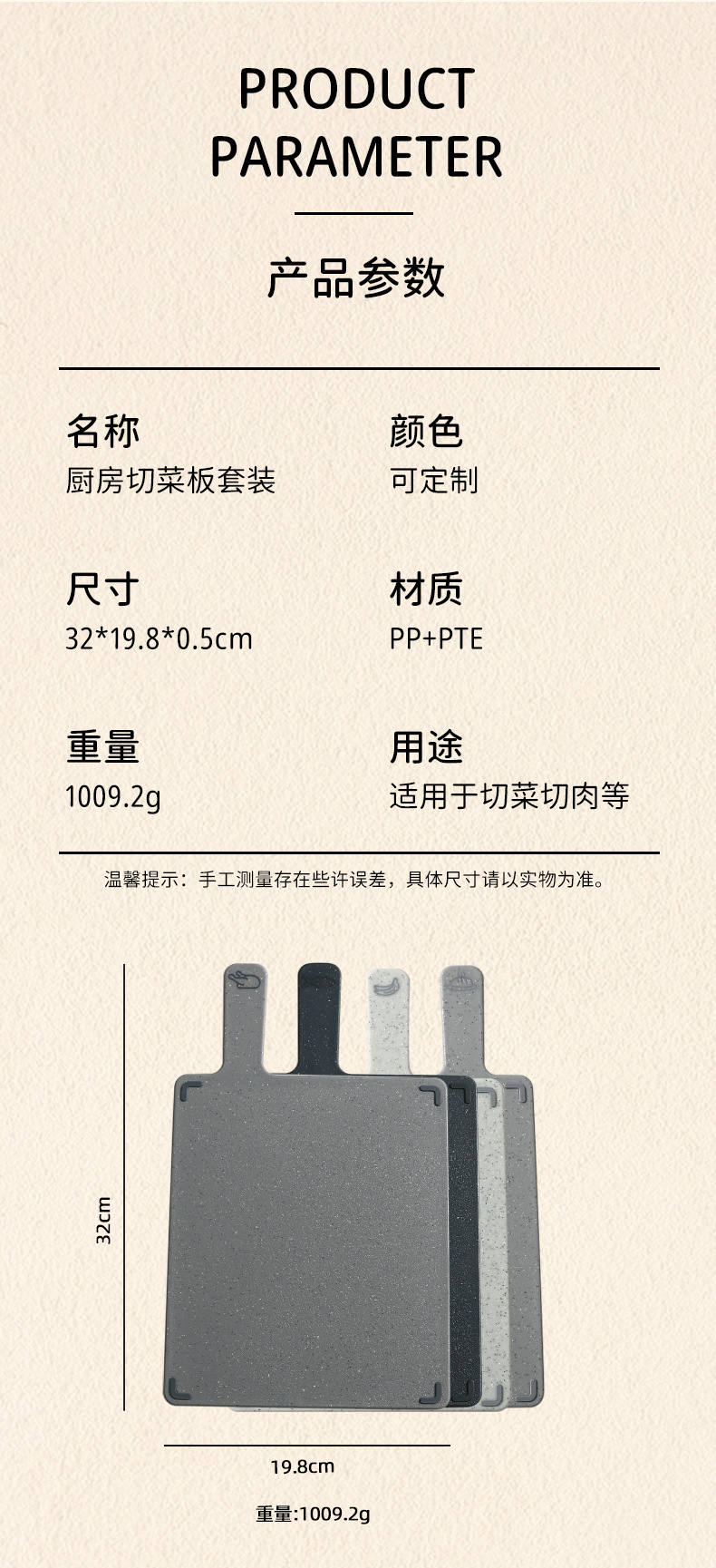 Name: Kitchen cutting board setSize: 32*19.8*0.5cmWeight: 1009.2gColor: 4 colorsMaterial: PP+PTEUsage: Suitable for cutting vegetables and meat, etc