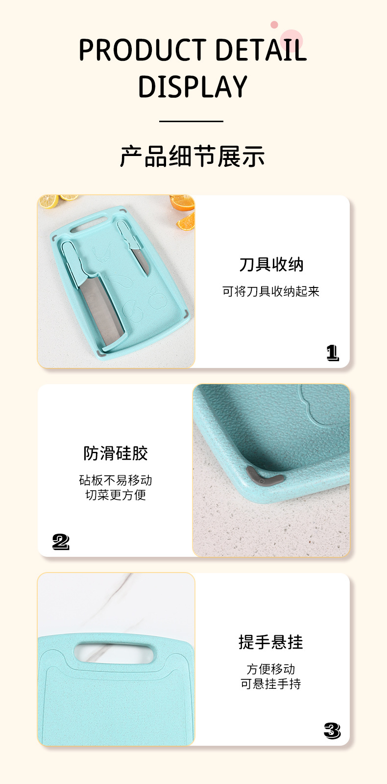 KM-7034 Kitchen Cutting Board Plastic 3-in-1 Multi-functional Durable Chopping Board with Knife Set