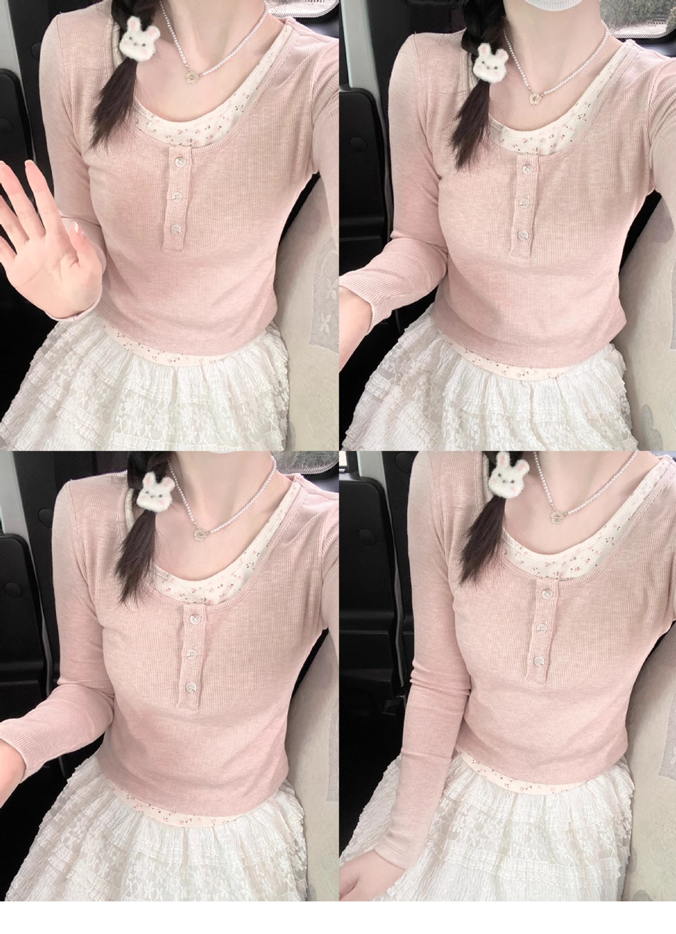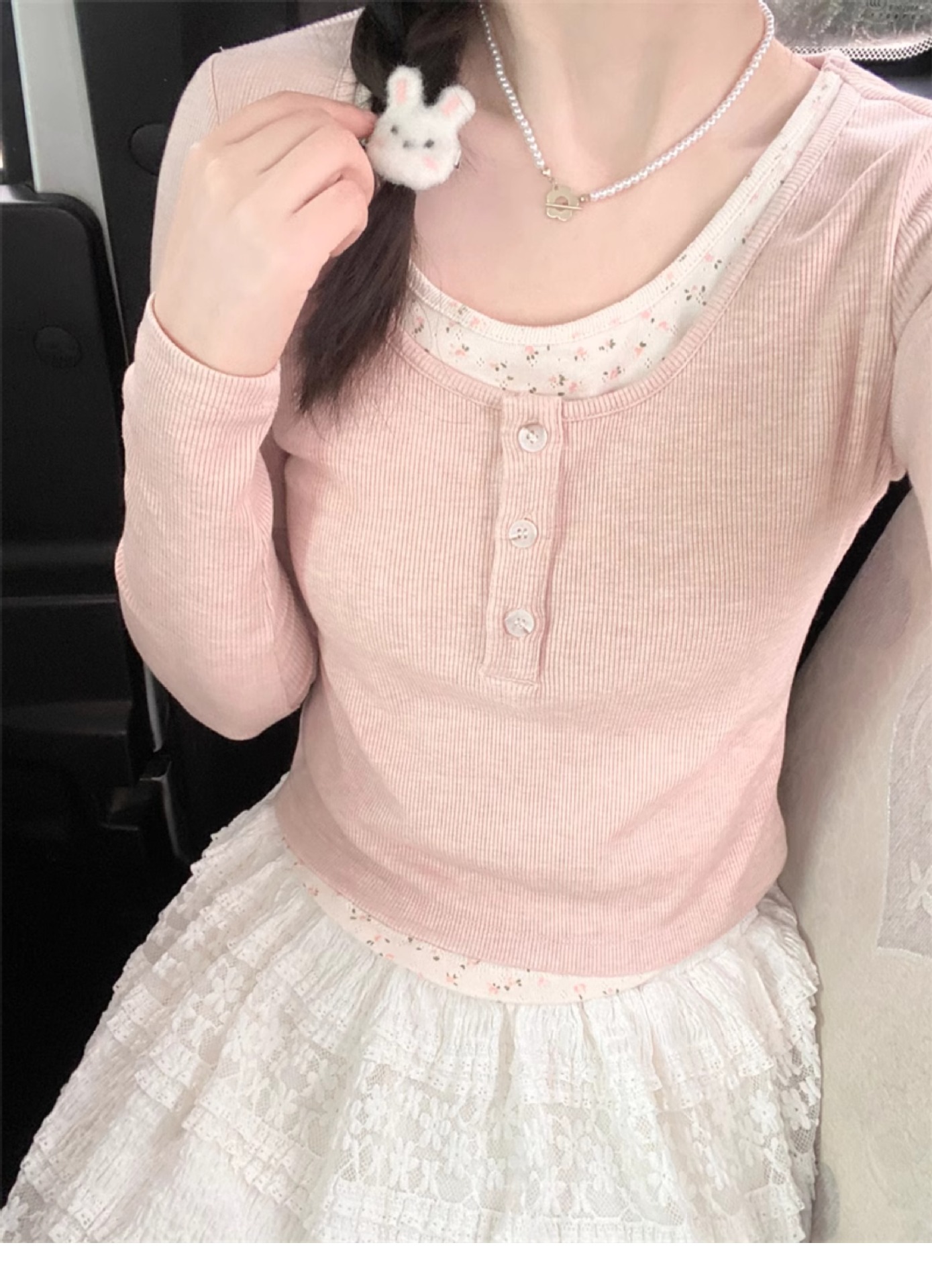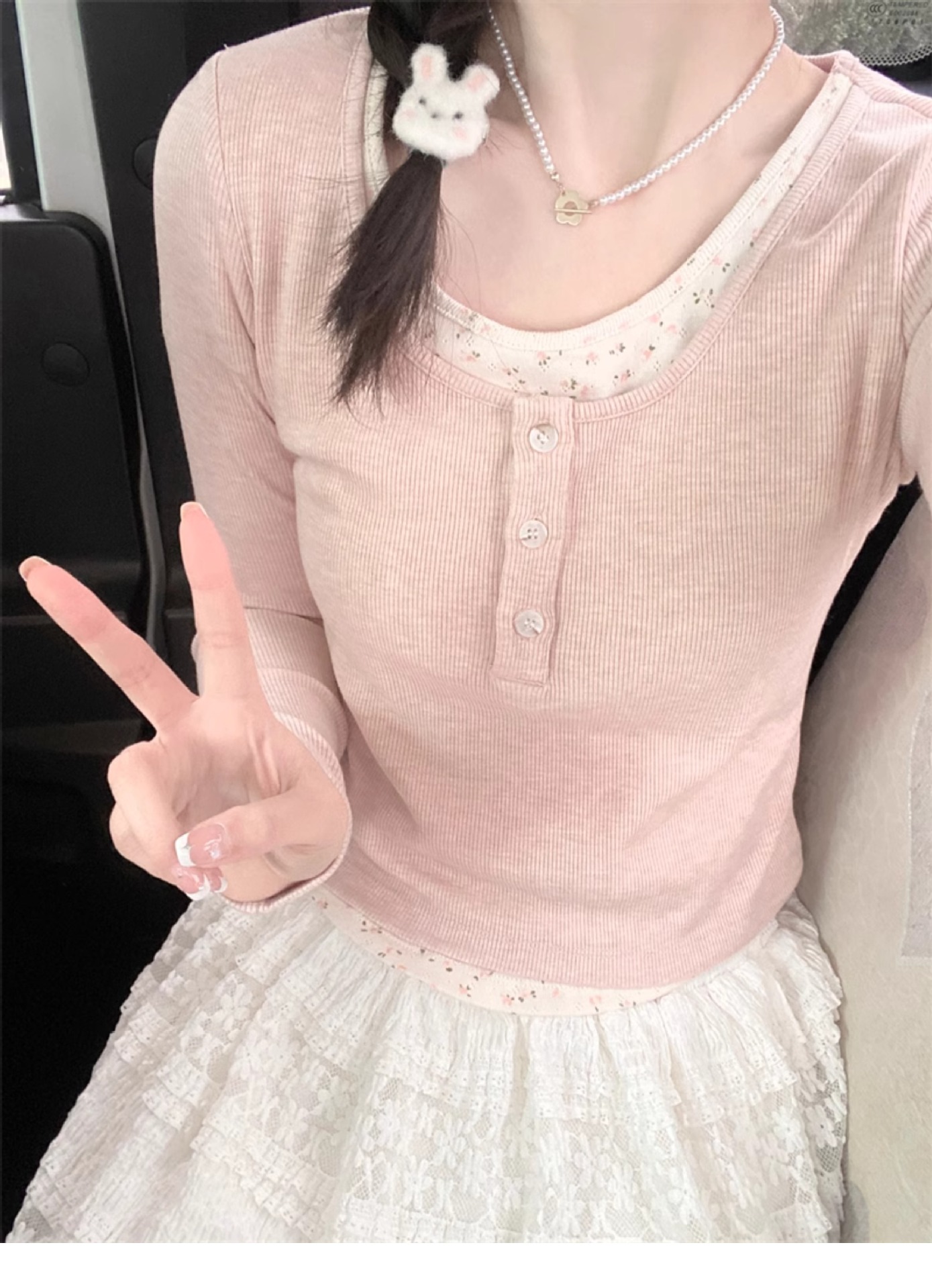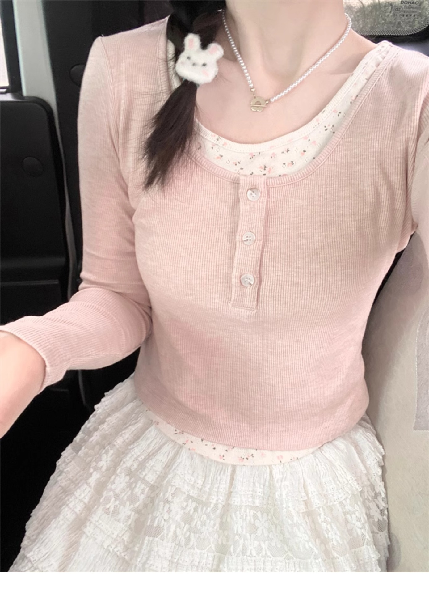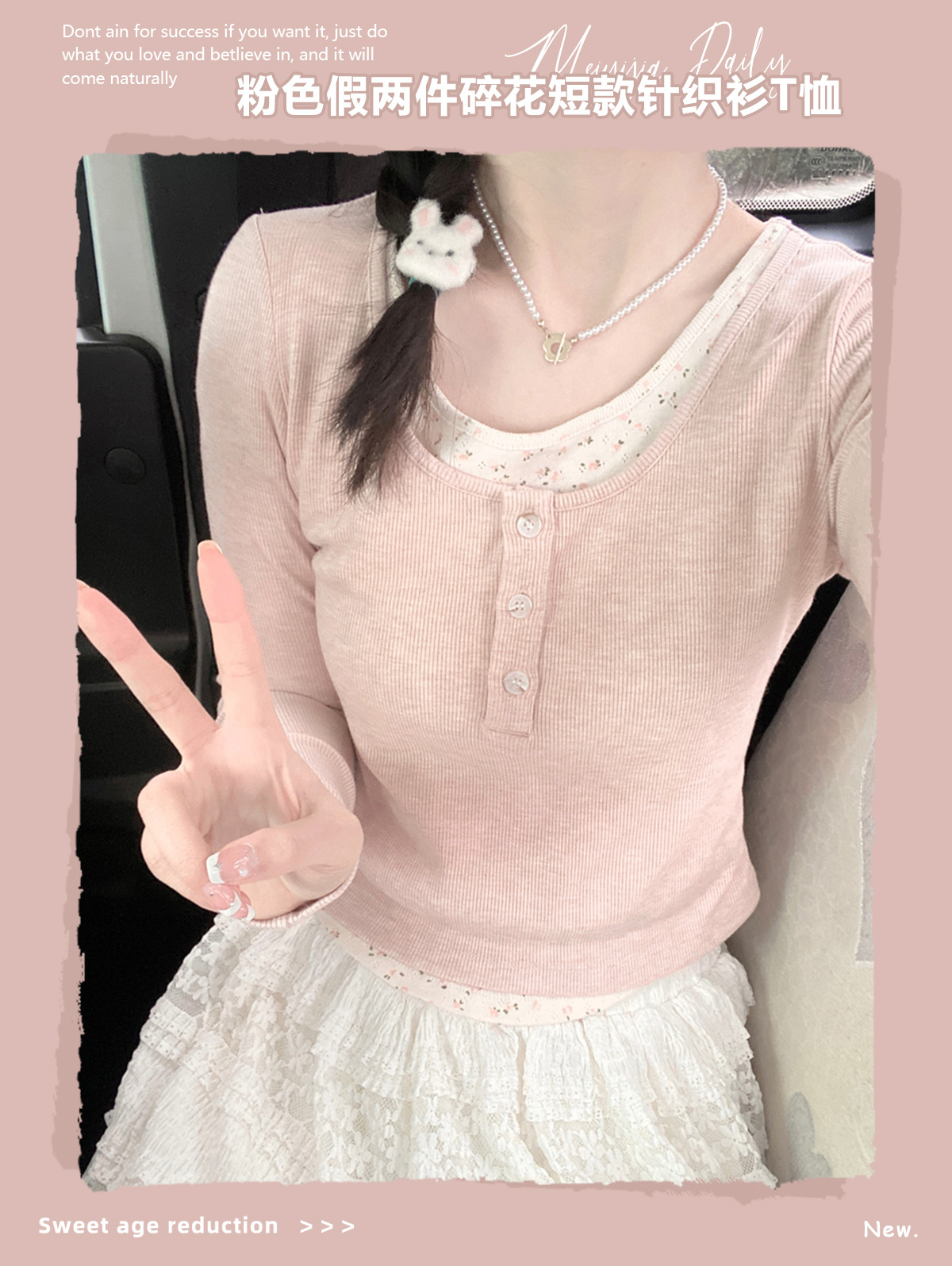 Pink Pure Stitching Fake Two-piece Bm Floral Base Knitwear Women's Early Spring Slim-fit Long-sleeved T-shirt Short Top