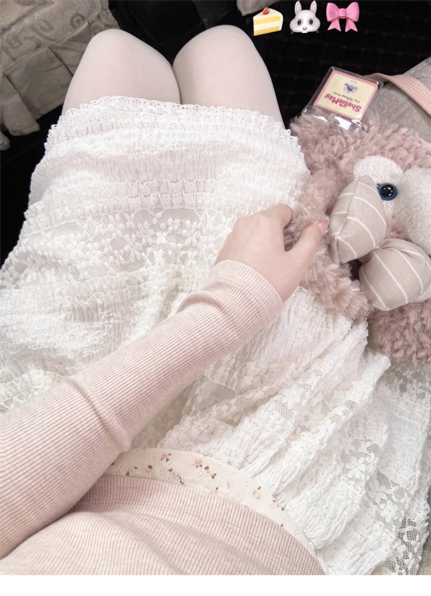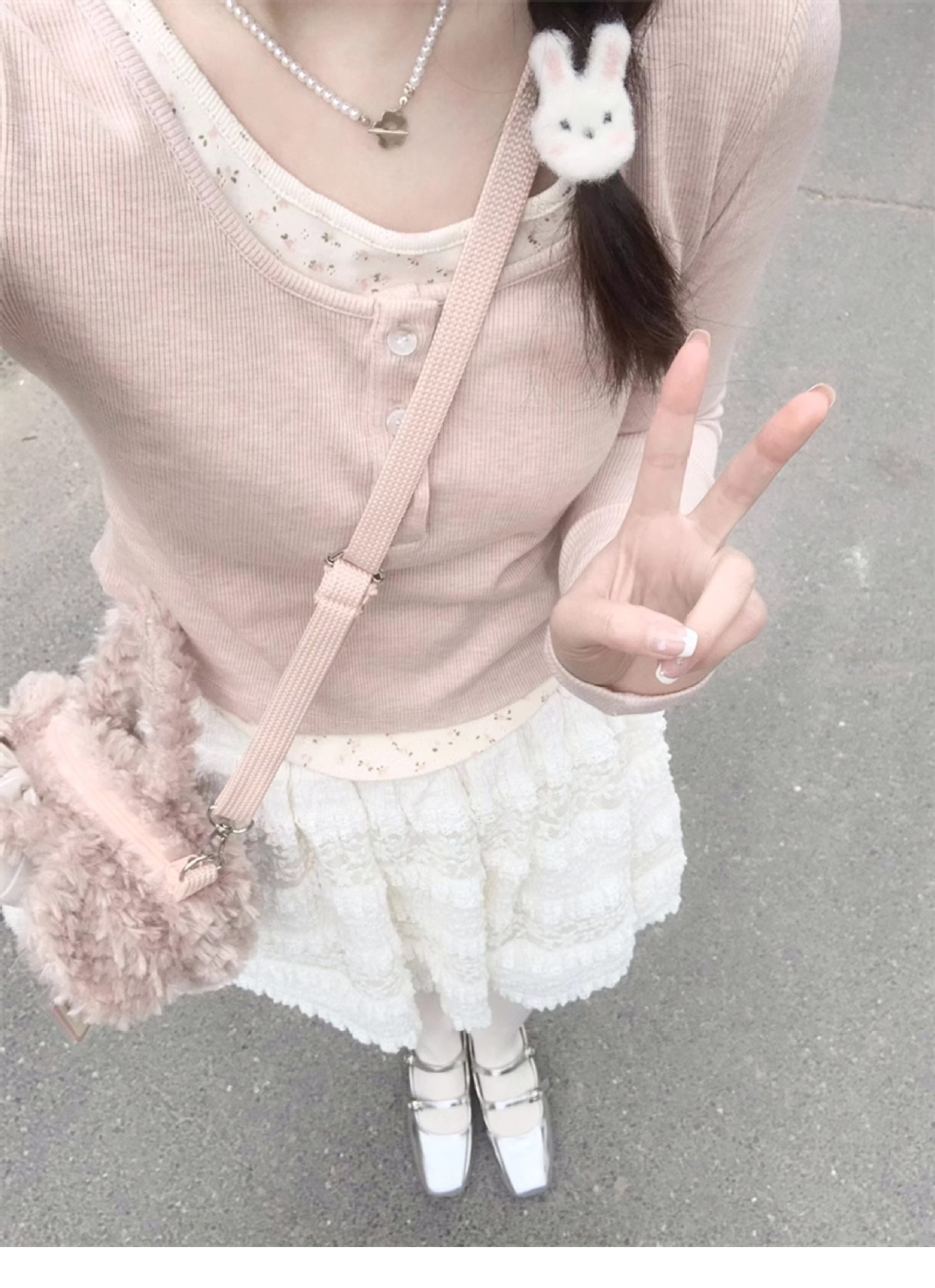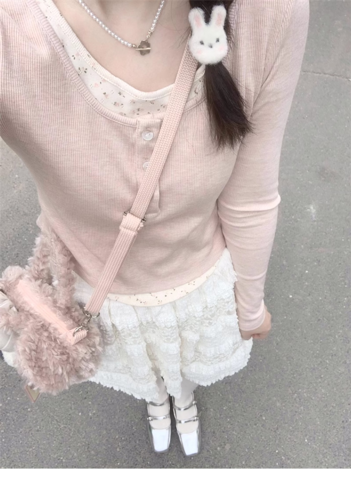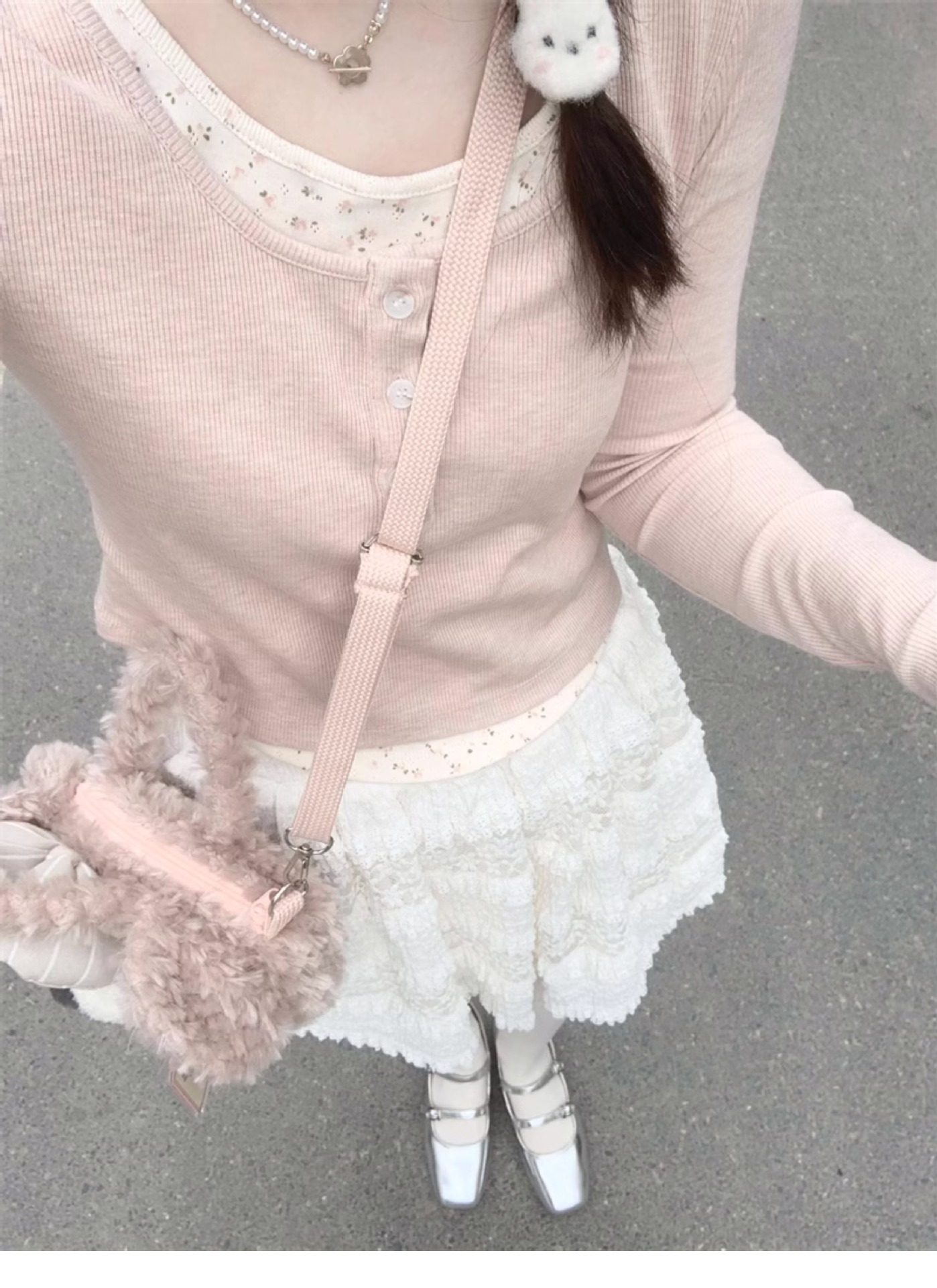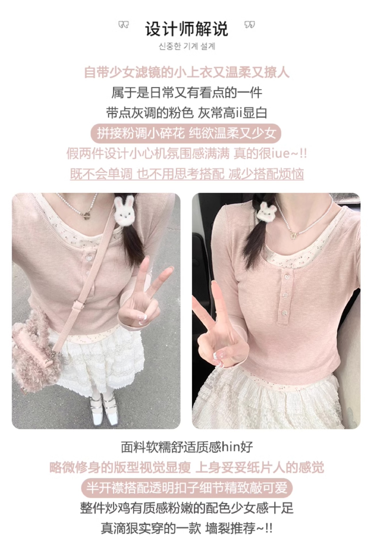 Pink Pure Stitching Fake Two-piece Bm Floral Base Knitwear Women's Early Spring Slim-fit Long-sleeved T-shirt Short Top