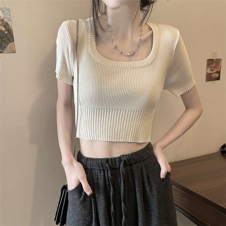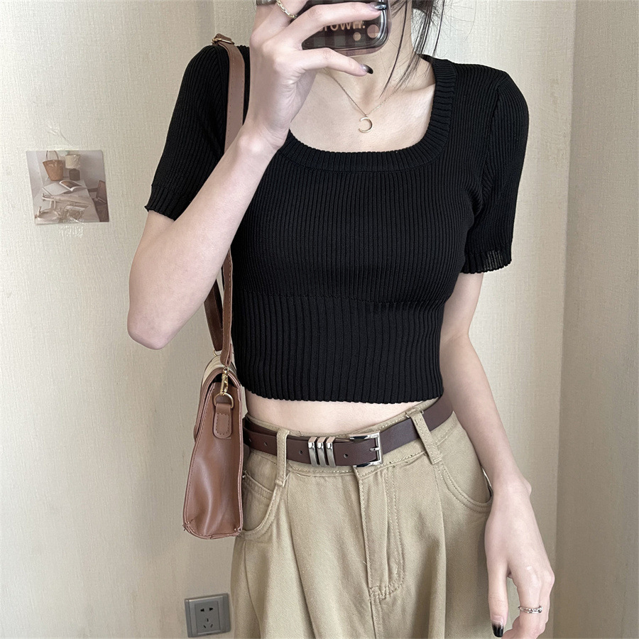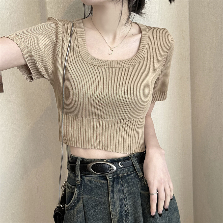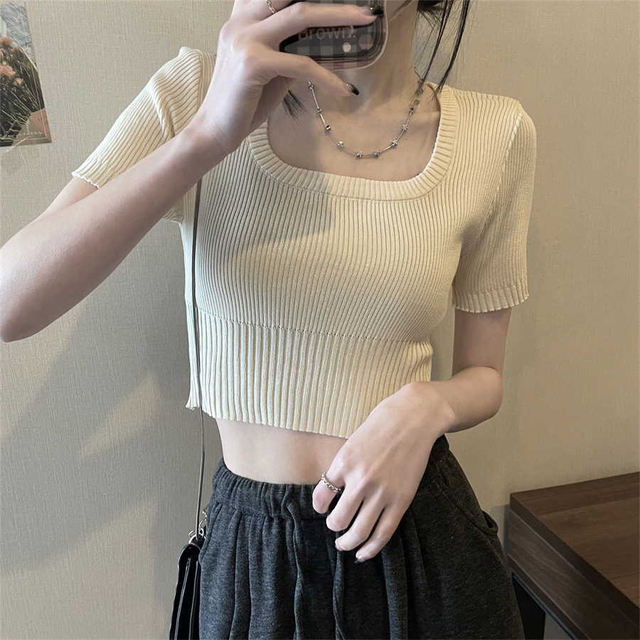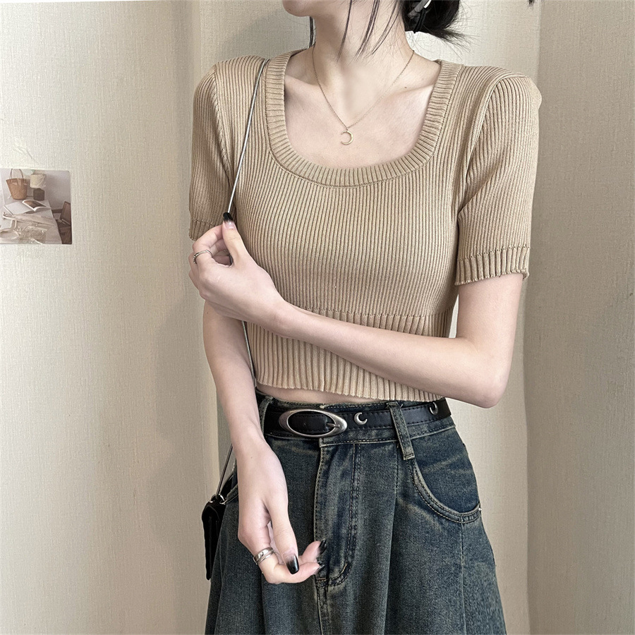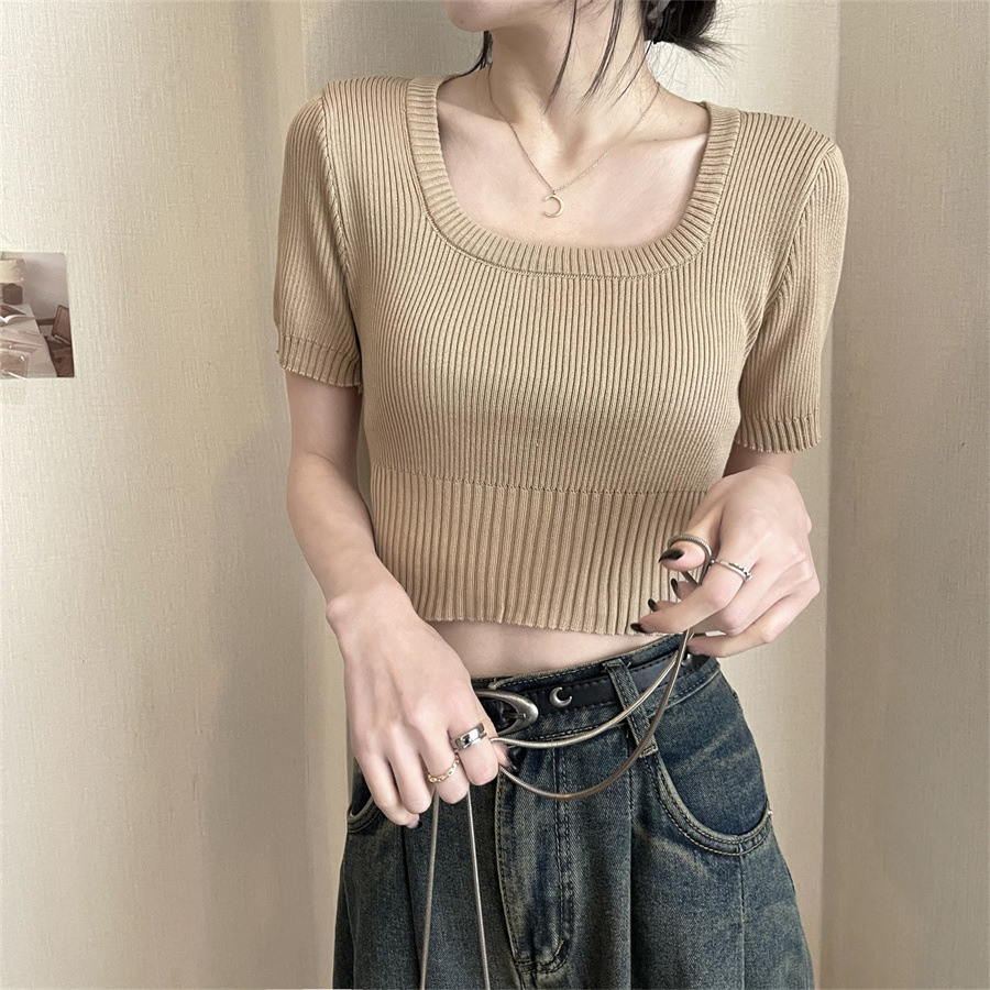 Vintage Apricot Short-sleeved Square Collar Shirt Knitted Sweater Women's Summer Small Slim-fit Slimming Western Style Shoulder Short Top