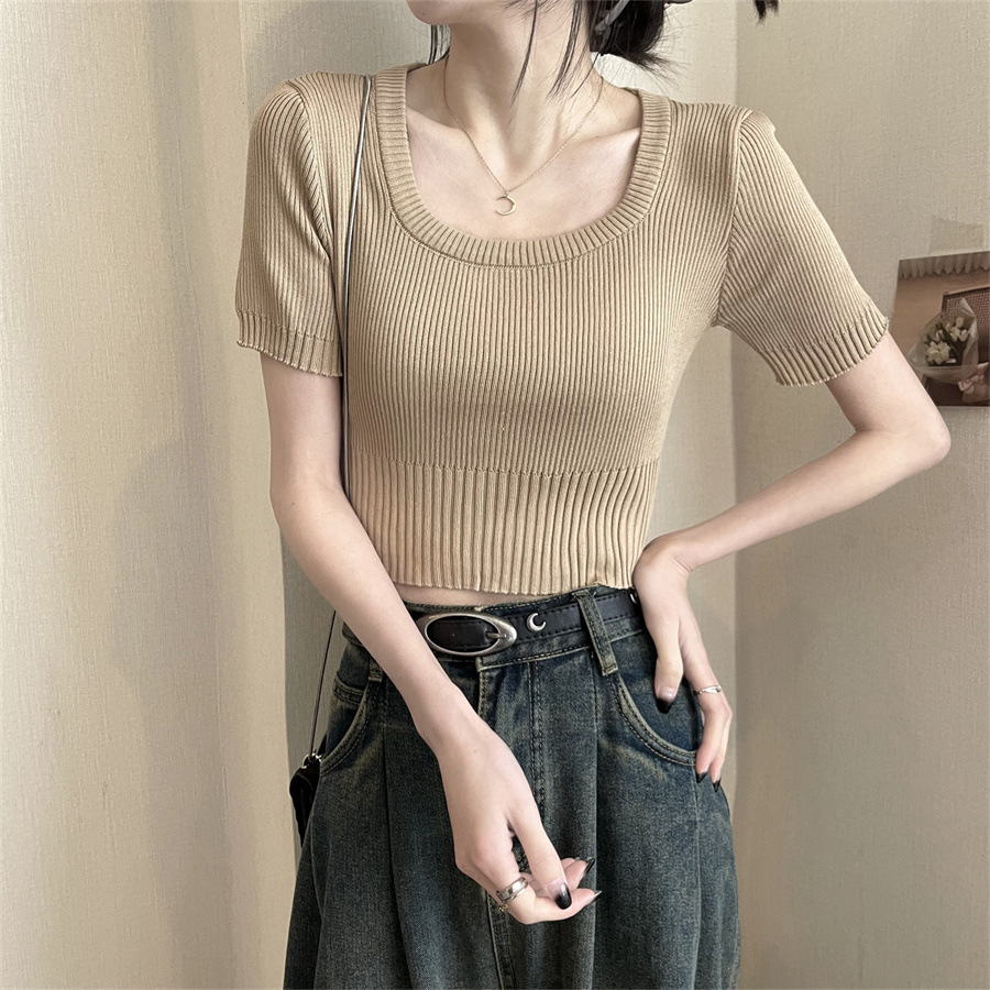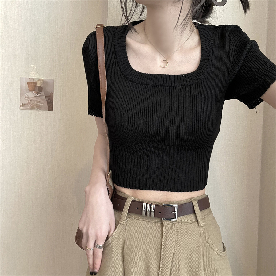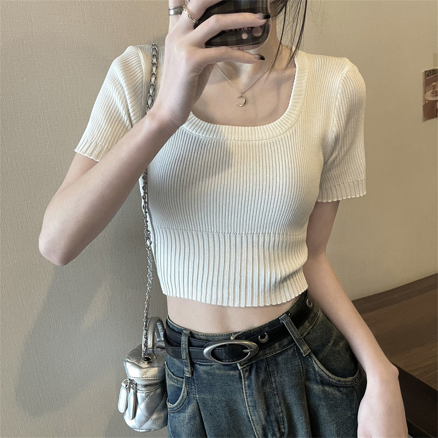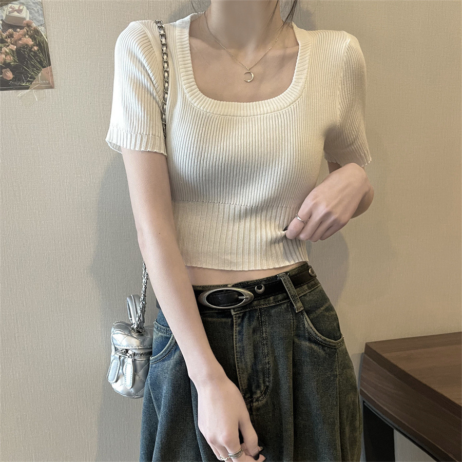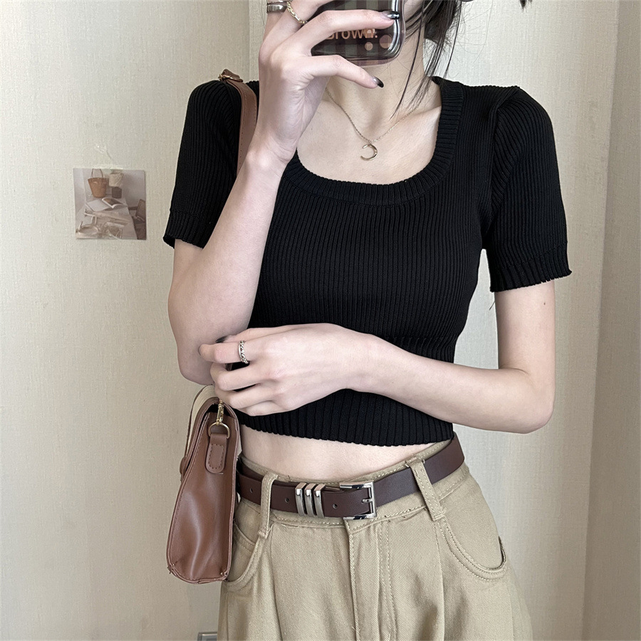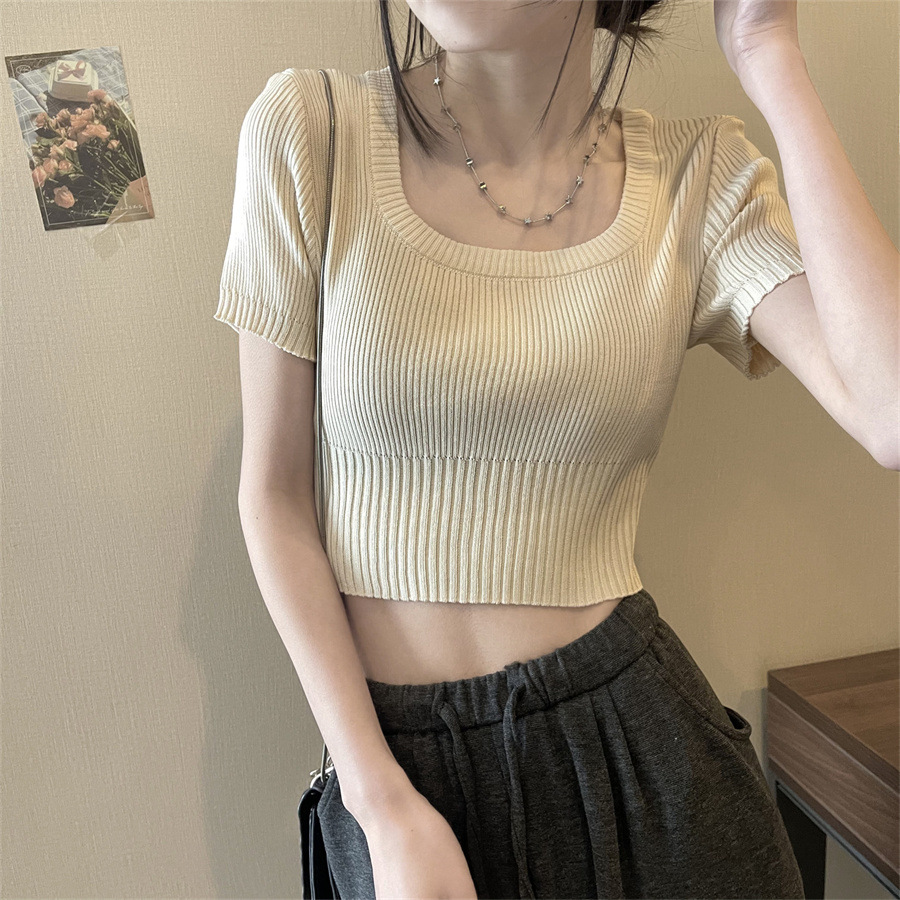 Vintage Apricot Short-sleeved Square Collar Shirt Knitted Sweater Women's Summer Small Slim-fit Slimming Western Style Shoulder Short Top