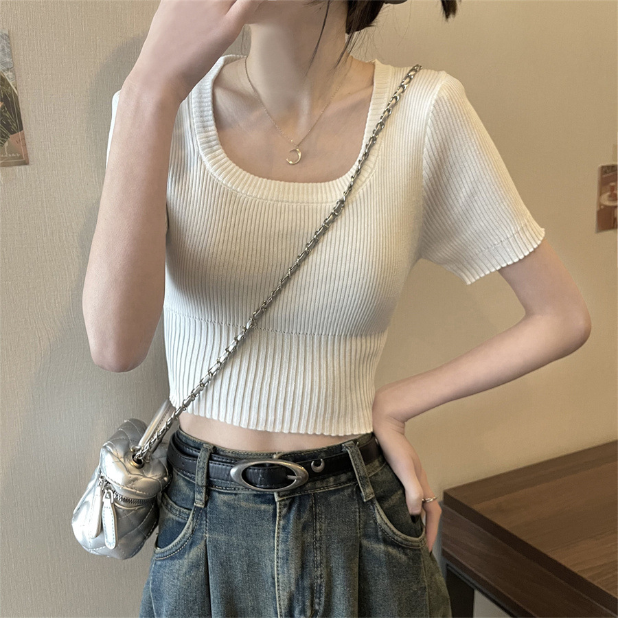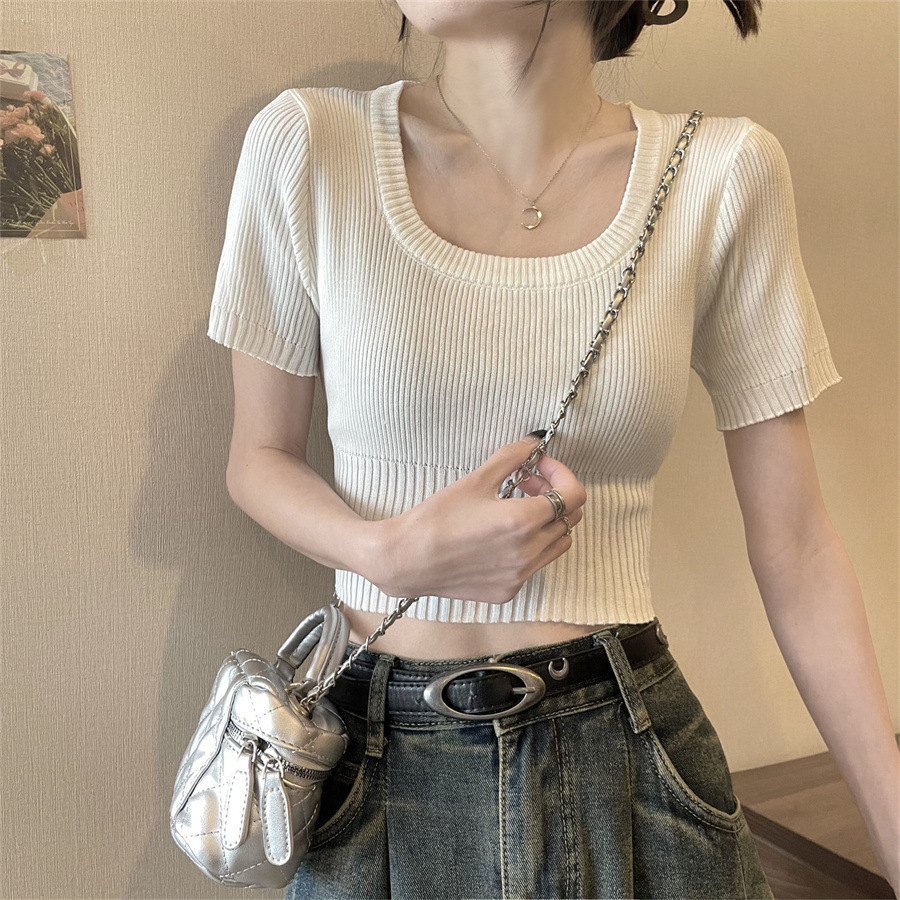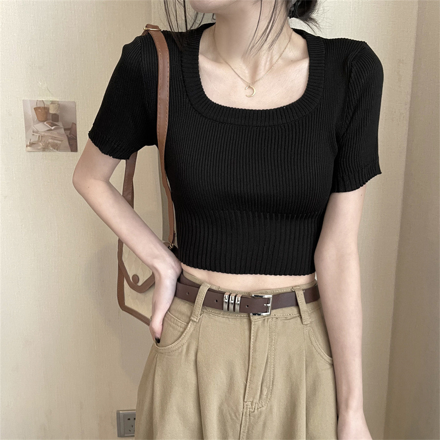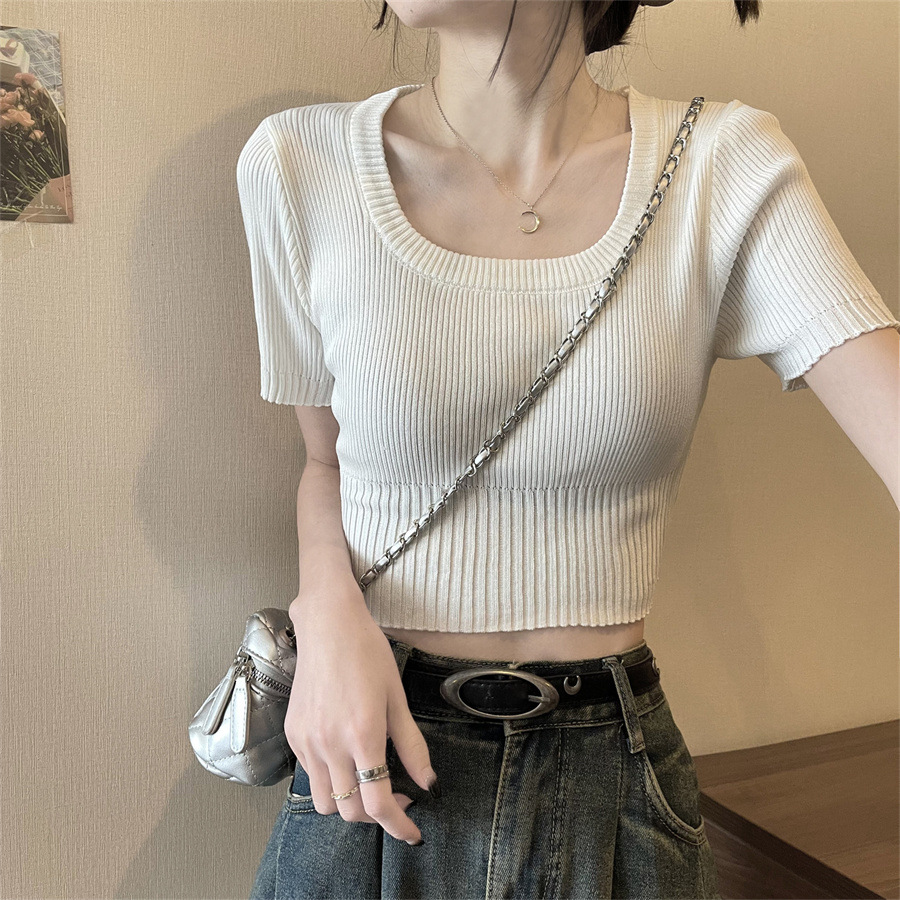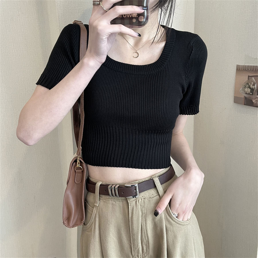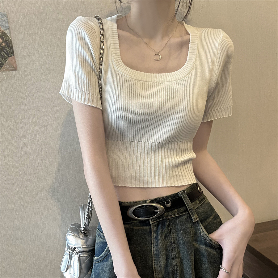 Vintage Apricot Short-sleeved Square Collar Shirt Knitted Sweater Women's Summer Small Slim-fit Slimming Western Style Shoulder Short Top