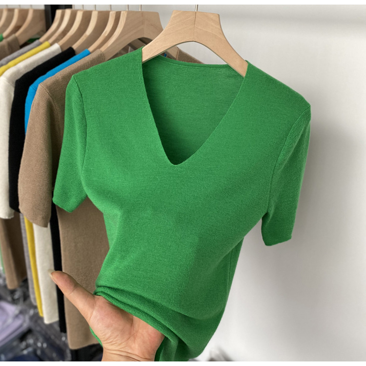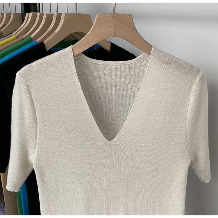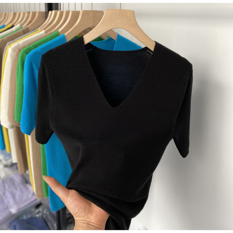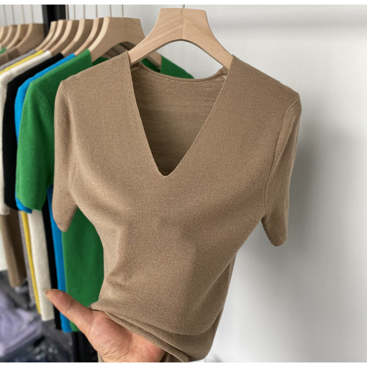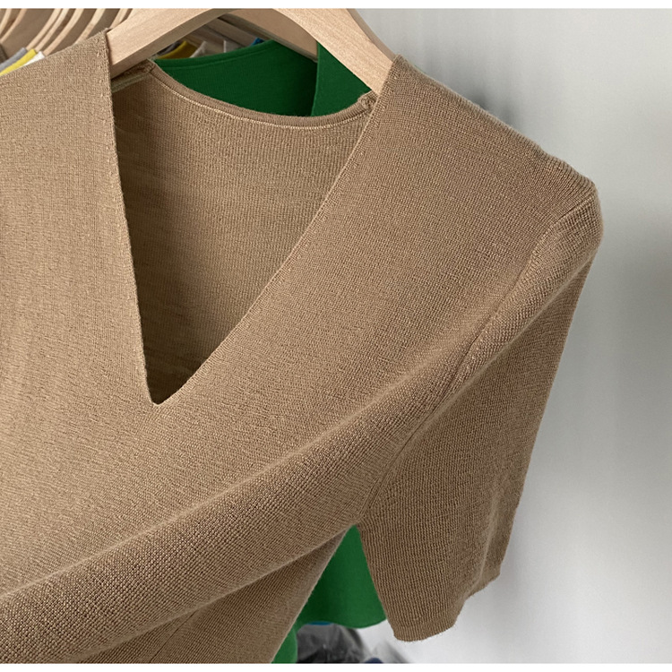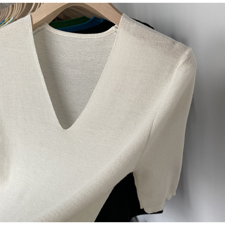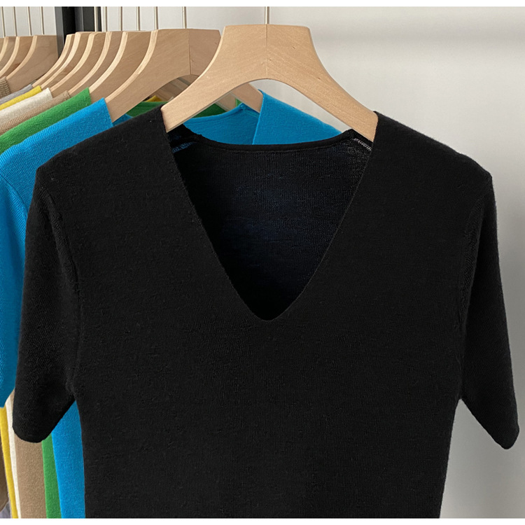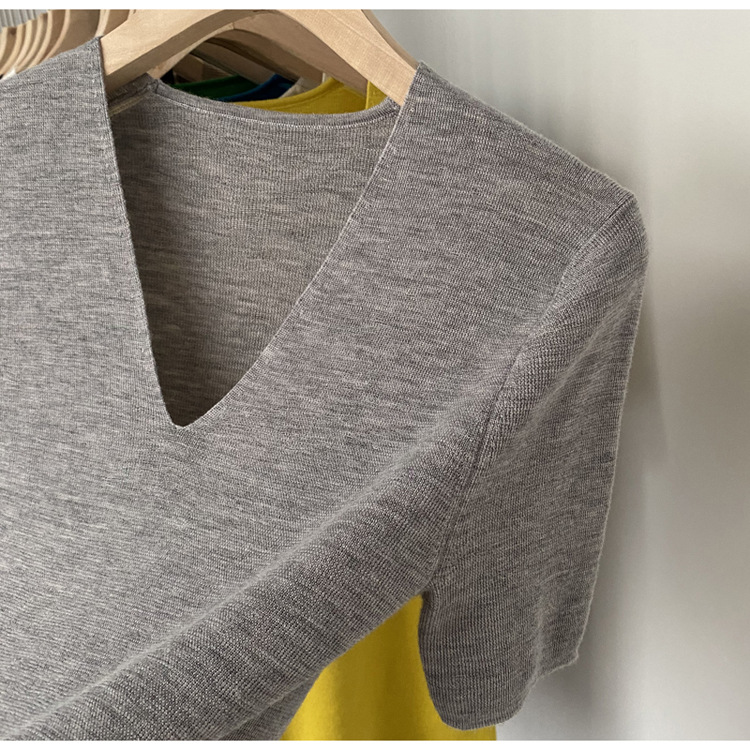 Spring and Summer 2024 New V-neck Elegant Short-sleeved Thin Sweater Women's Breathable Slim-fit Stylish Mid-sleeved Base Top