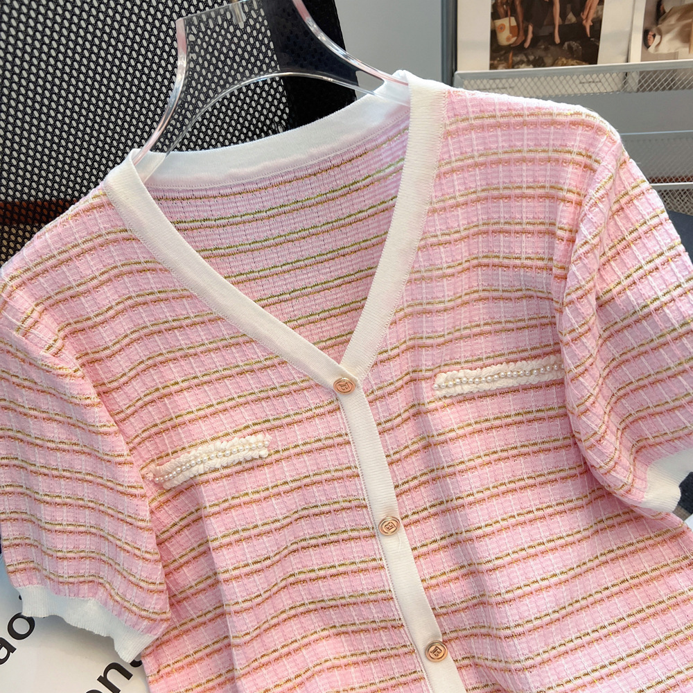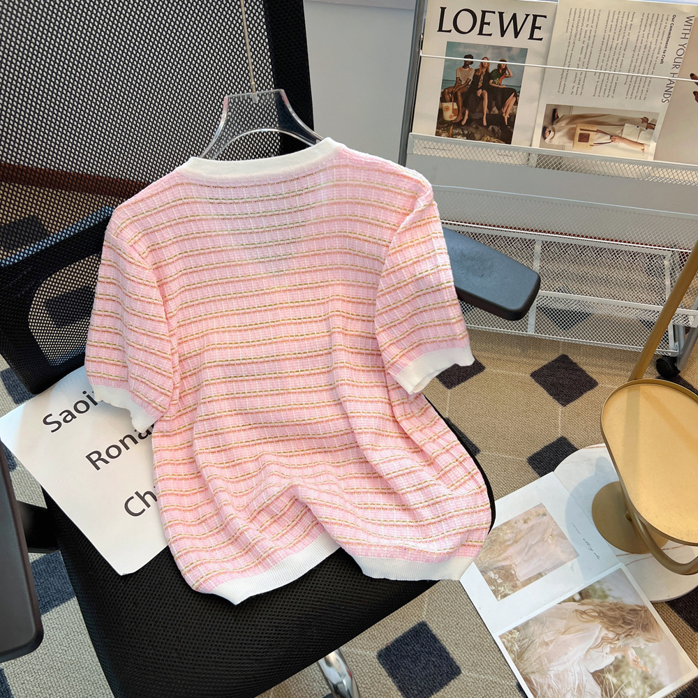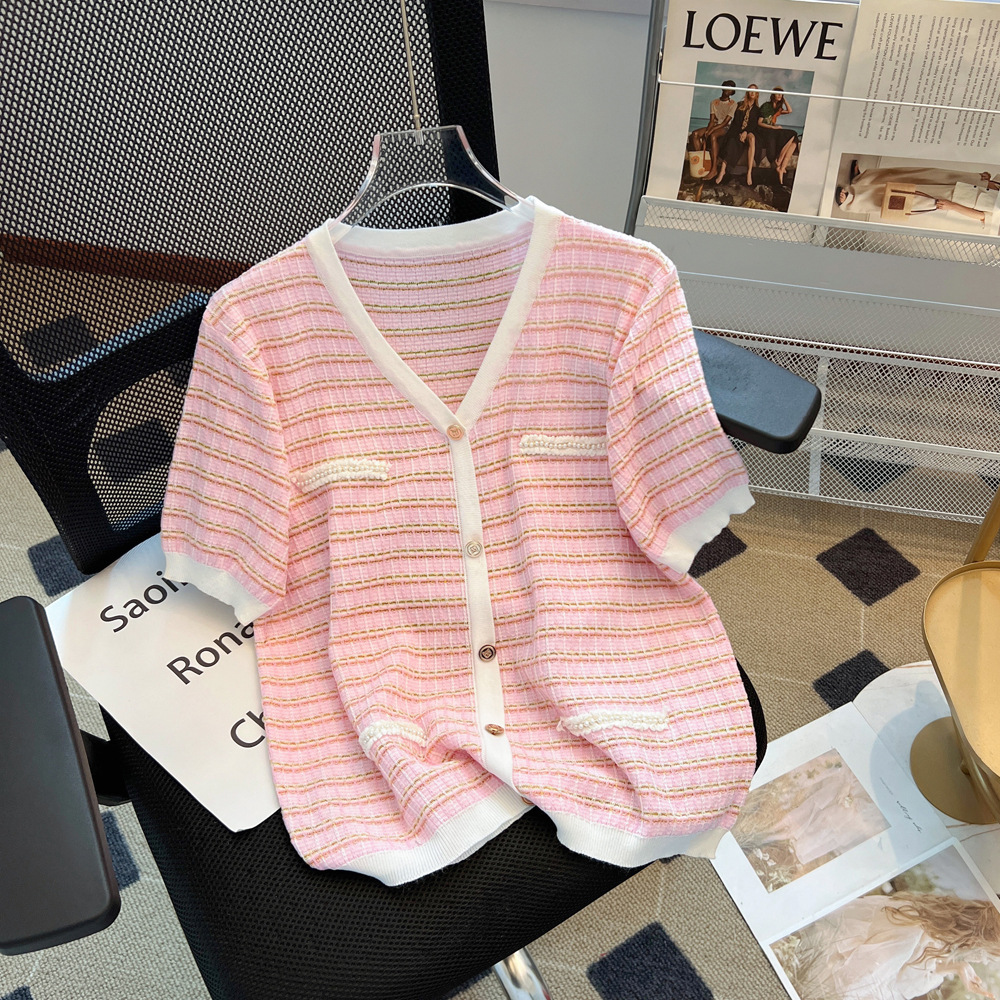 Chanel style V-neck short-sleeved sweater for women 2024 Summer new pink thin slimming T-shirt Ice Silk top spring and autumn