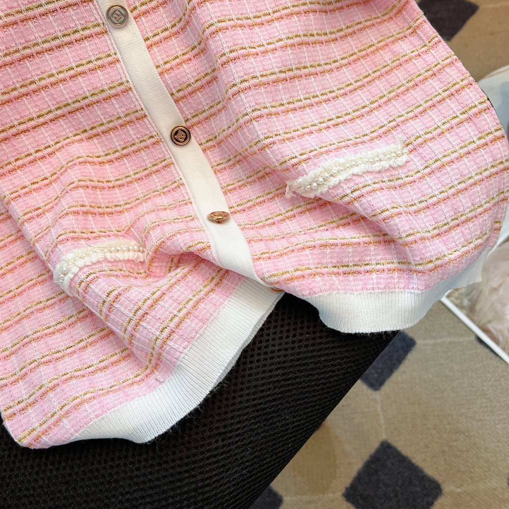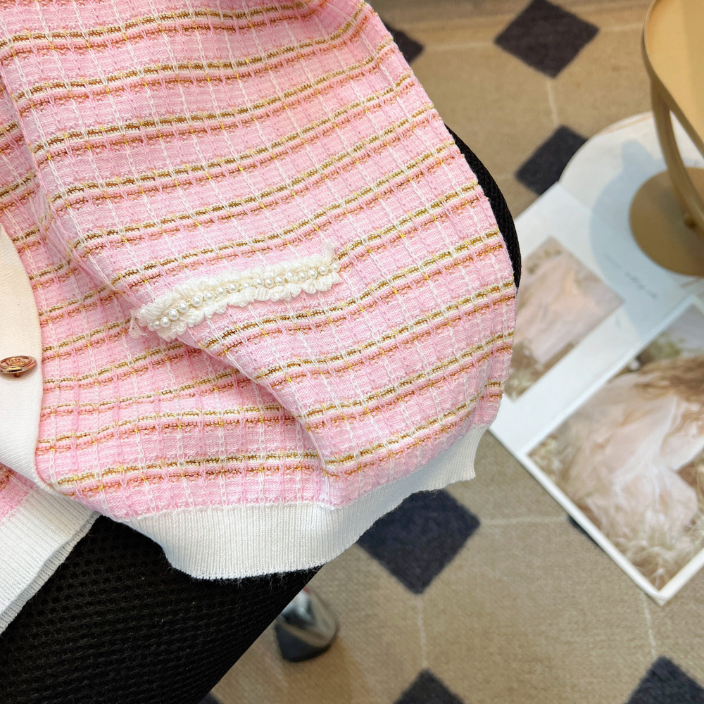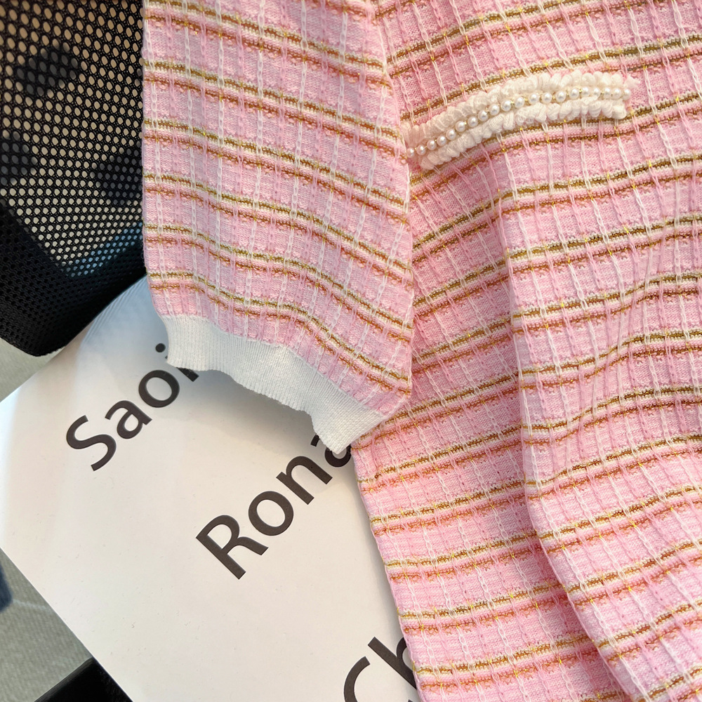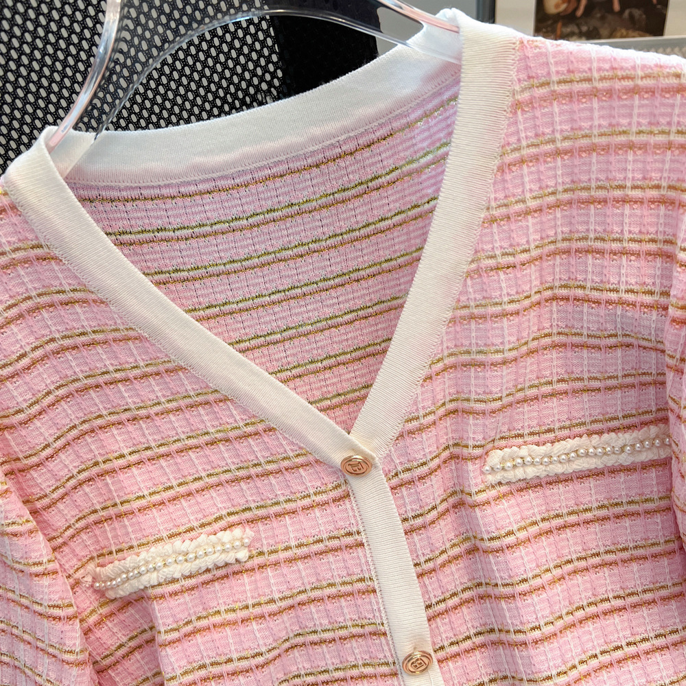 Chanel style V-neck short-sleeved sweater for women 2024 Summer new pink thin slimming T-shirt Ice Silk top spring and autumn