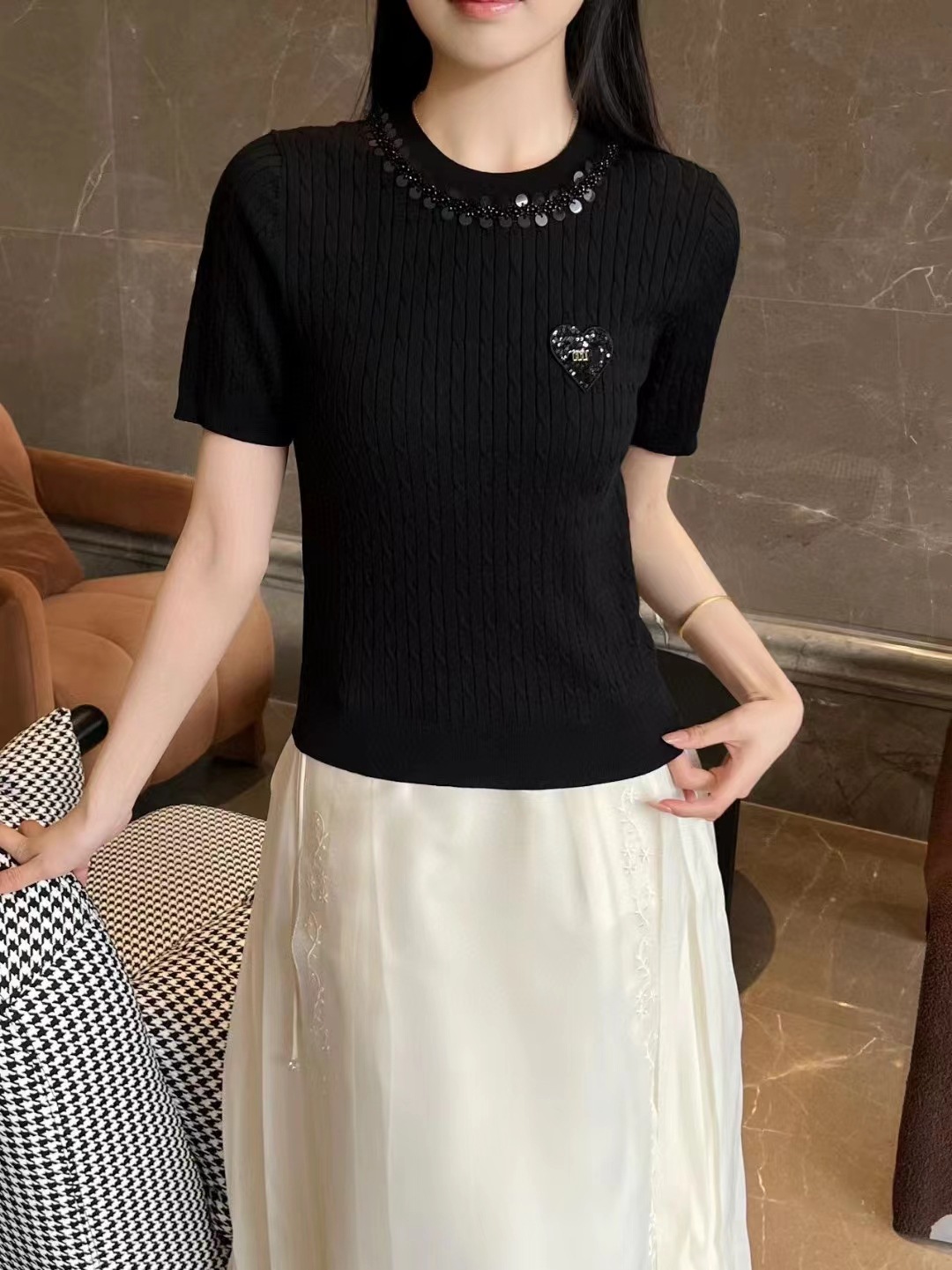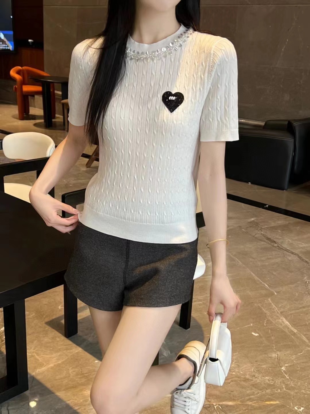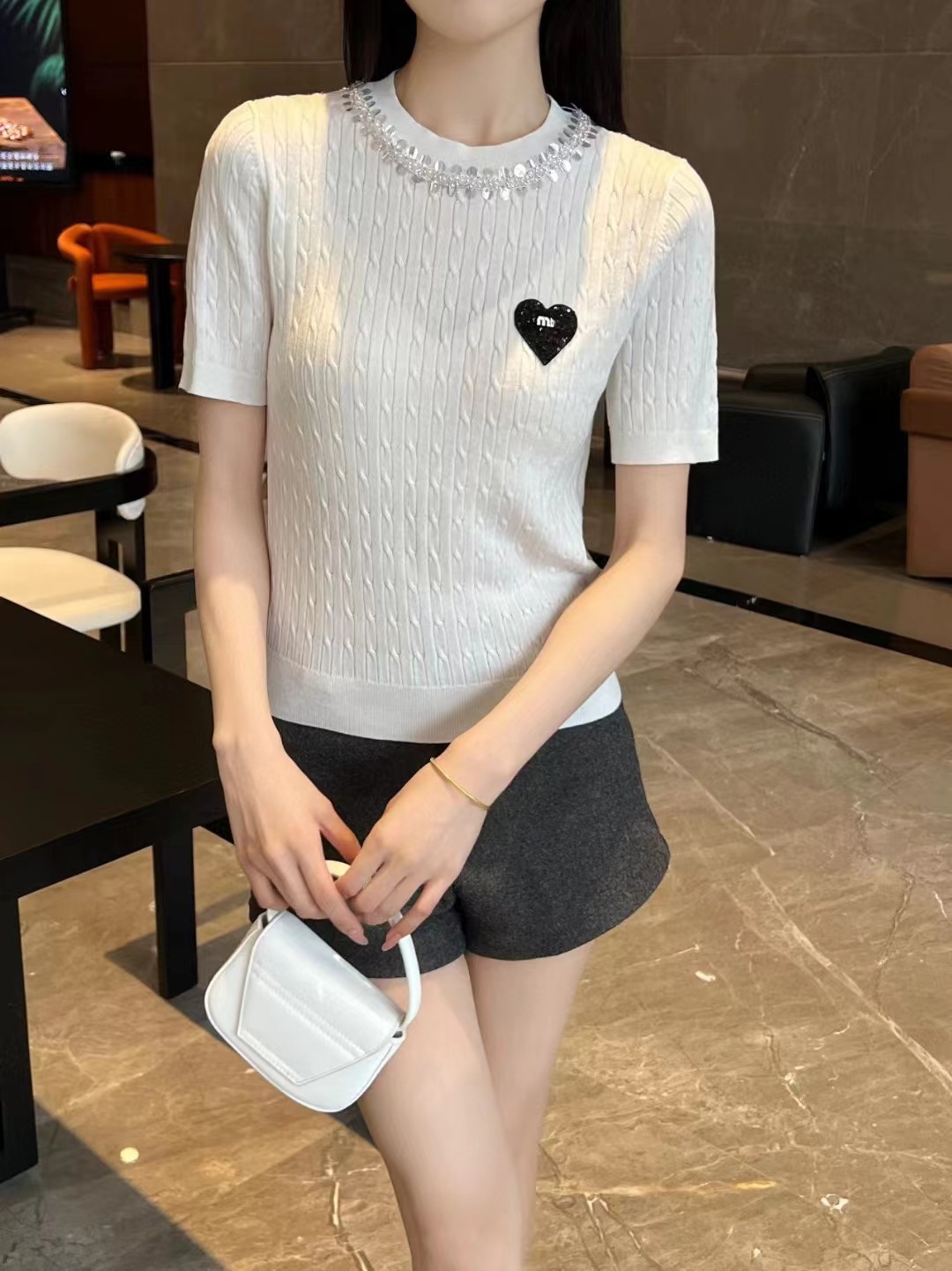 Gao Ding Meow Meow Home 24 Years Summer New Sequin Knitted Shirt Twists Short Sleeve Girl Age-reducing Breathable Thin Jacket for Women