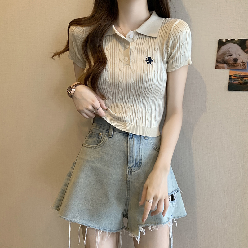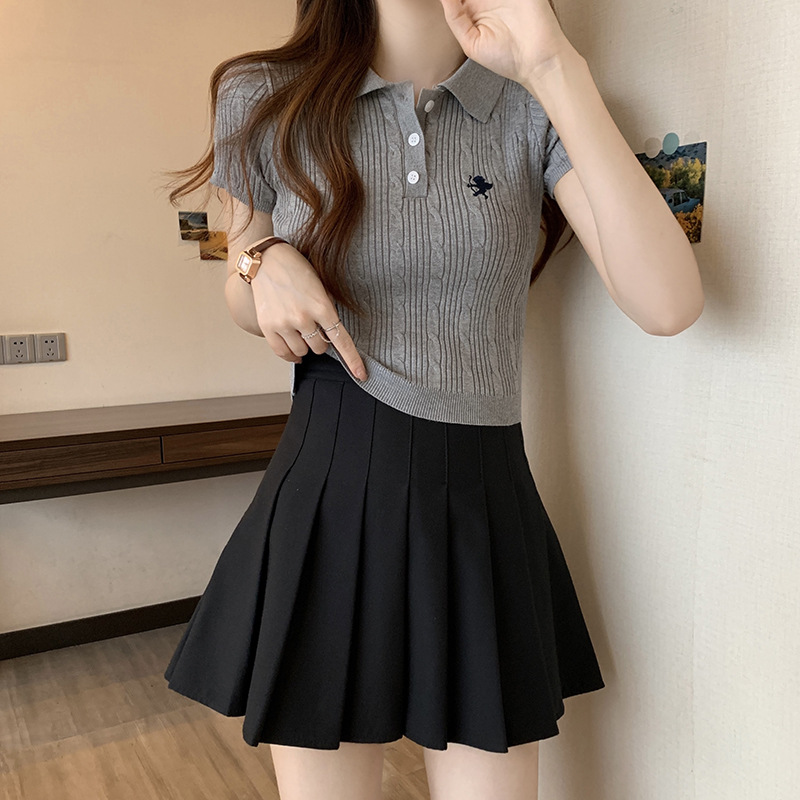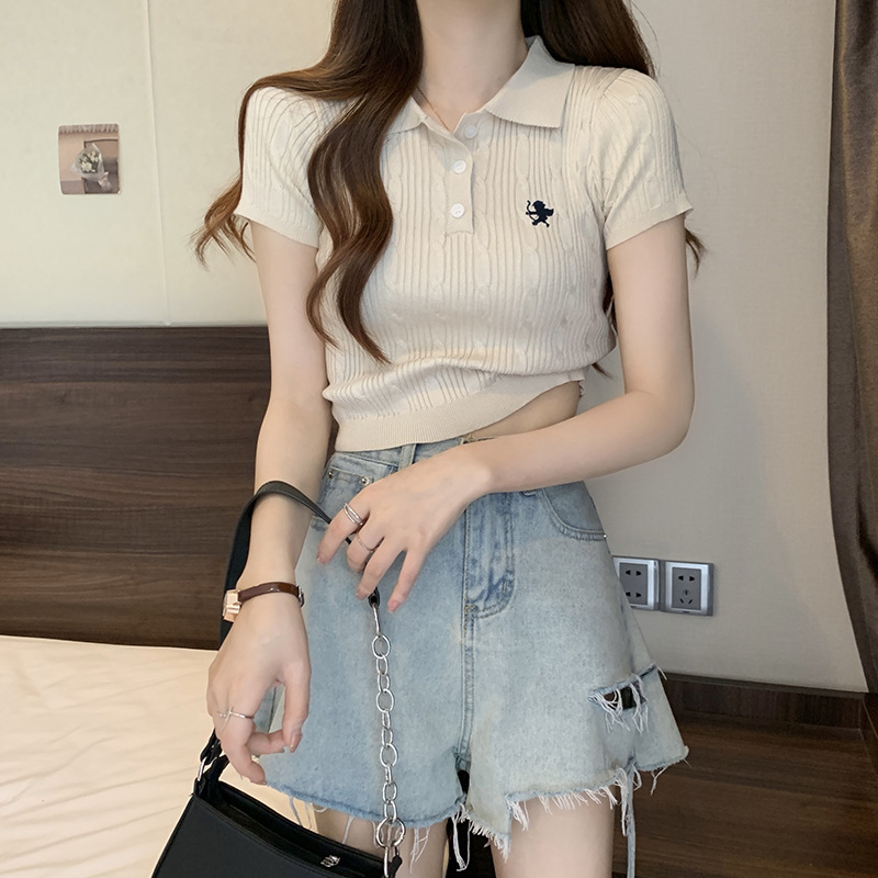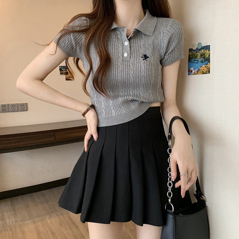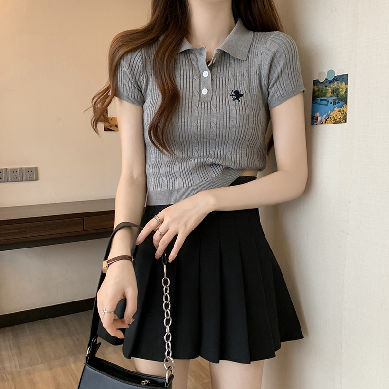 Chic Sweet and Spicy Summer French Niche Fashion Polo Collar Knitted Shirt Short Sleeve T-Shirt Women's Short Slimming Top