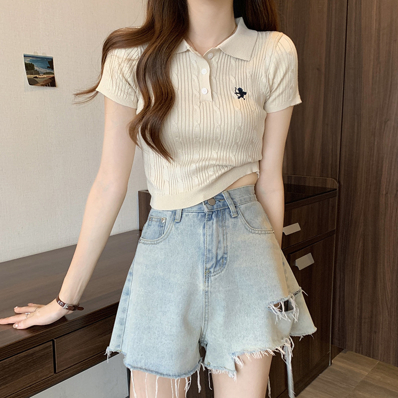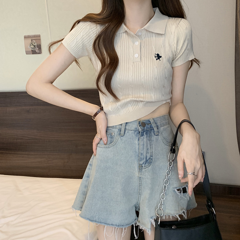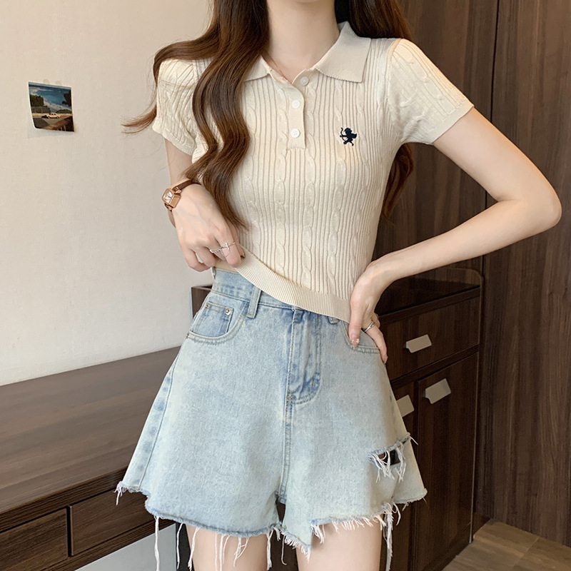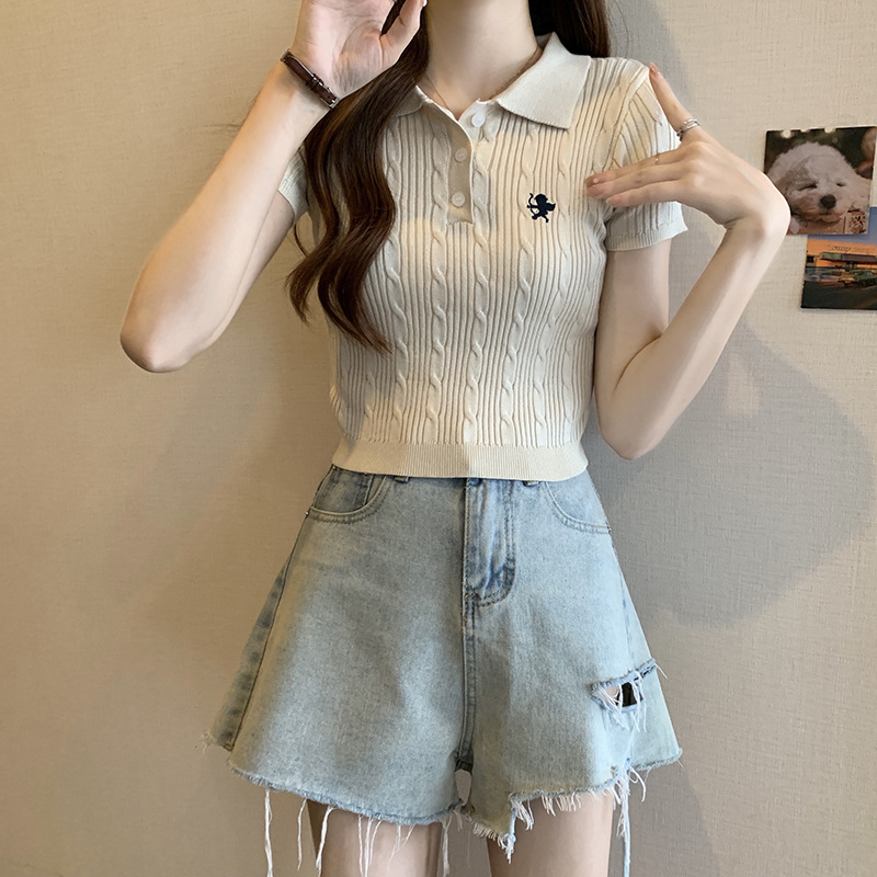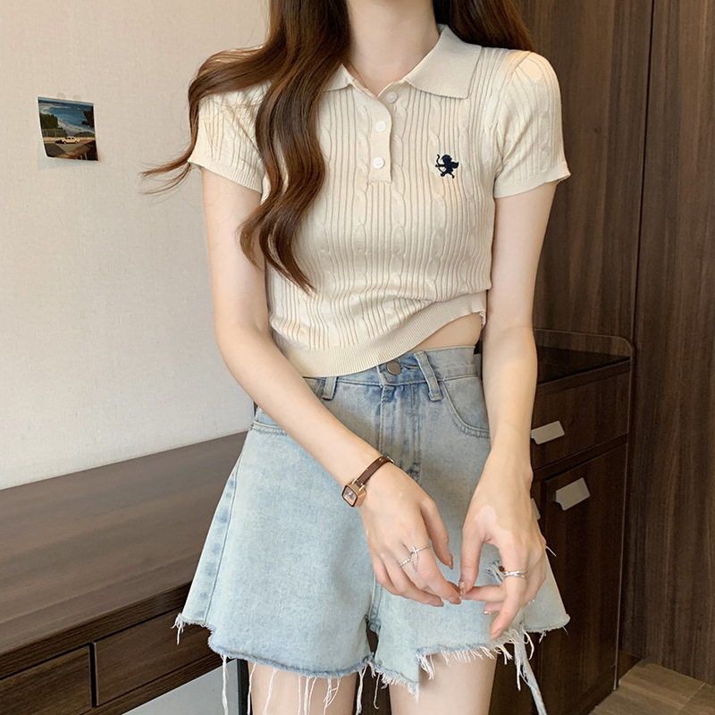 Chic Sweet and Spicy Summer French Niche Fashion Polo Collar Knitted Shirt Short Sleeve T-Shirt Women's Short Slimming Top