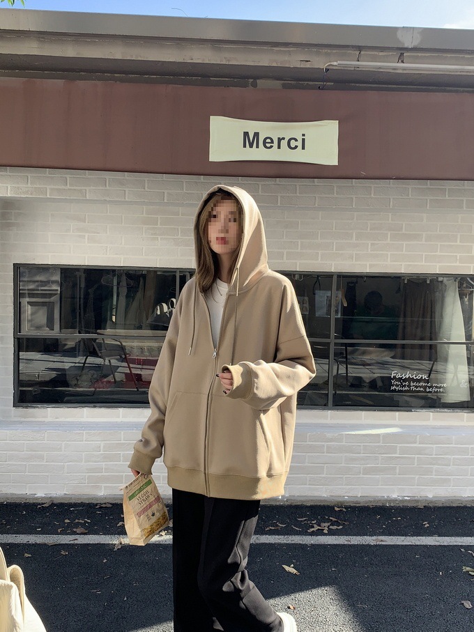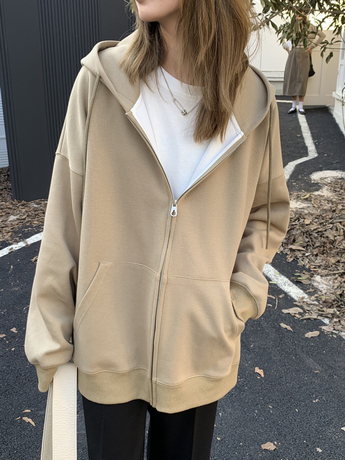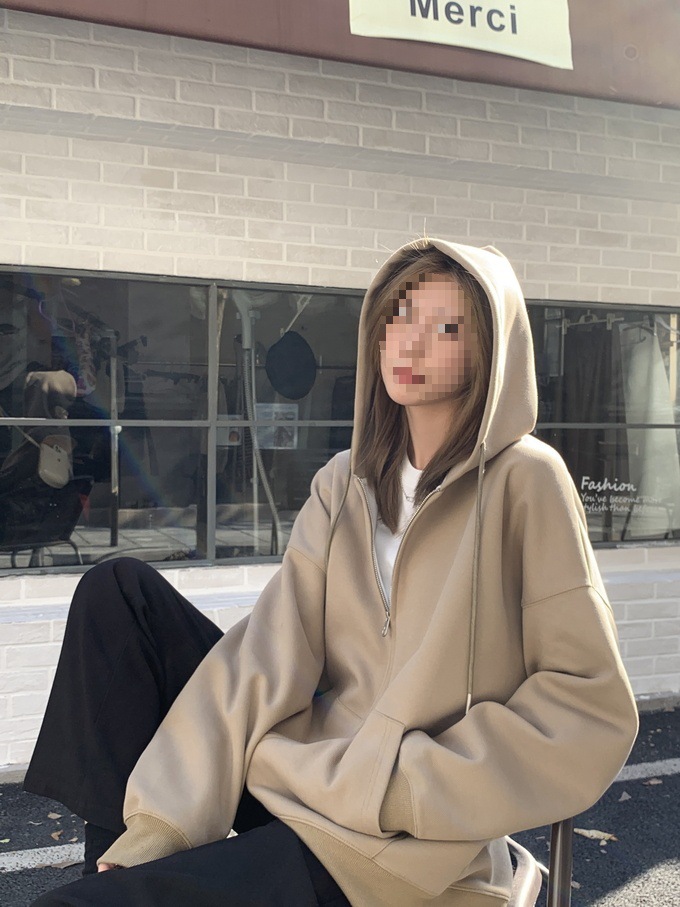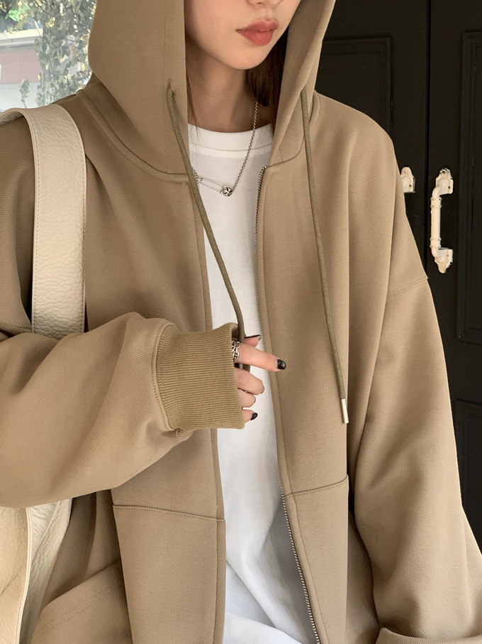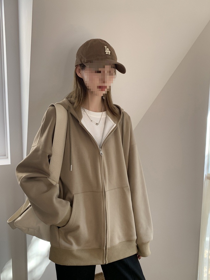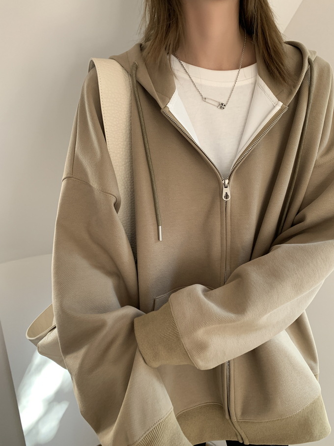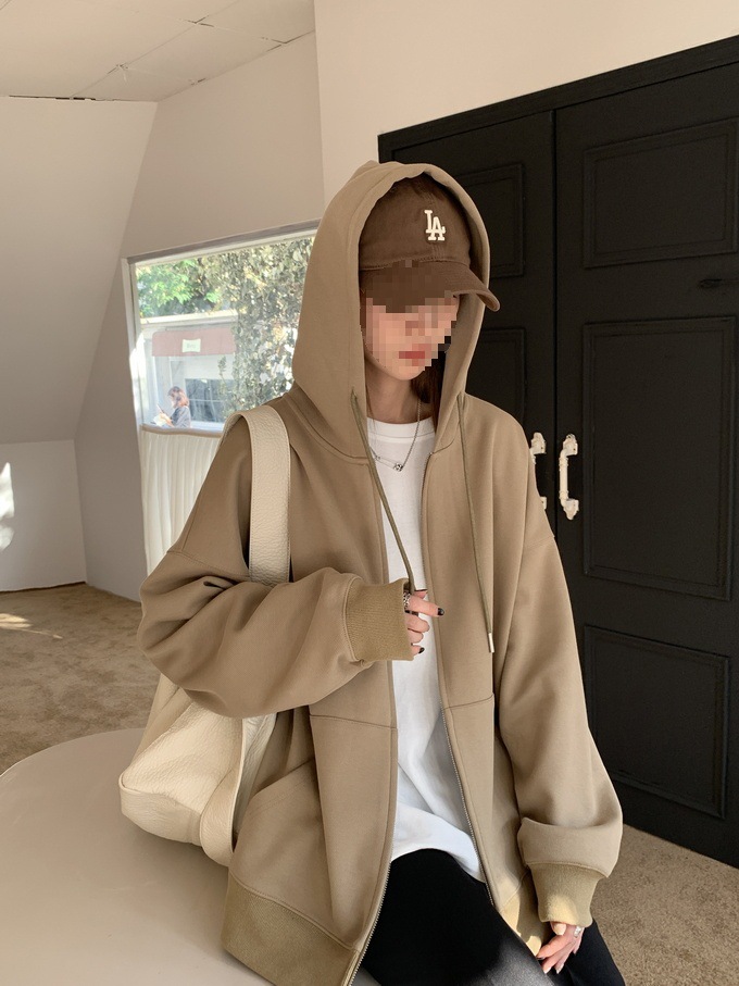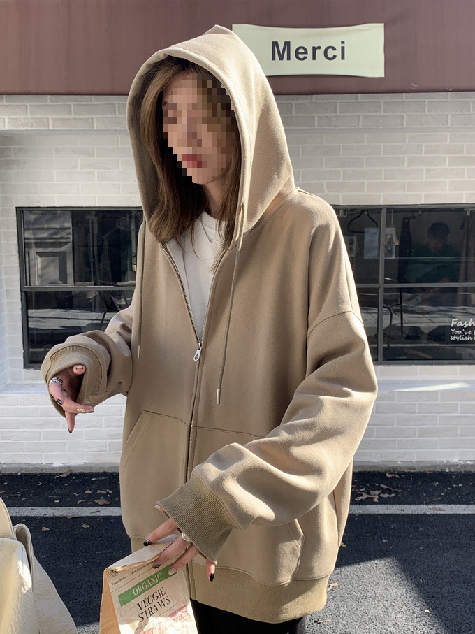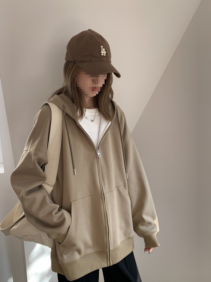 Ayihe lazy sweater women's spring and autumn hooded loose fleece-lined khaki zipper casual cardigan jacket