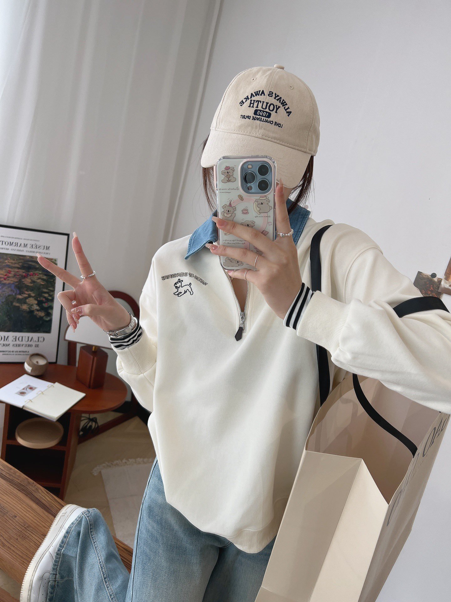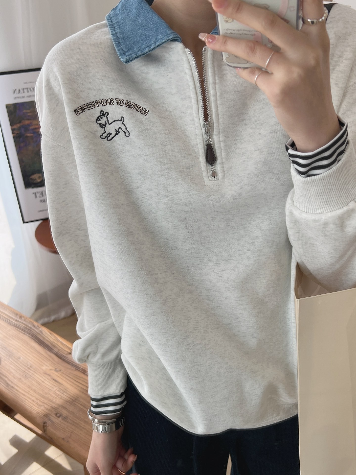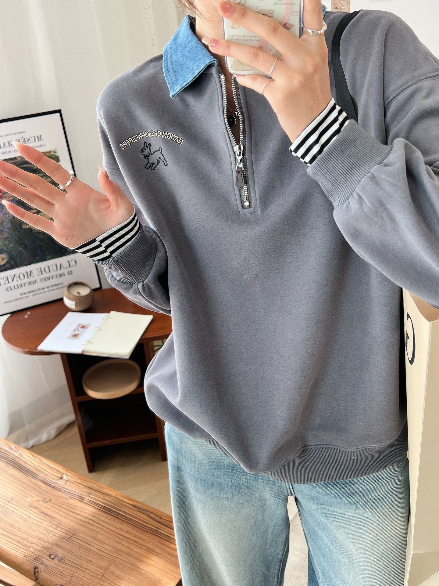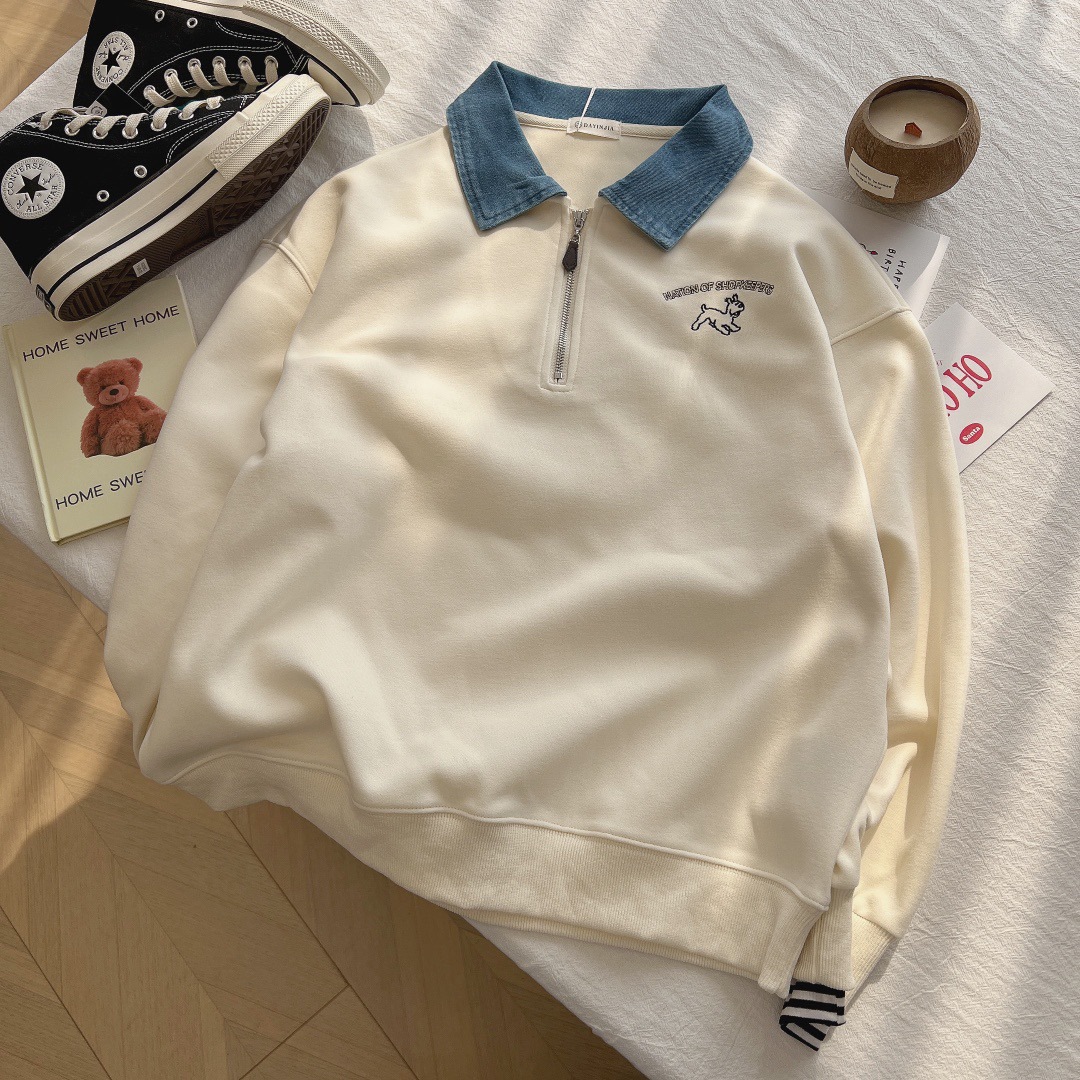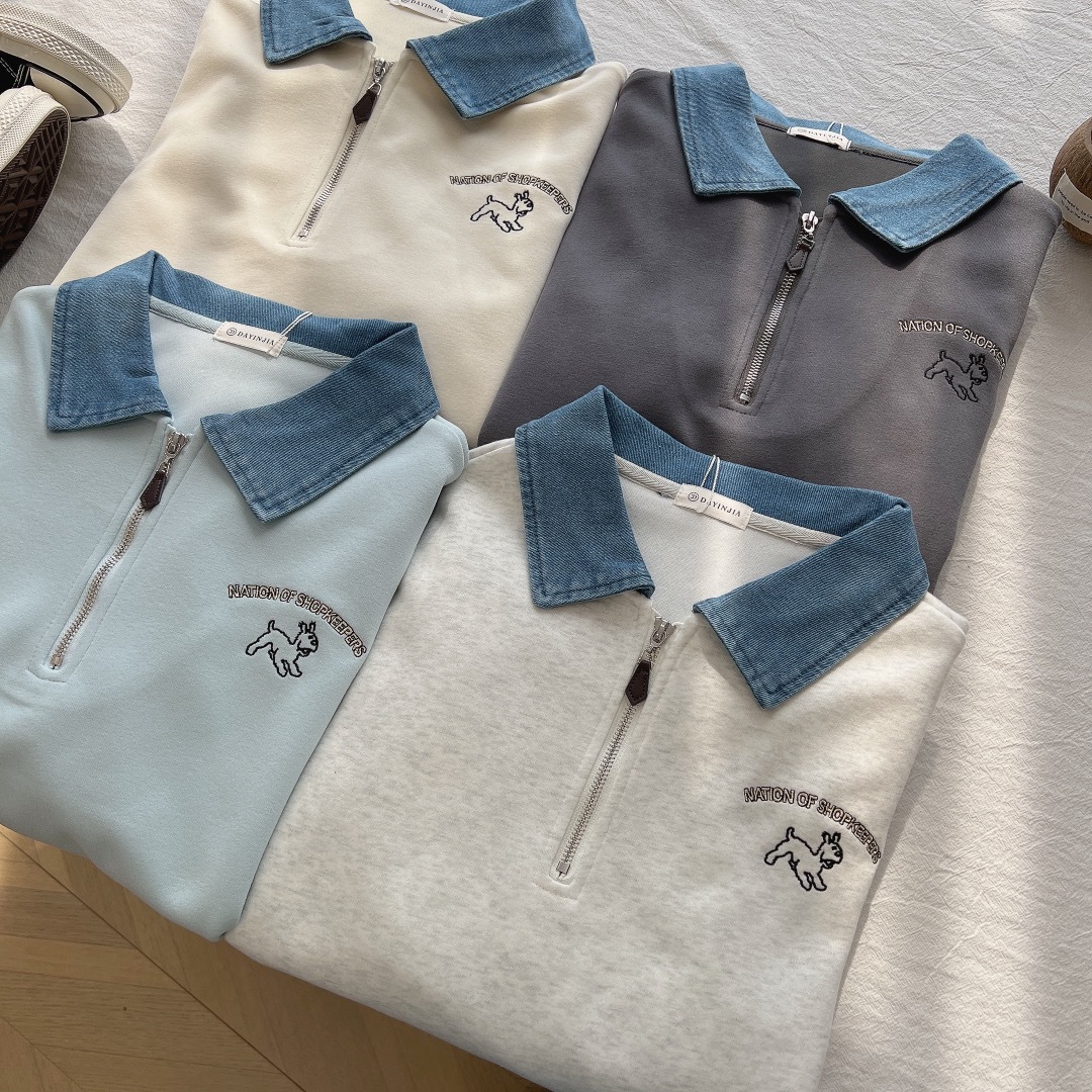 24 years new female puppy cartoon embroidered half zipper contrast color Denim lapel sweater college style slimming long sleeve
