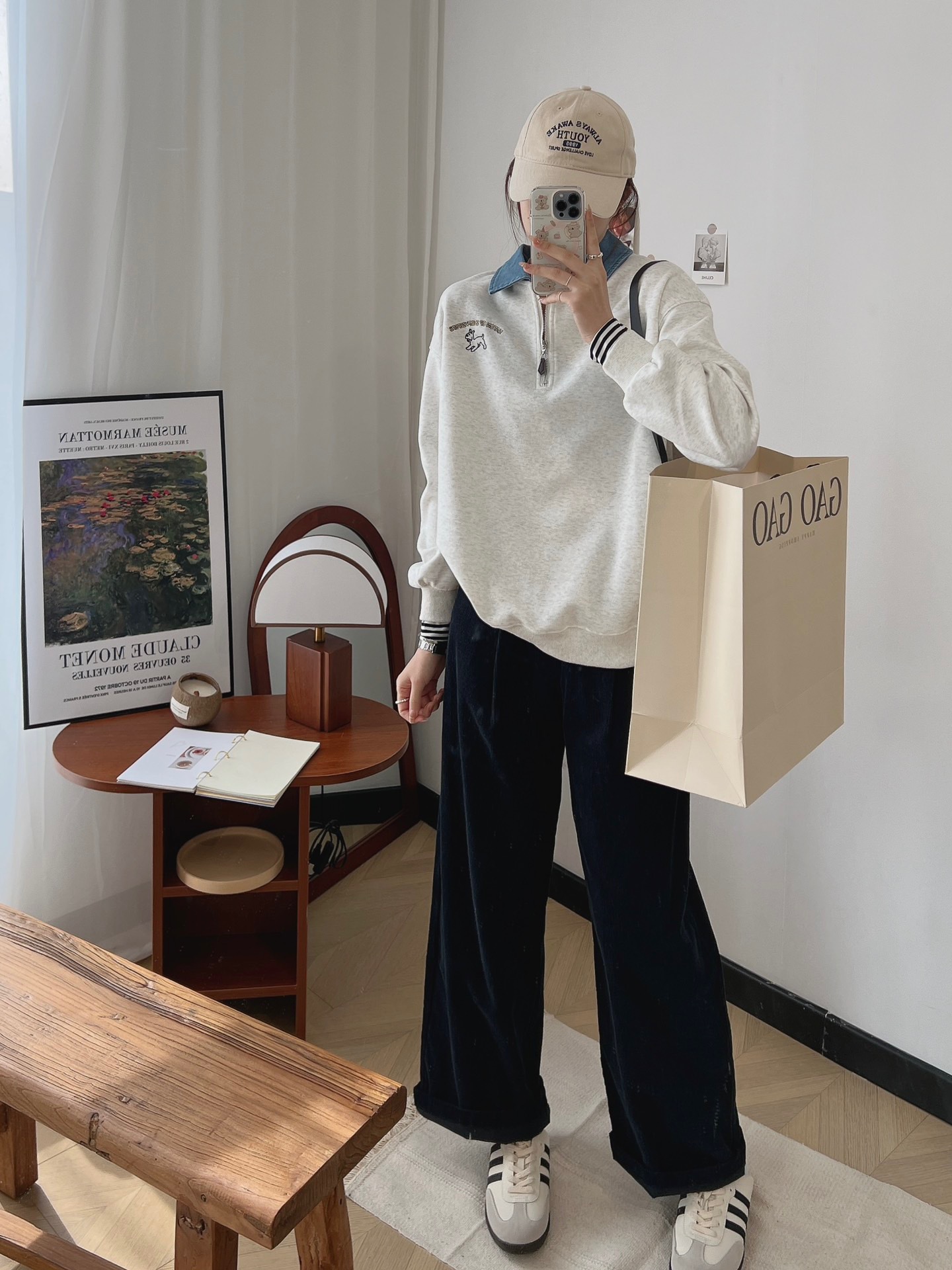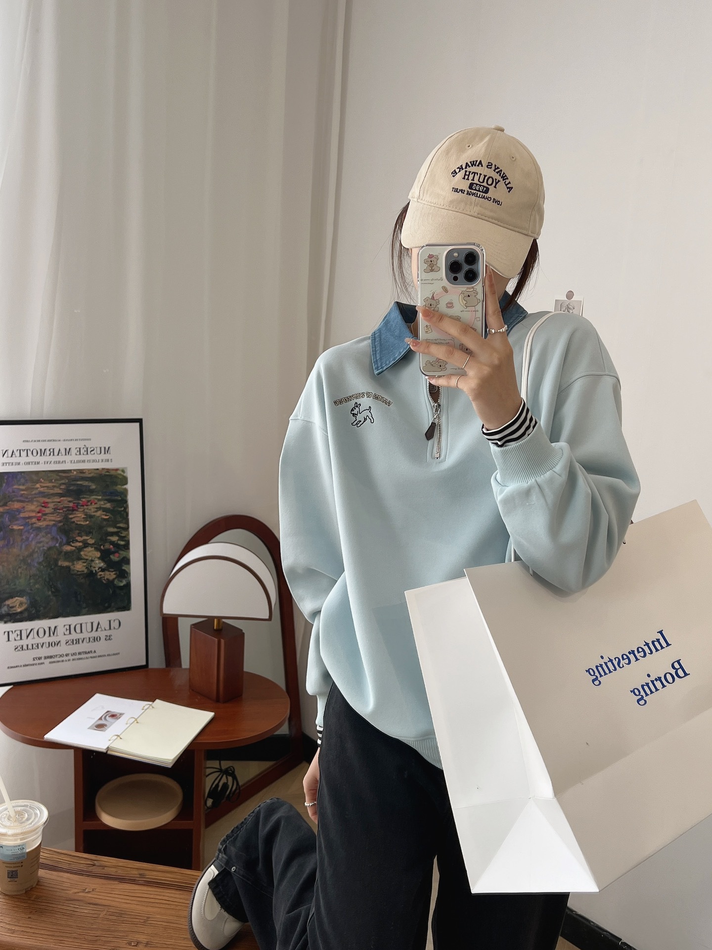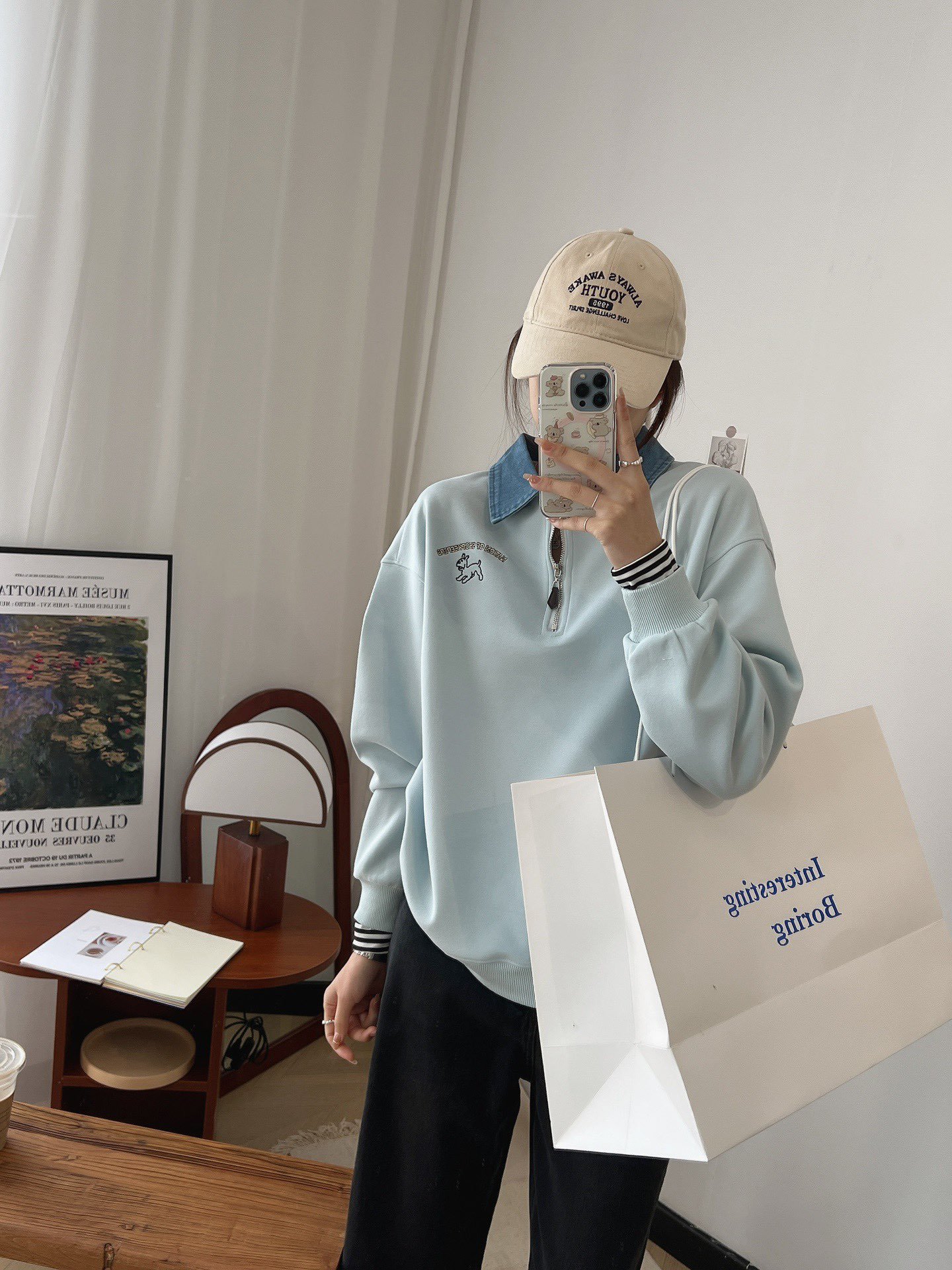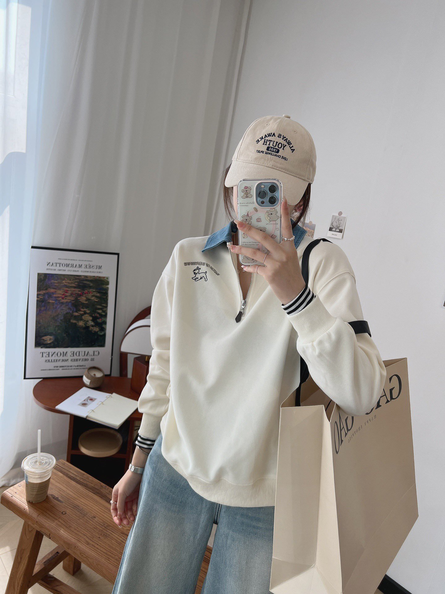 24 years new female puppy cartoon embroidered half zipper contrast color Denim lapel sweater college style slimming long sleeve