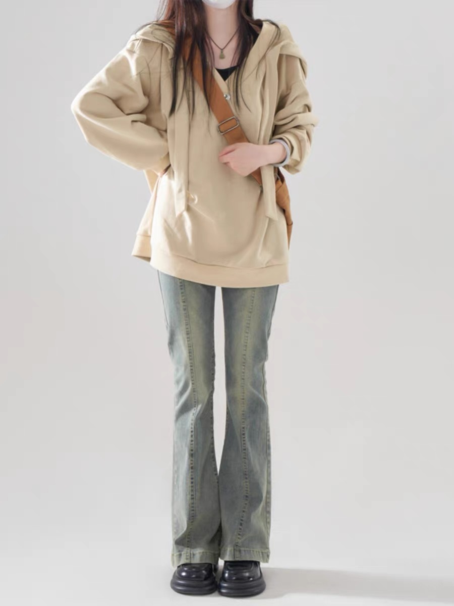 Large Size Chubby Girl American Style Lazy Style Casual Khaki Sweatshirt Women's Autumn New Loose Fake Two-piece Hooded Sweatshirt