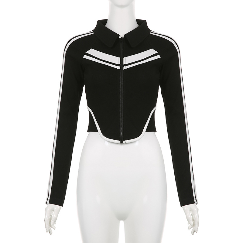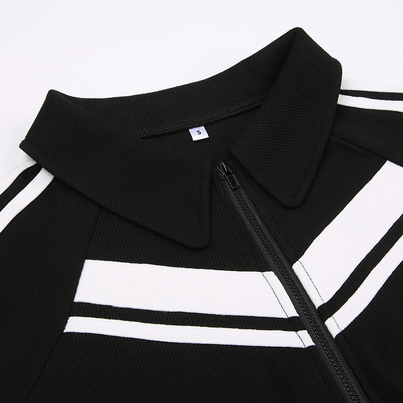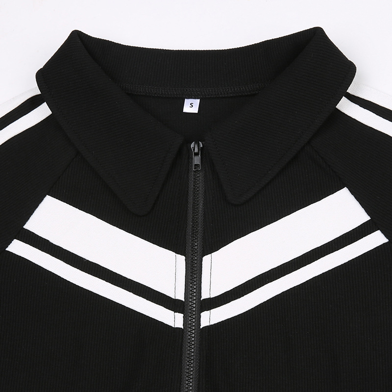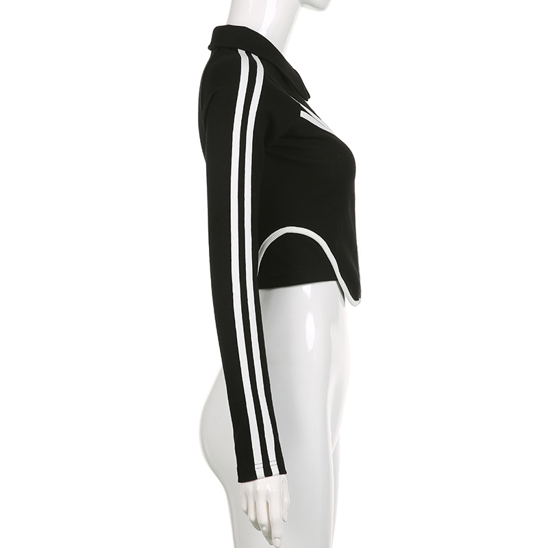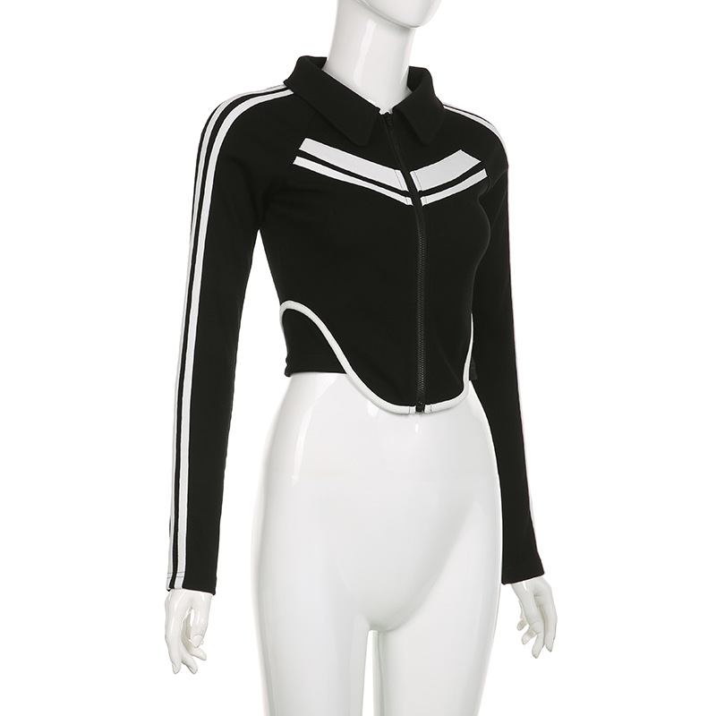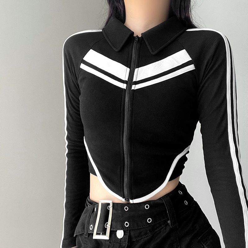 European and American Motorcycle Style Color Ribbon Stitching Irregular Hem Long Sleeve Sweater Distinctive Lapel Sports Base Shirt