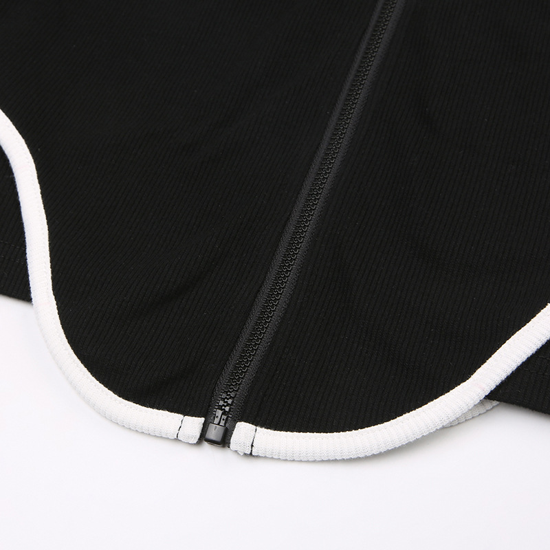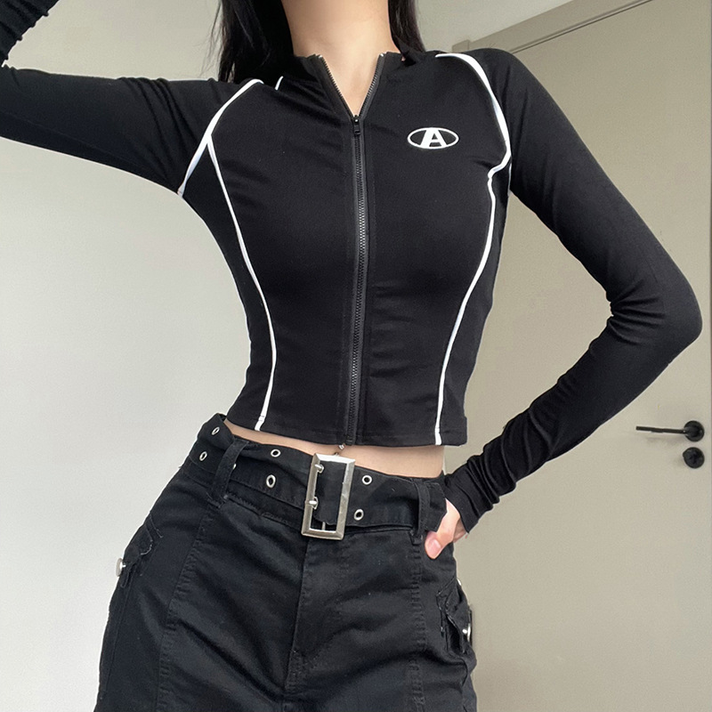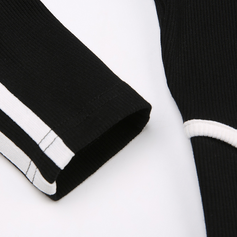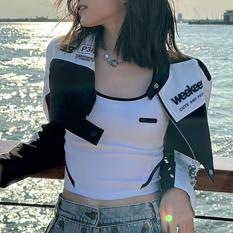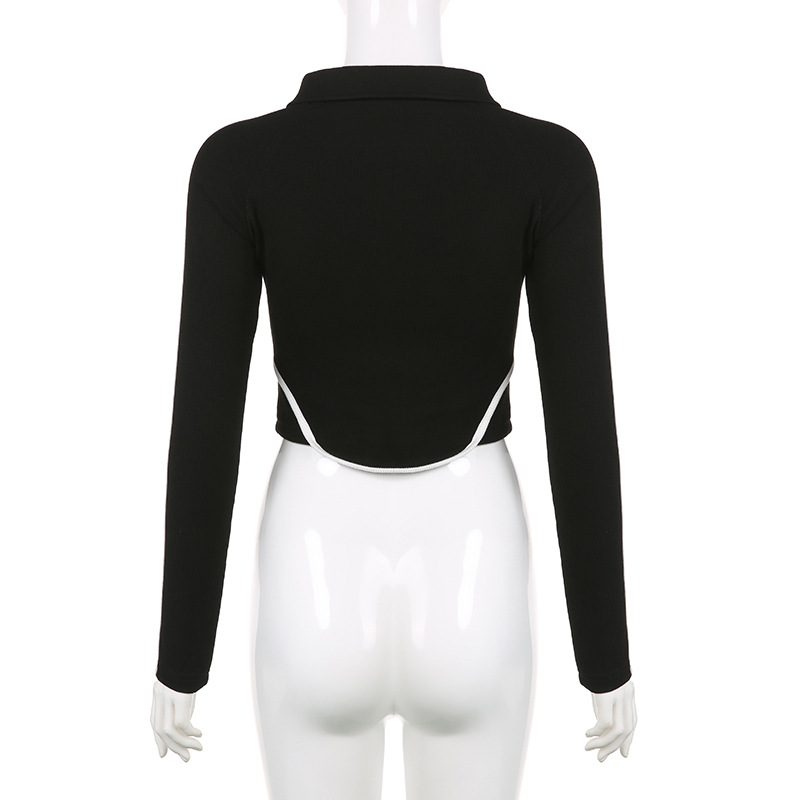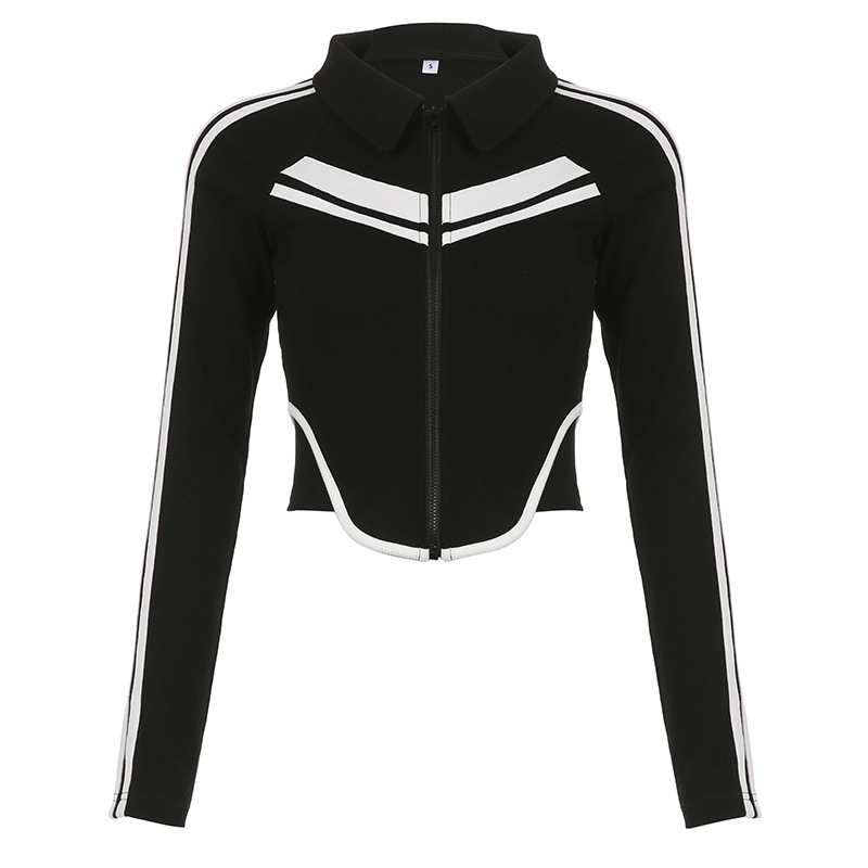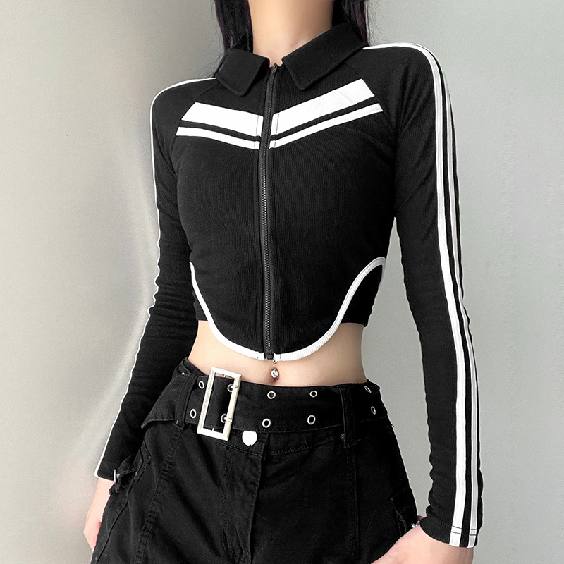 European and American Motorcycle Style Color Ribbon Stitching Irregular Hem Long Sleeve Sweater Distinctive Lapel Sports Base Shirt