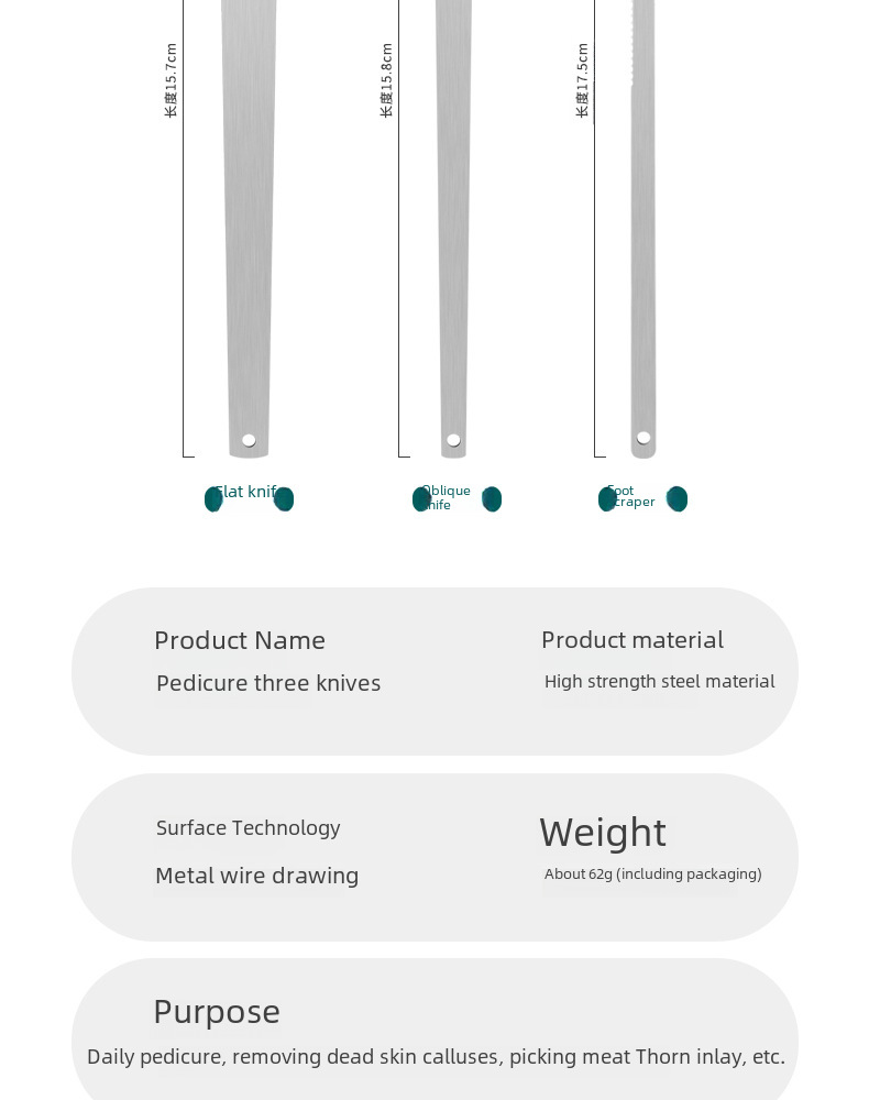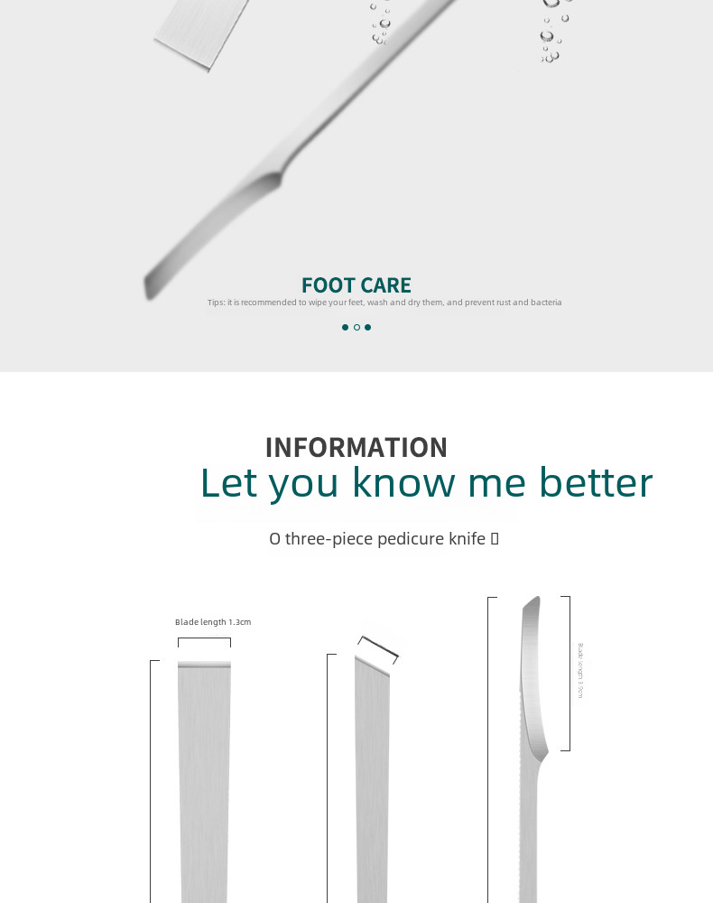 Three-Tool Set:The kit includes three essential foot care tools, providing a complete solution for your foot care needs. These tools are designed to target specific areas, ensuring thorough and efficient care.