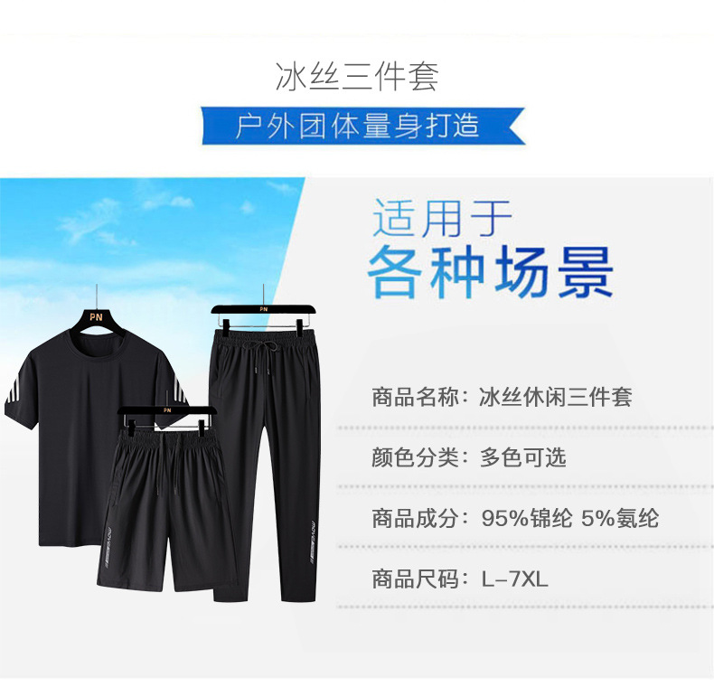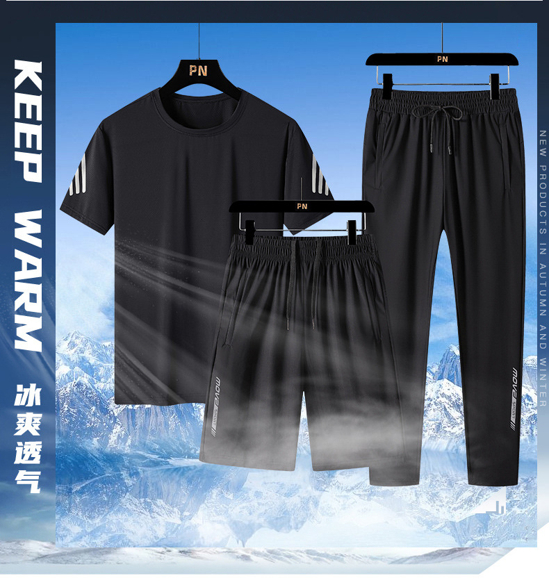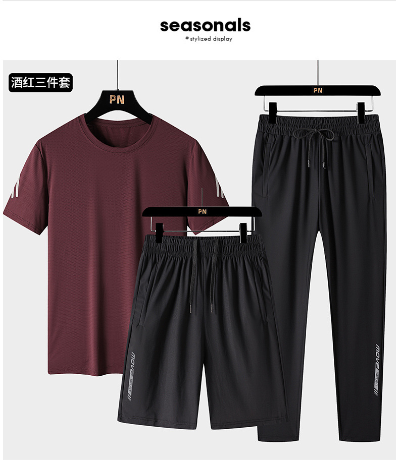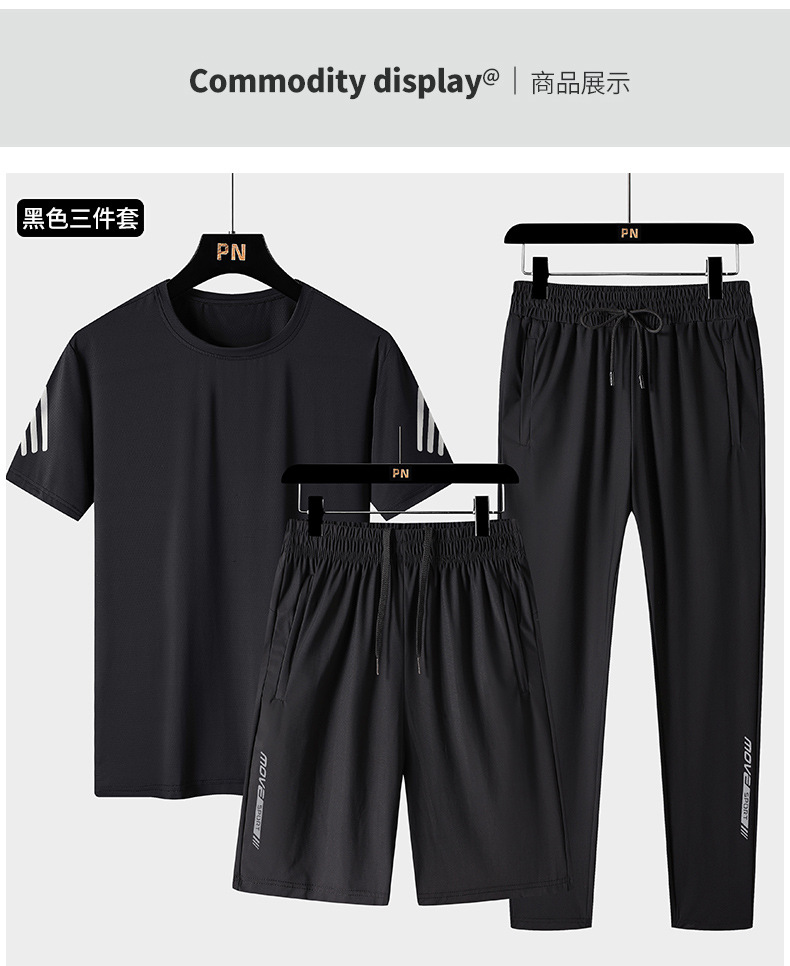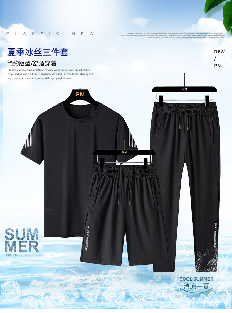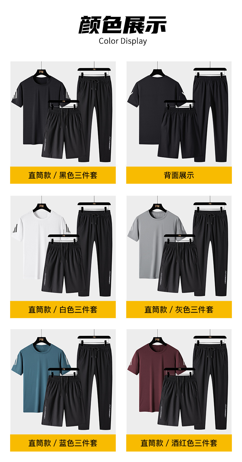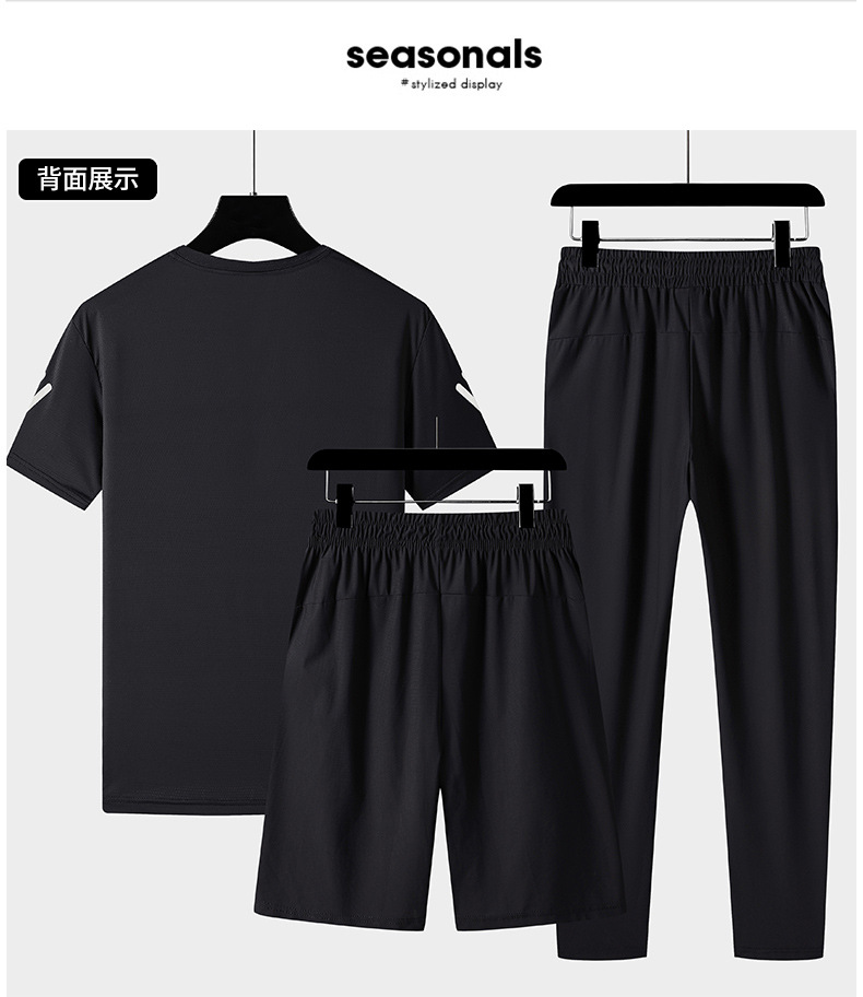 2024 Summer new pure cotton men's casual sports suit round neck loose T-shirt fifth pants trousers three pieces