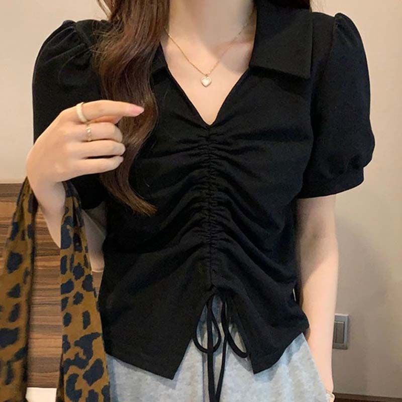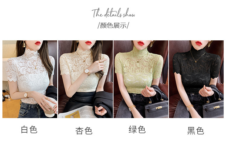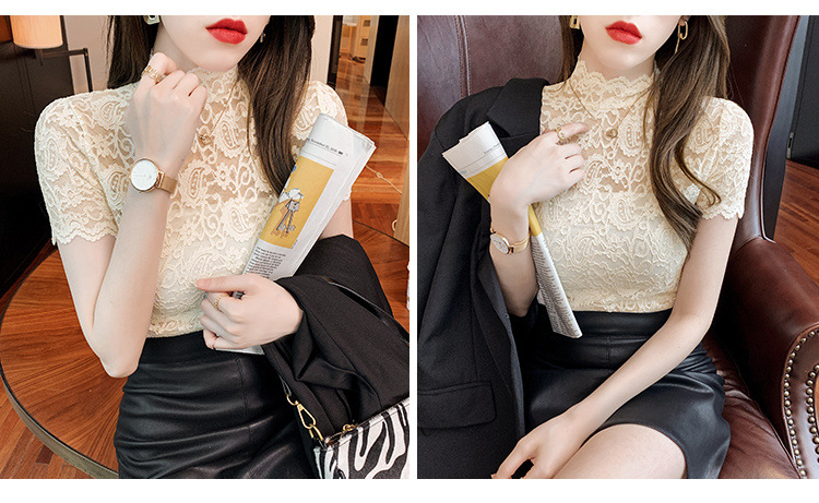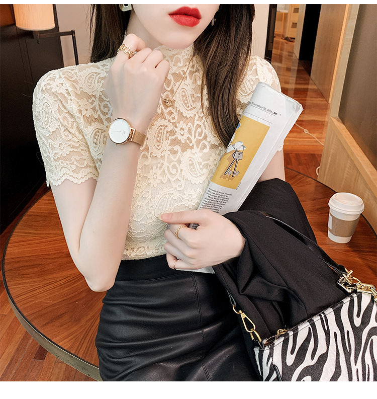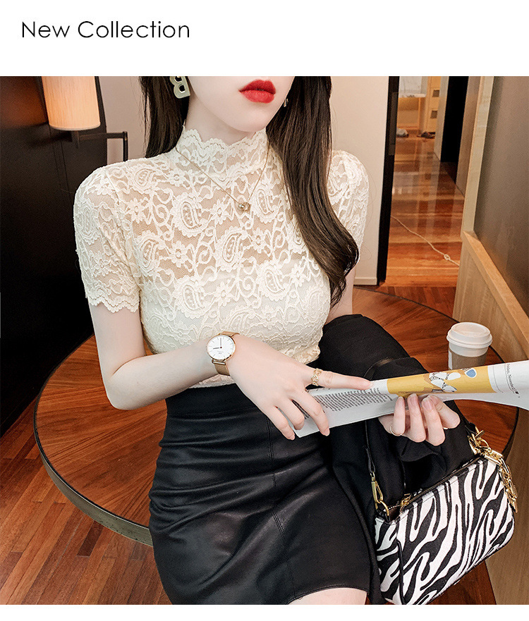 Sexy Hollow Lace Shirt Women's Short-sleeved Summer Wear Slimming Western Style Top All-match Half-high Collar Lace Base Shirt