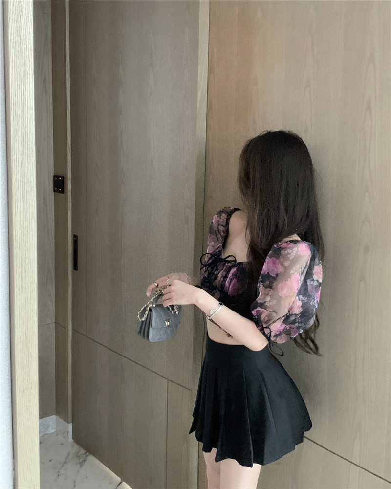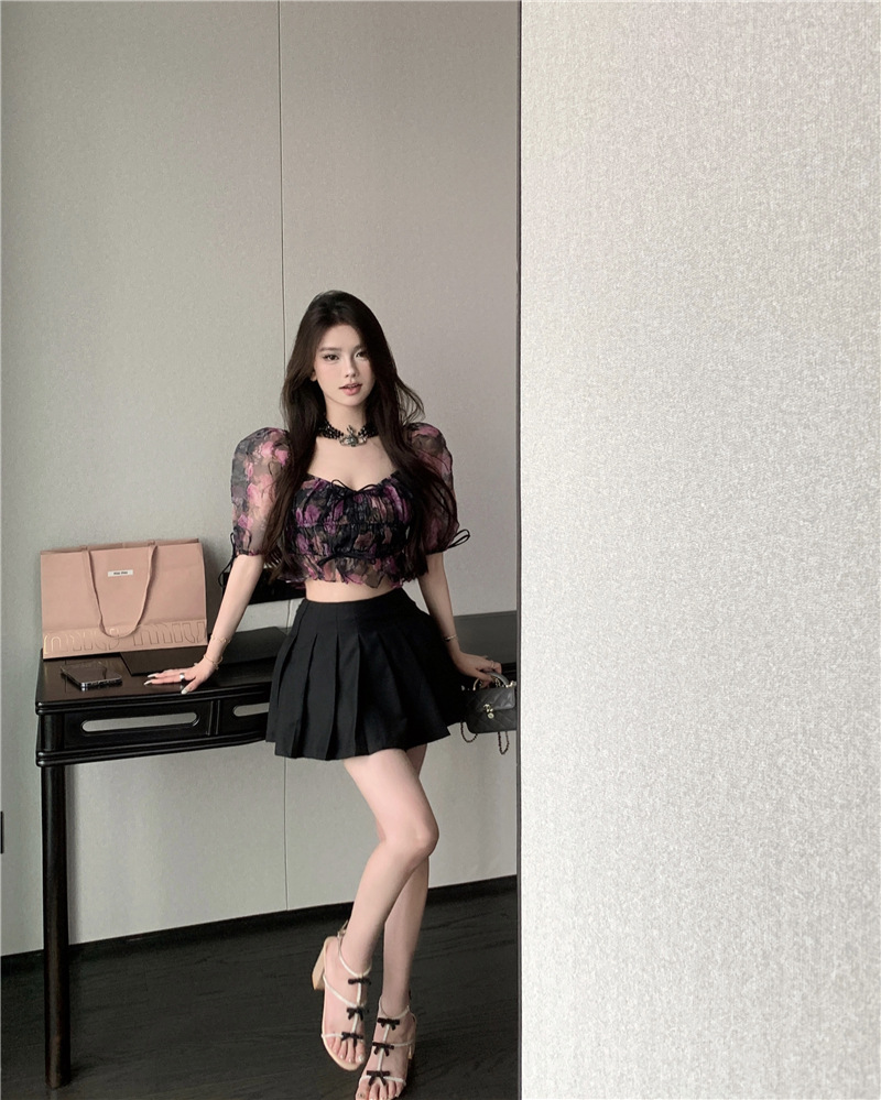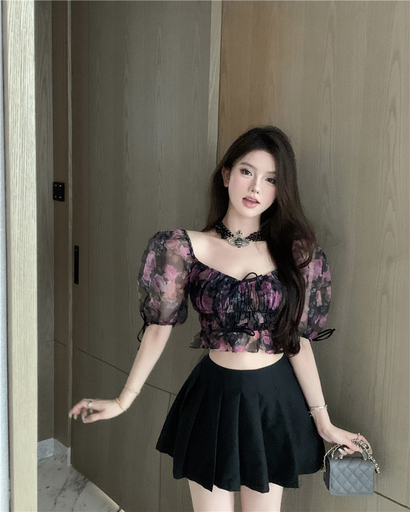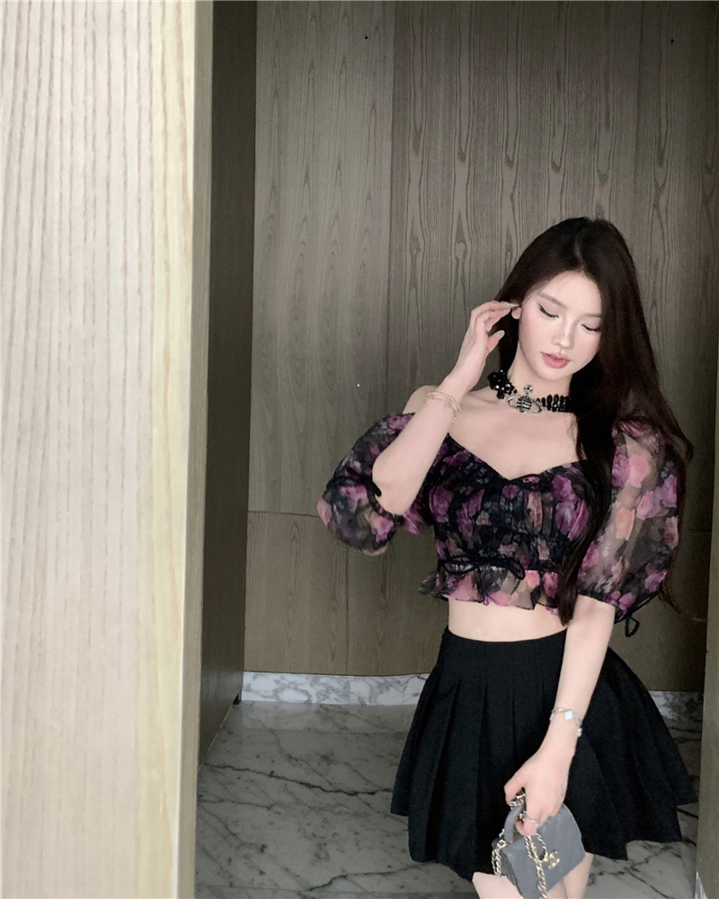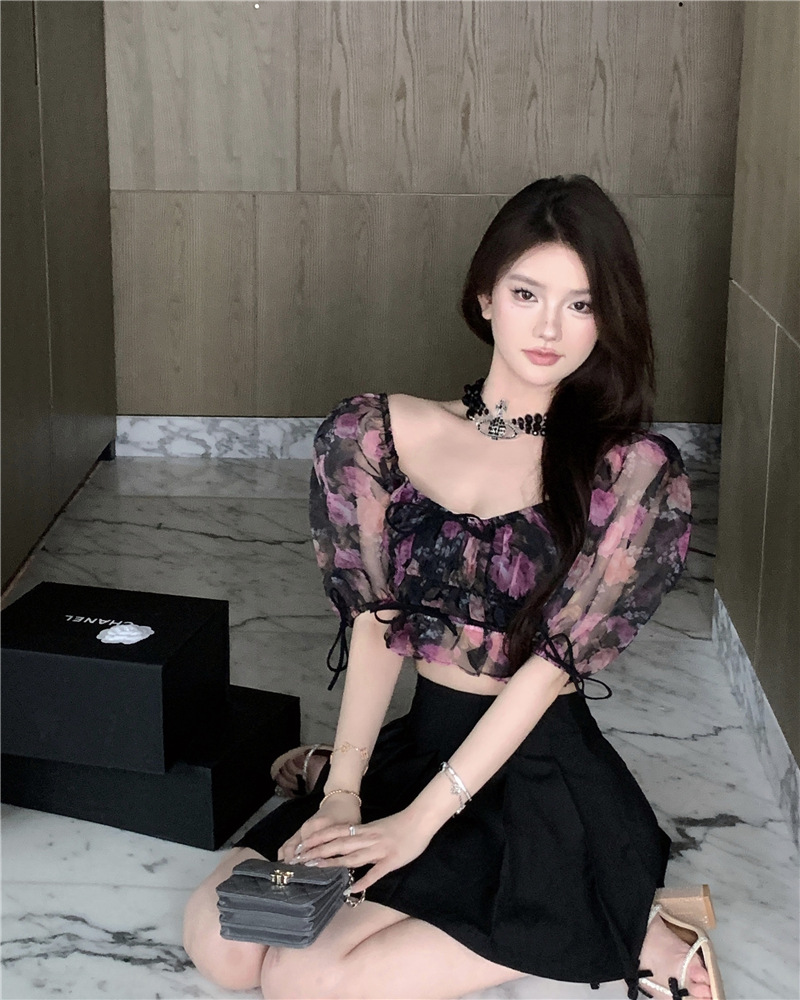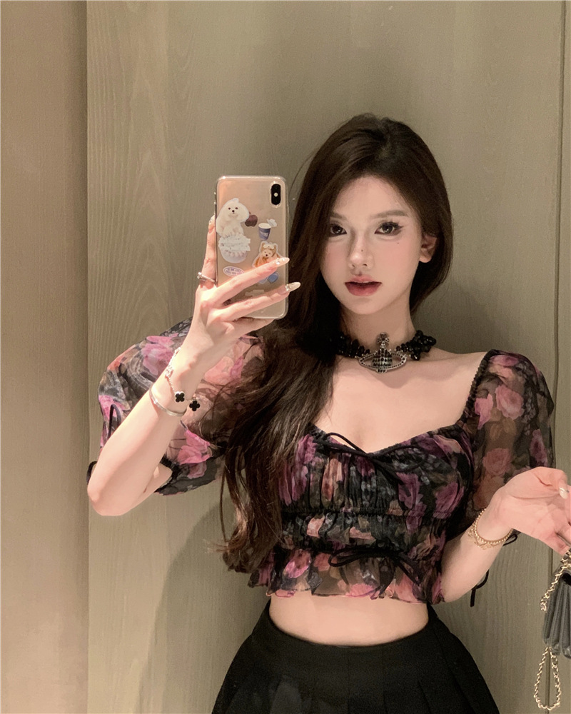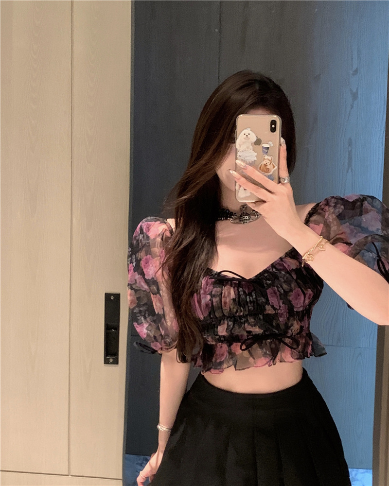 Pure sweet floral mesh top puff sleeve printed navel square collar short sleeve chiffon lace shirt for women 1419