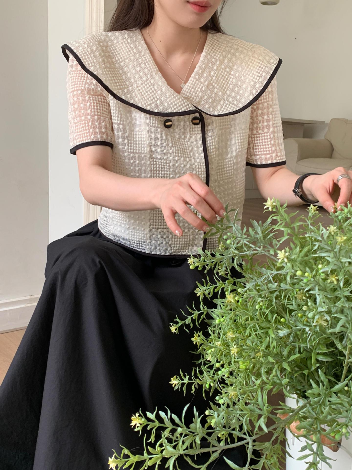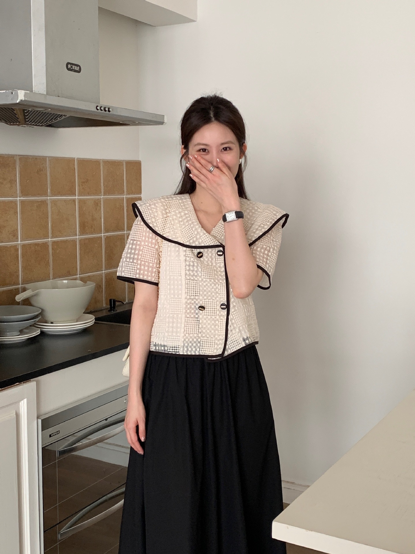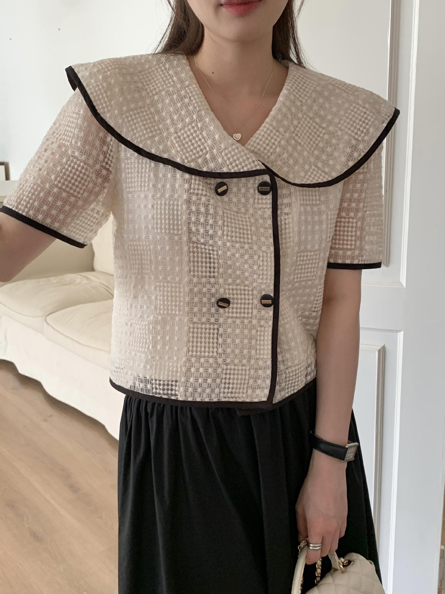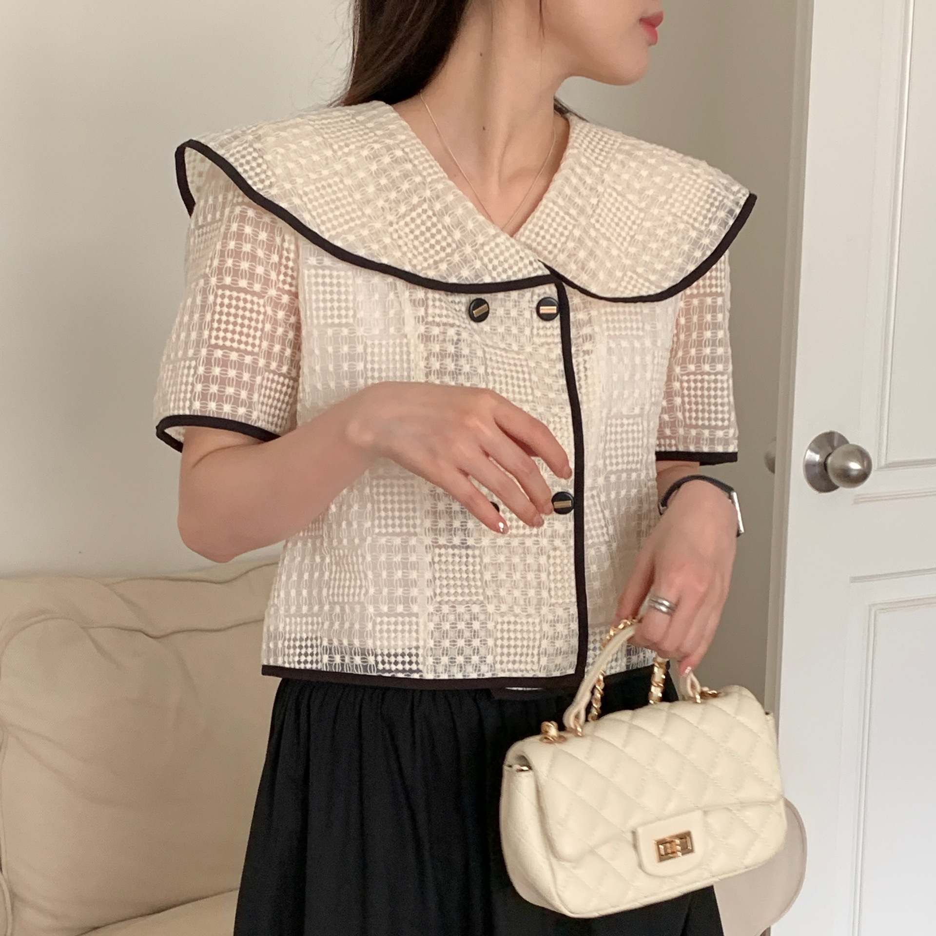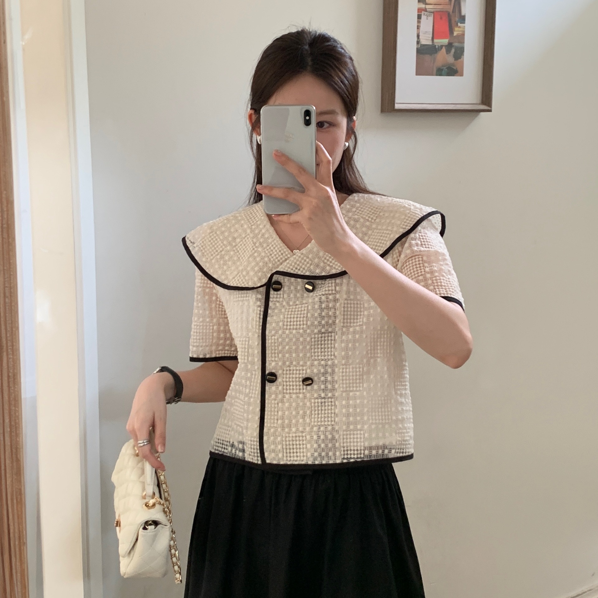 Real Shot Lace Contrast Lapel Age-reducing Double-breasted Shirt Women's Summer New Loose Short Top 63337