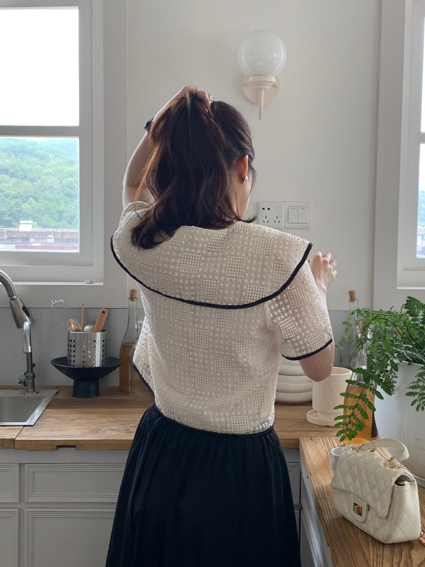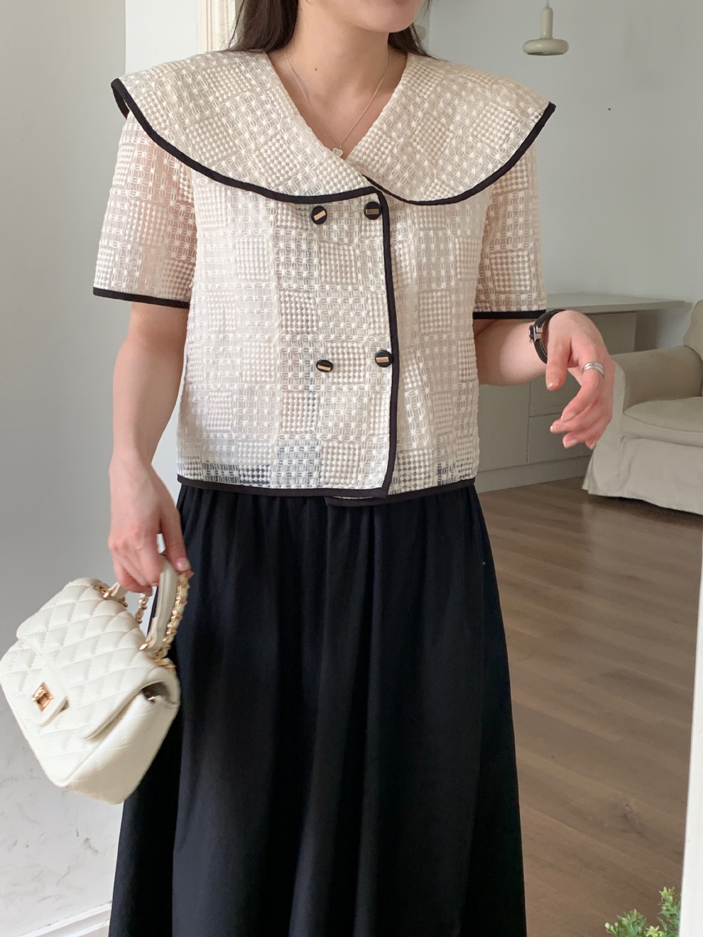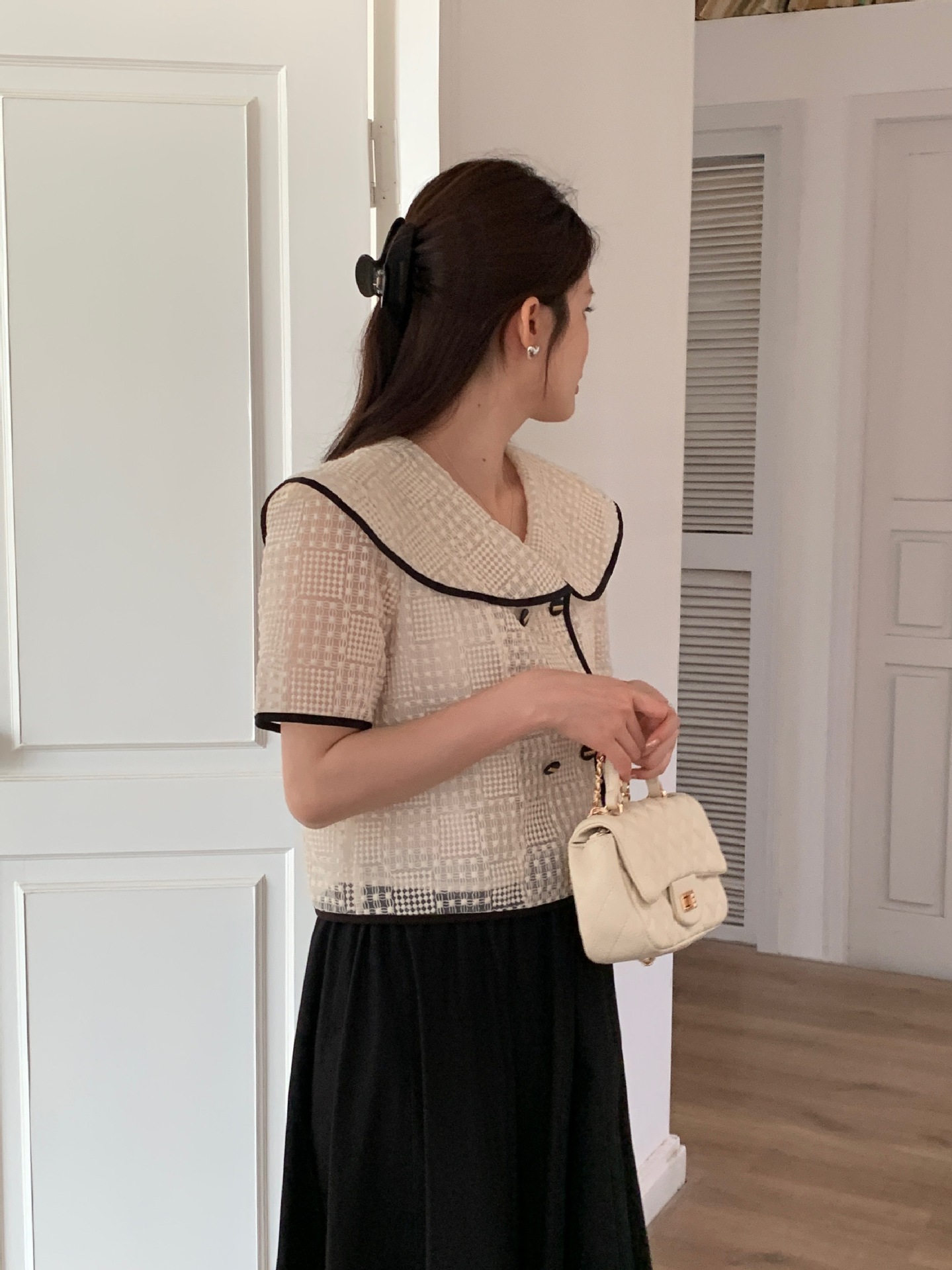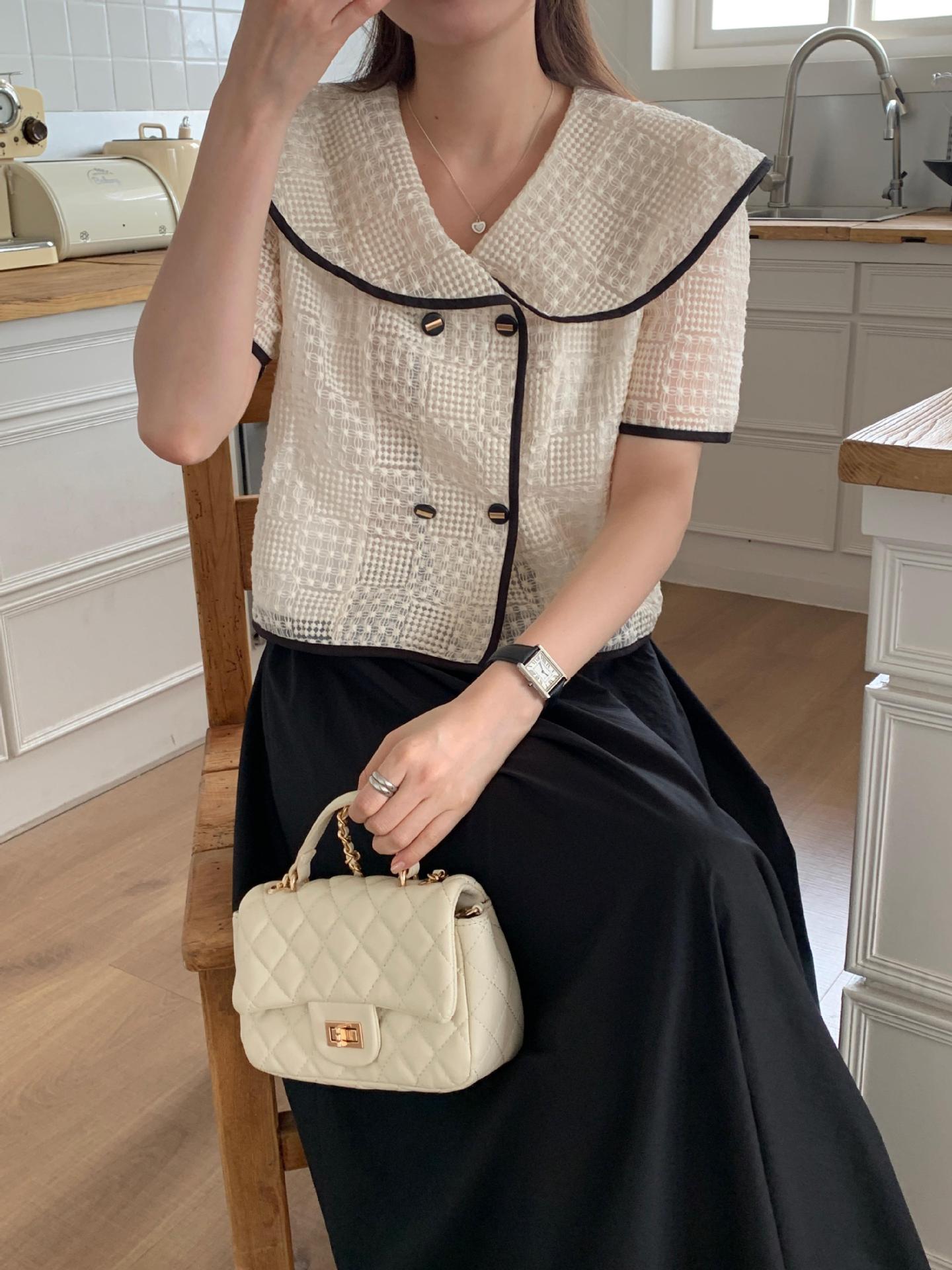 Real Shot Lace Contrast Lapel Age-reducing Double-breasted Shirt Women's Summer New Loose Short Top 63337