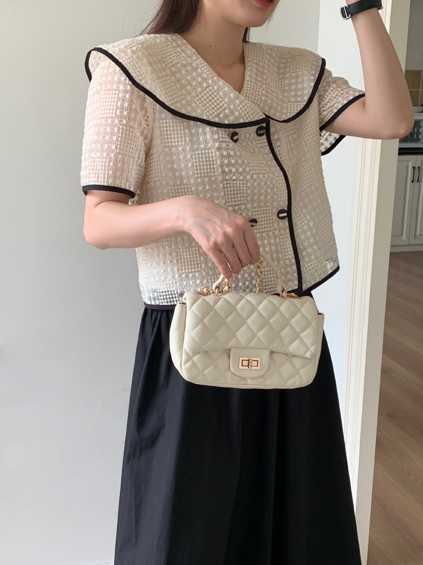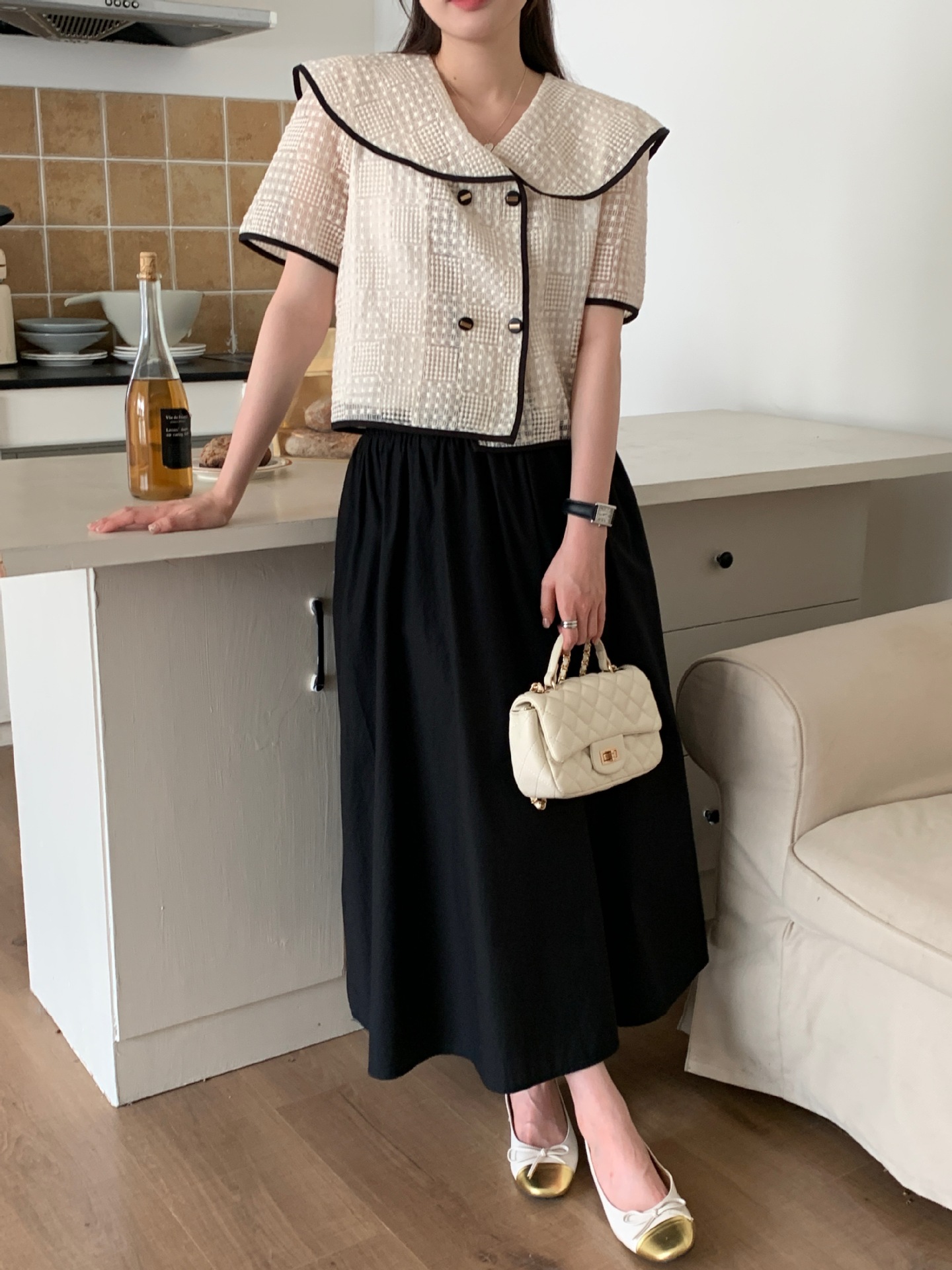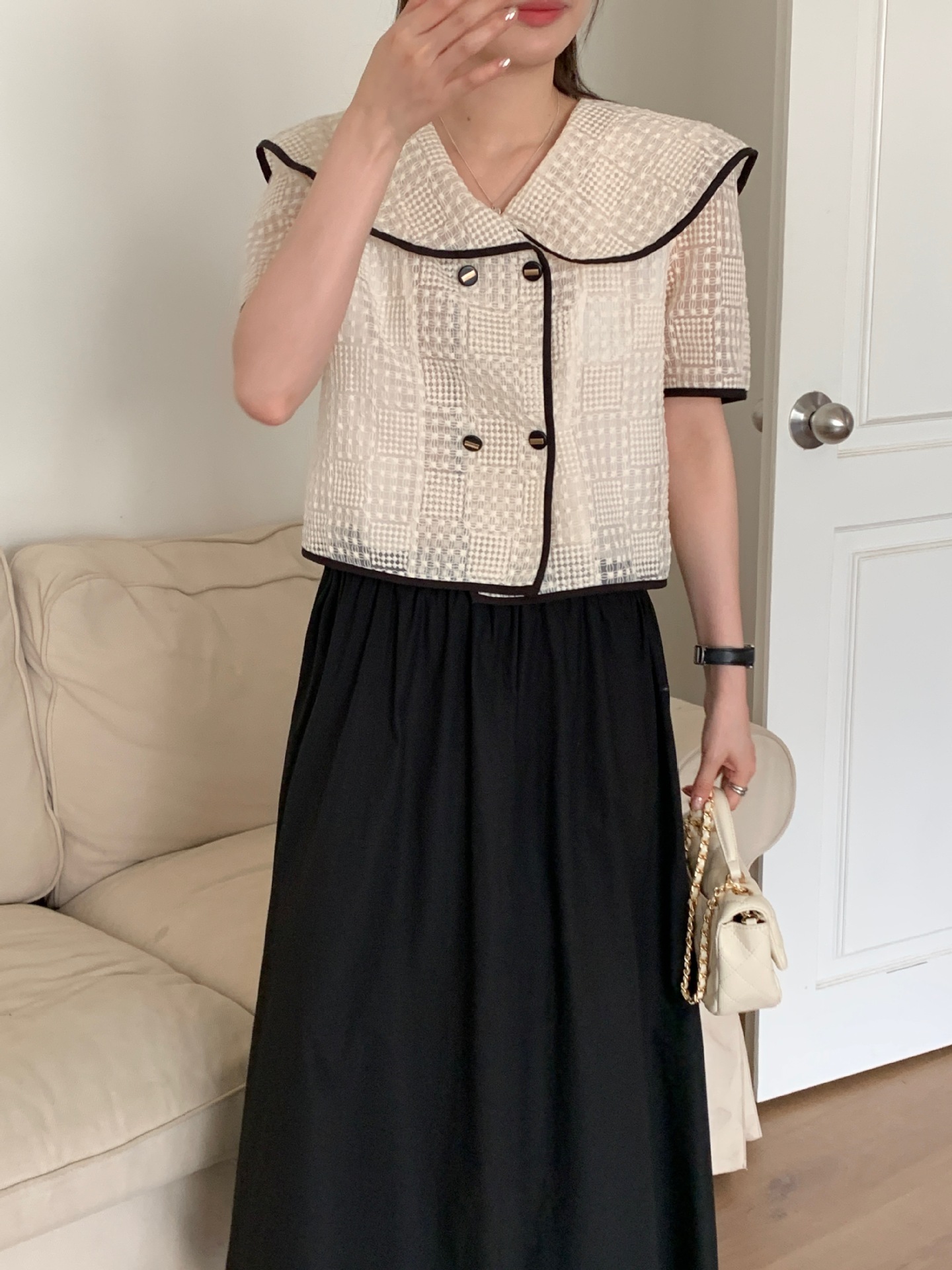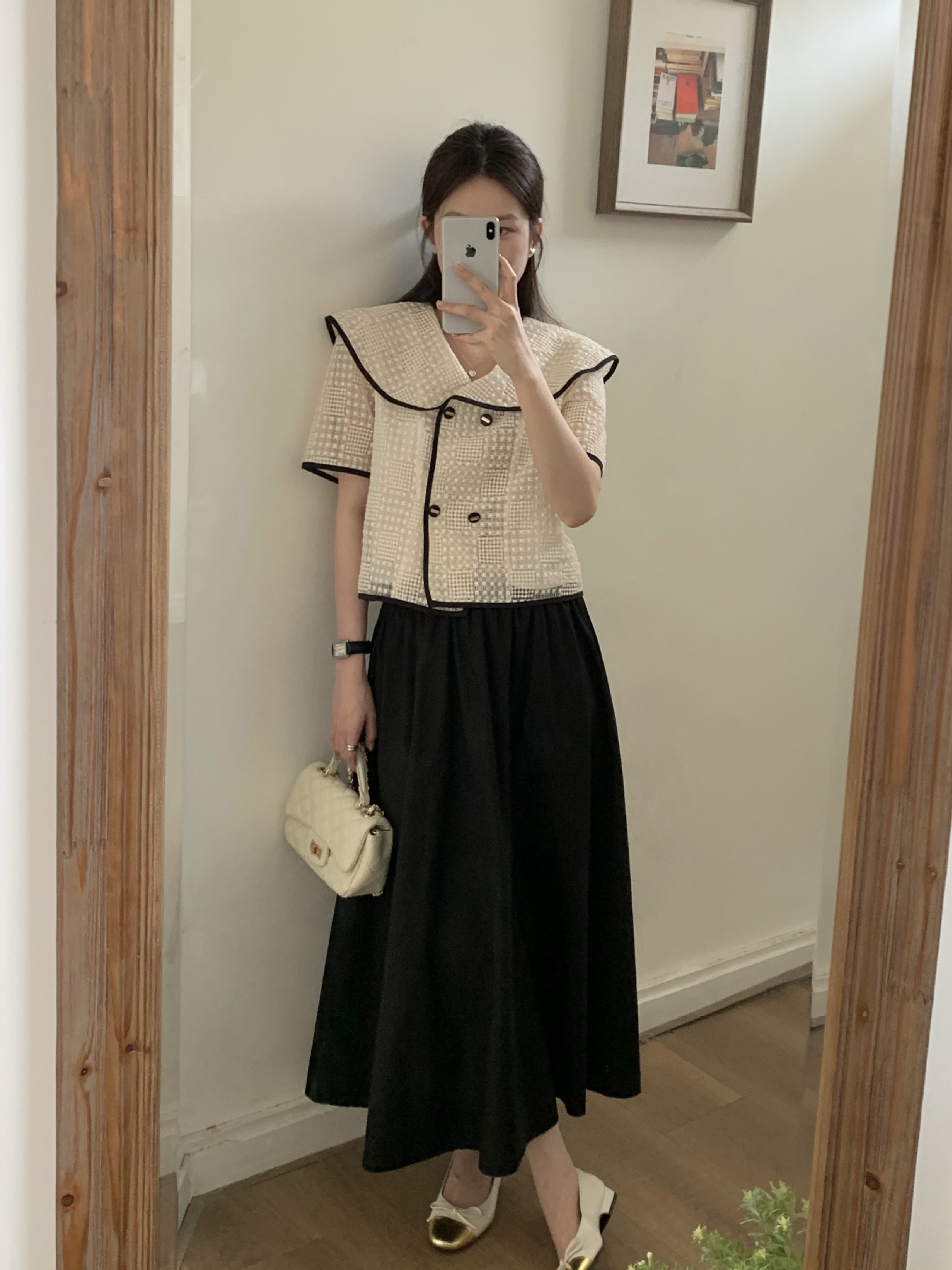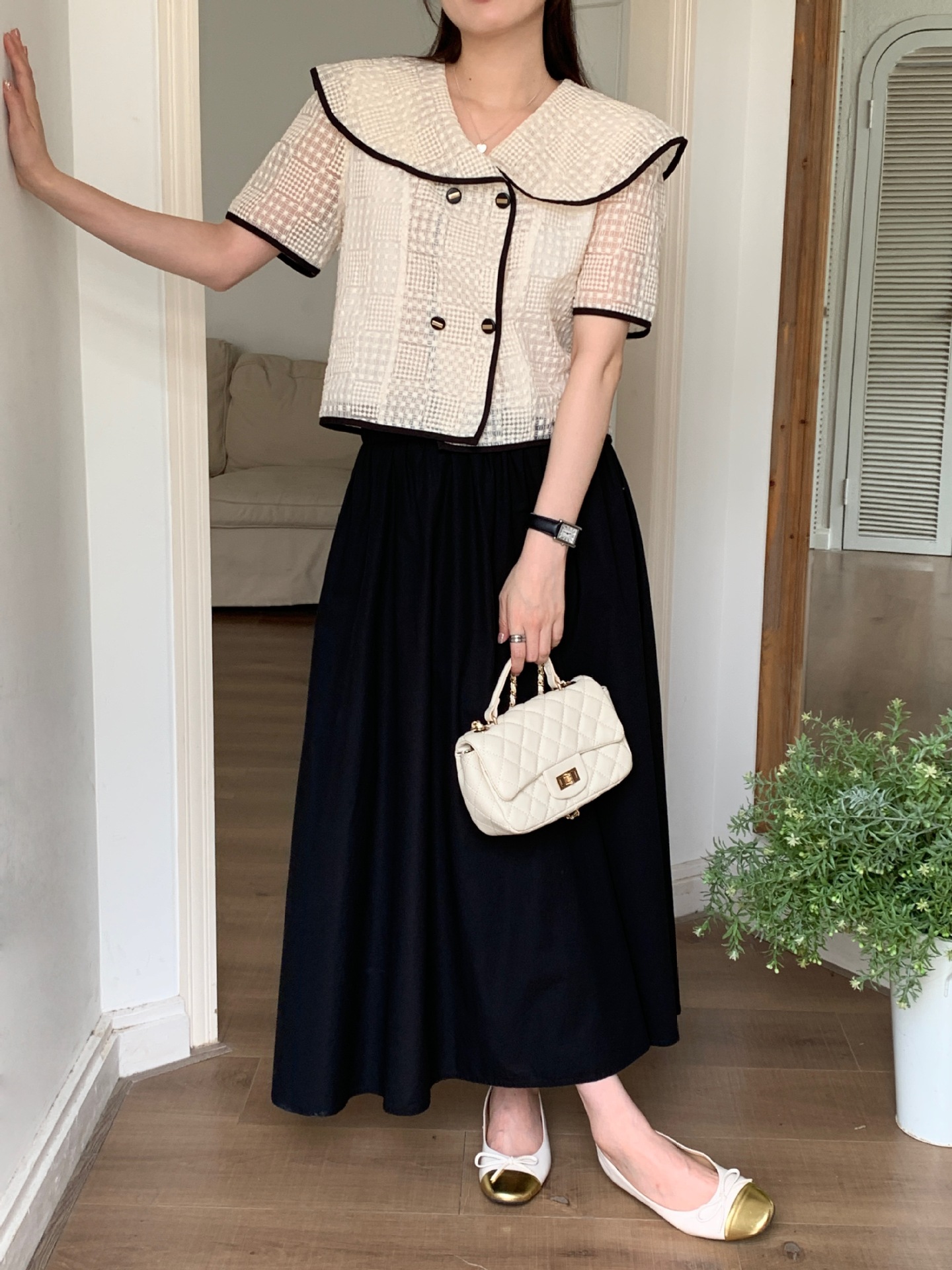 Real Shot Lace Contrast Lapel Age-reducing Double-breasted Shirt Women's Summer New Loose Short Top 63337