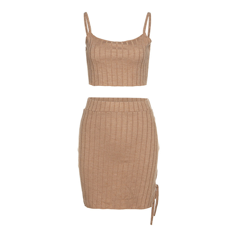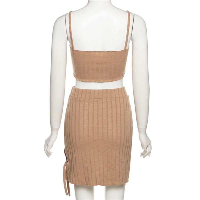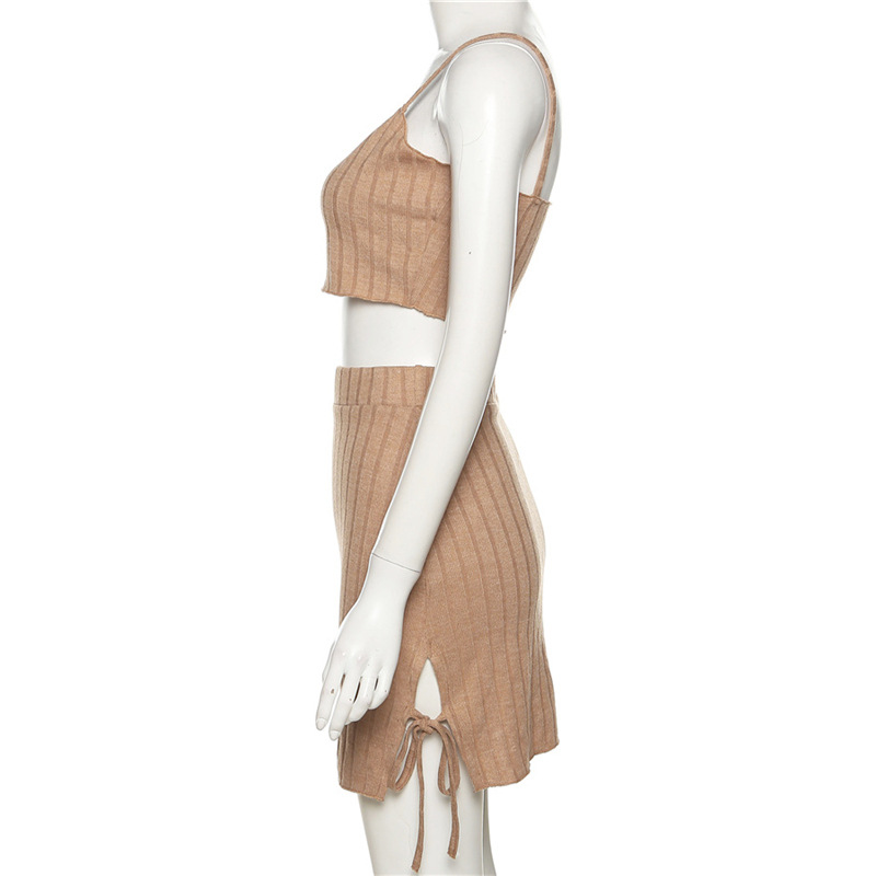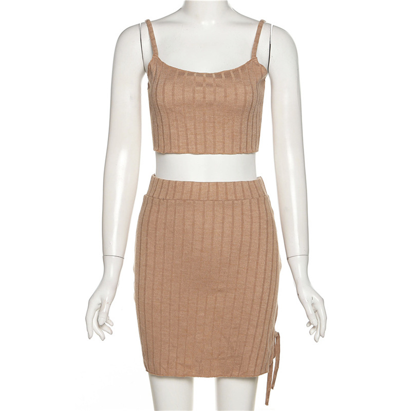K21S11570 Women's Sleeveless Ribbed Knit Spaghetti Strap Crop Cami Tank Top + Mini Split Skirt Set