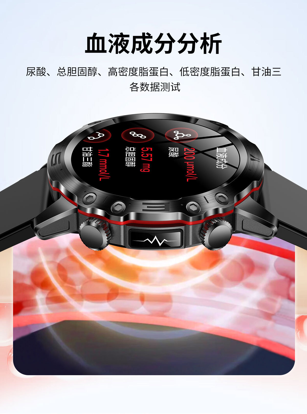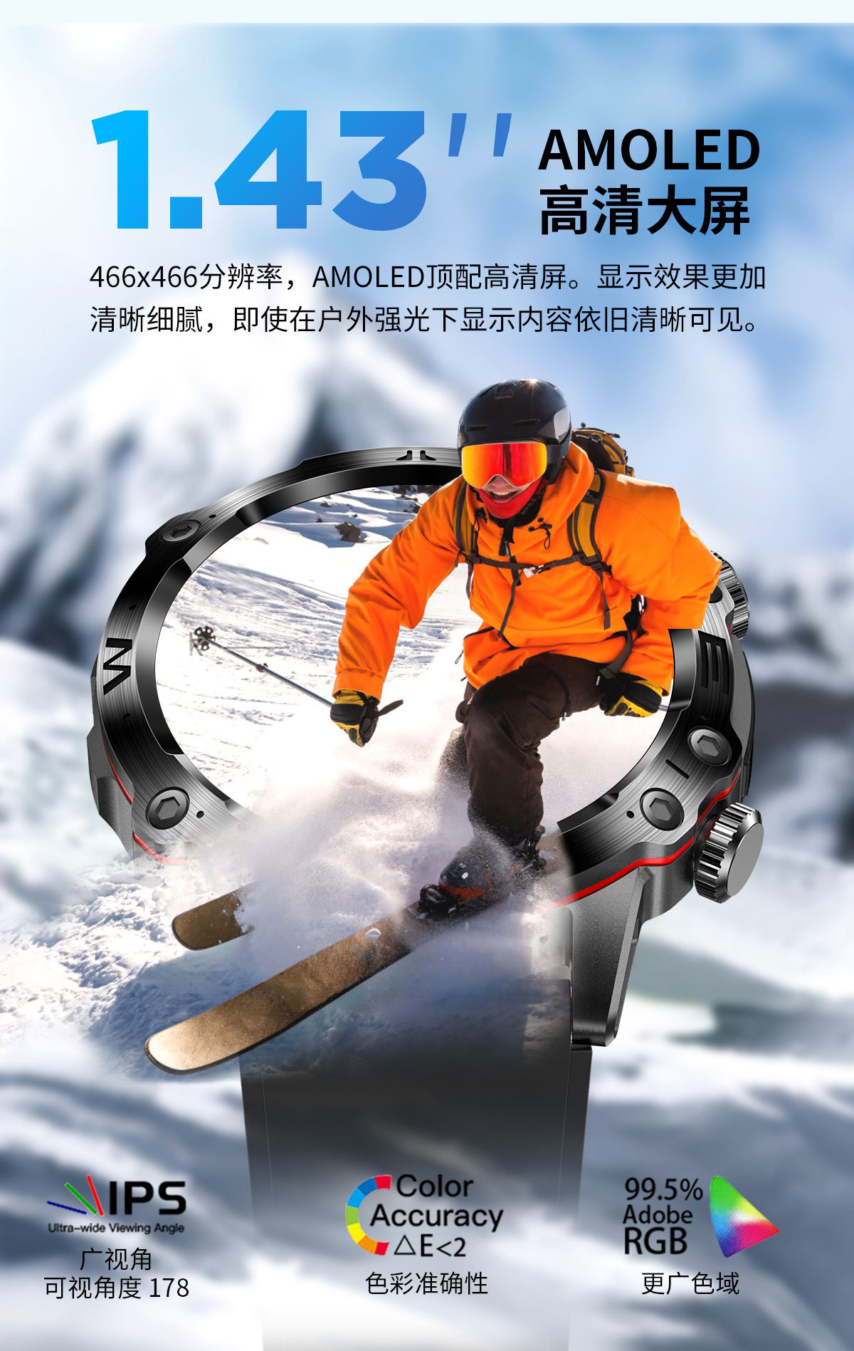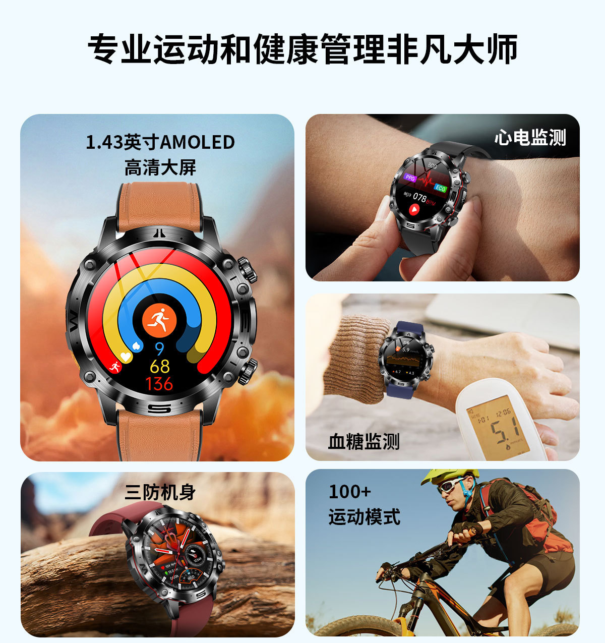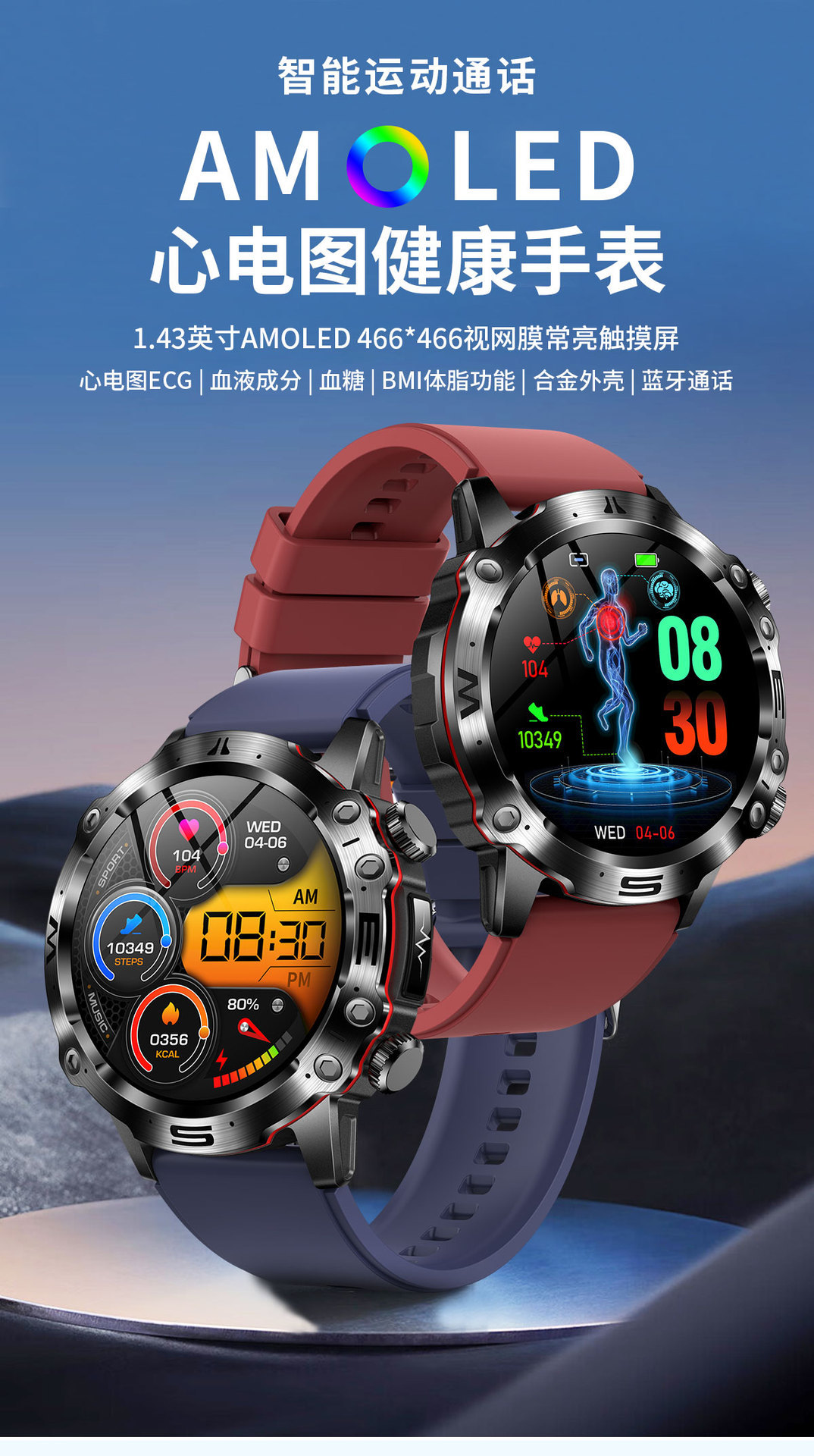 户外运动风,ECG心电图功能,1.43英寸AMOLED超视网膜466*466全触摸屏,蓝牙通话,无创血糖测量,血液成分测量(尿酸血脂功能),身体成分BMI体脂测量,HRV功能,AI医疗诊断,梅脱功能,SOS紧急呼叫功能,体温监测,血氧监测,血压监测,呼吸训练、压力监测,女性健康(经期跟踪),心率监测,睡眠监测、久坐提醒等健康功能。