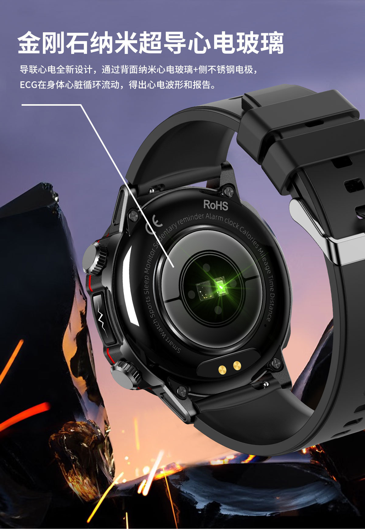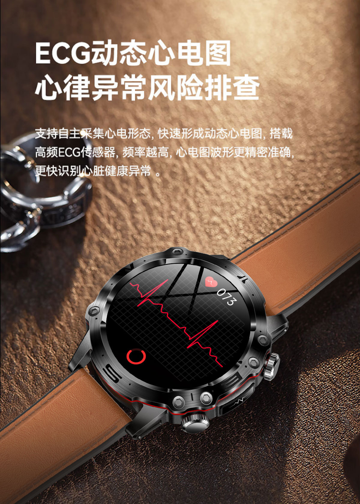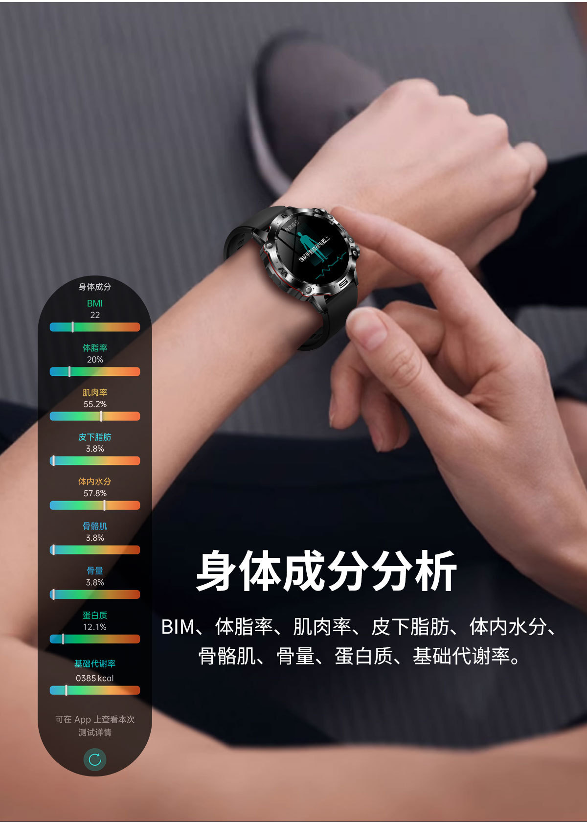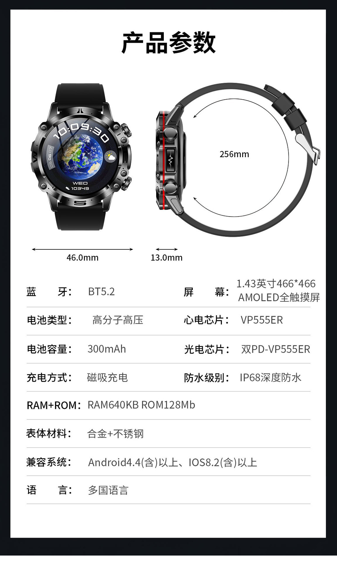 户外运动风,ECG心电图功能,1.43英寸AMOLED超视网膜466*466全触摸屏,蓝牙通话,无创血糖测量,血液成分测量(尿酸血脂功能),身体成分BMI体脂测量,HRV功能,AI医疗诊断,梅脱功能,SOS紧急呼叫功能,体温监测,血氧监测,血压监测,呼吸训练、压力监测,女性健康(经期跟踪),心率监测,睡眠监测、久坐提醒等健康功能。