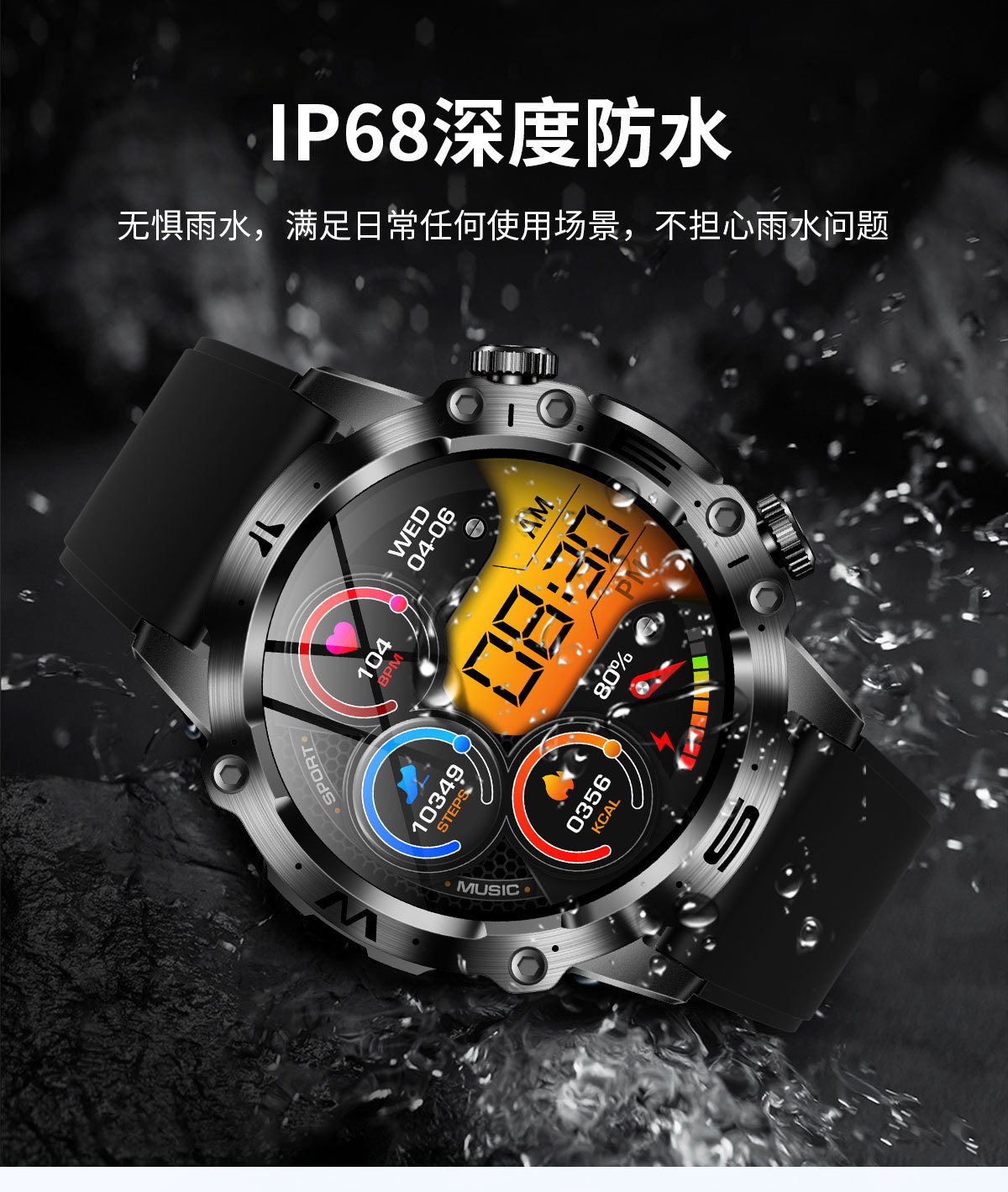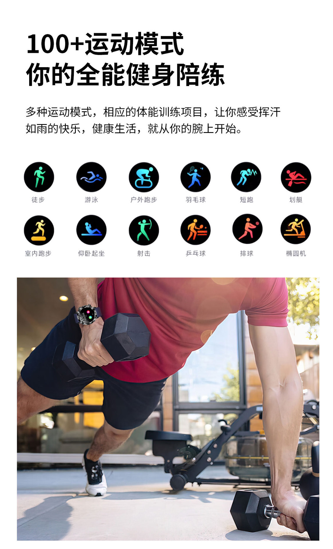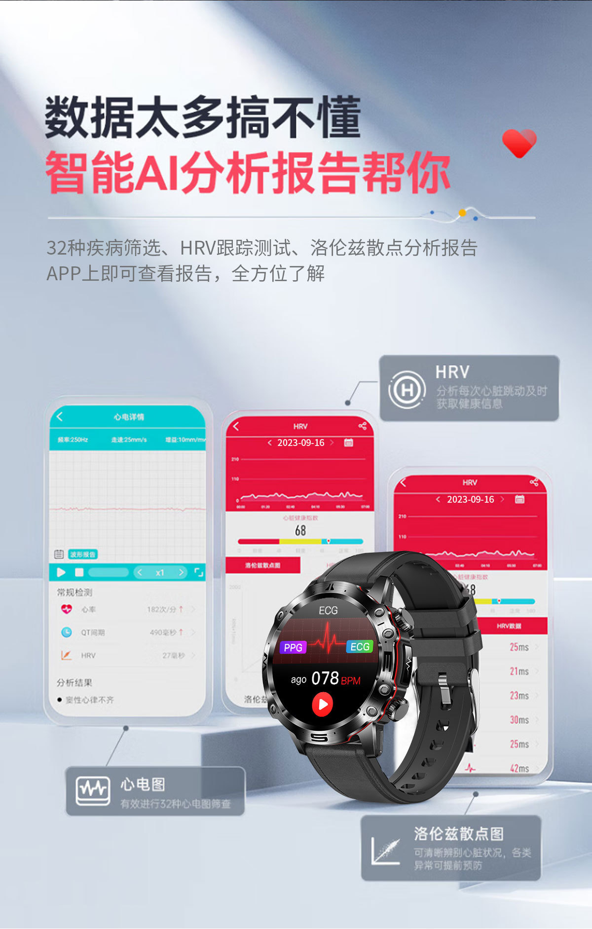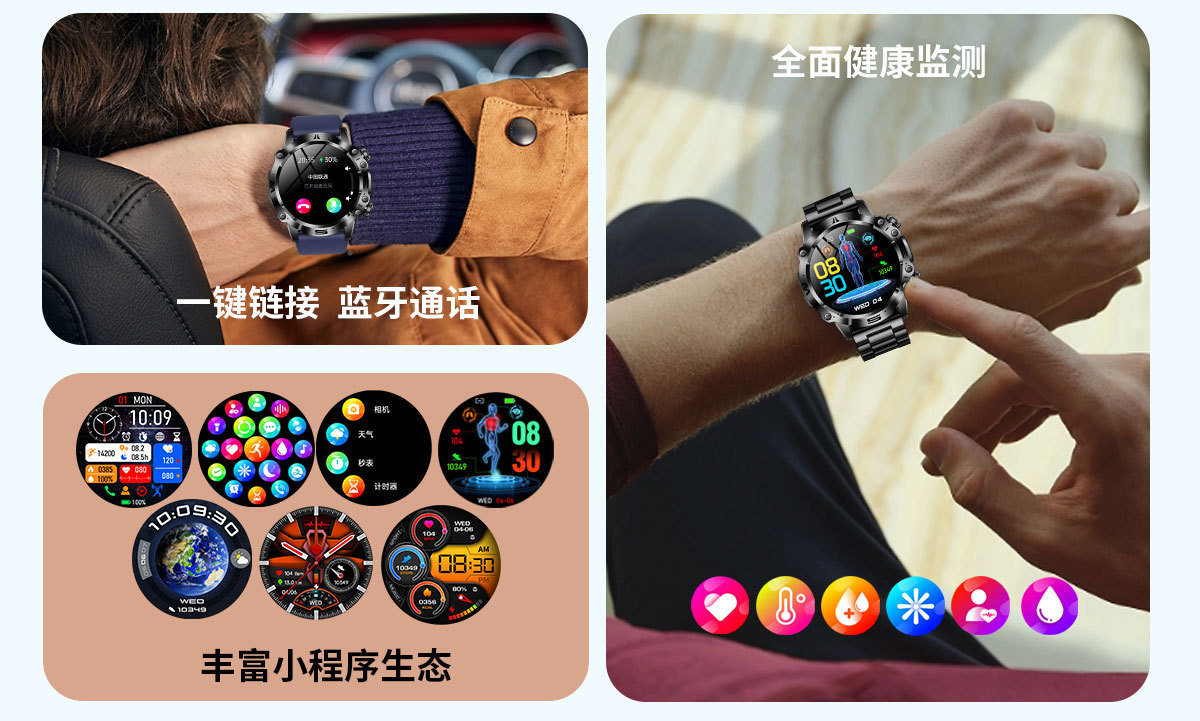 户外运动风,ECG心电图功能,1.43英寸AMOLED超视网膜466*466全触摸屏,蓝牙通话,无创血糖测量,血液成分测量(尿酸血脂功能),身体成分BMI体脂测量,HRV功能,AI医疗诊断,梅脱功能,SOS紧急呼叫功能,体温监测,血氧监测,血压监测,呼吸训练、压力监测,女性健康(经期跟踪),心率监测,睡眠监测、久坐提醒等健康功能。
