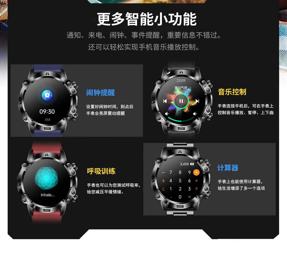 计步/卡路里/距离,多运动模式,音乐控制,息屏显示功能,天气预报,智能语音助手,游戏,手电筒,音乐播放和控制,