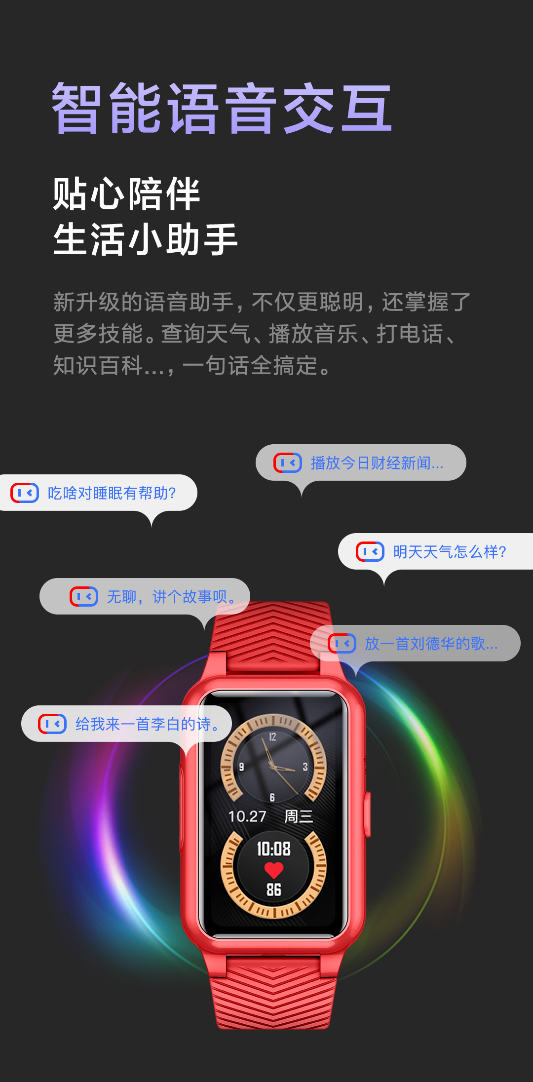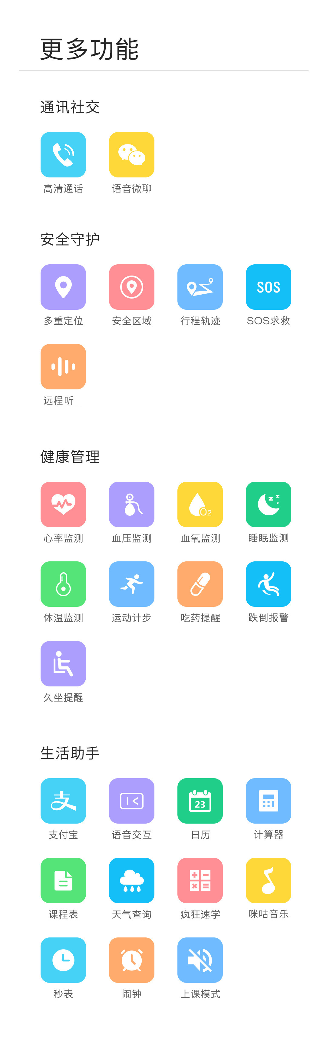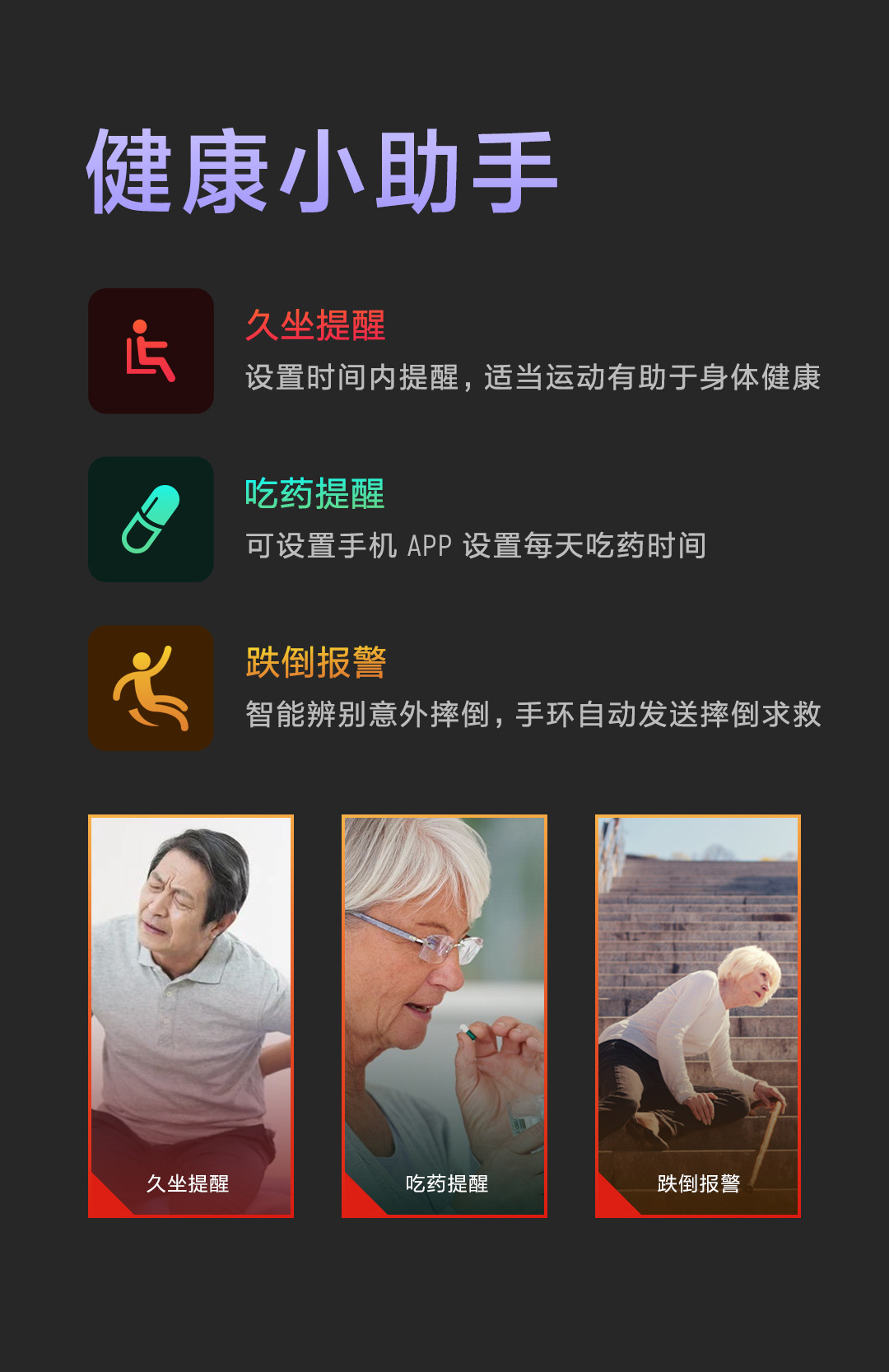 C:计步,心率、血压、血氧、体温监测,吃药提醒,跌到报警等健康小助手