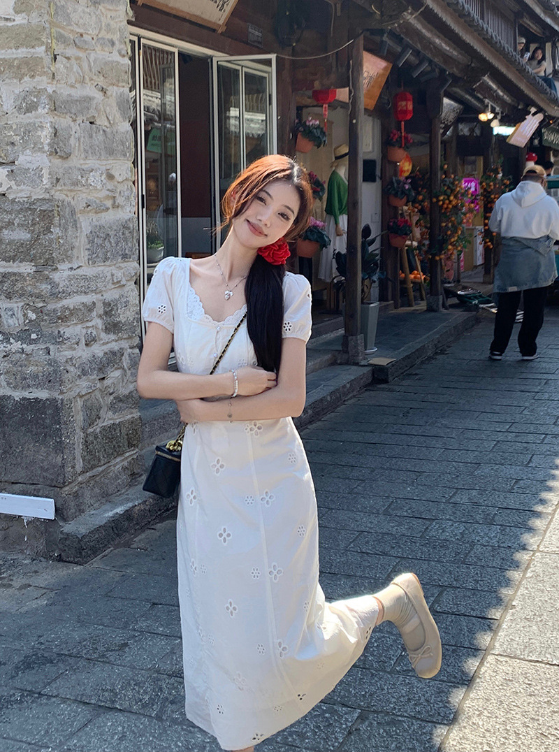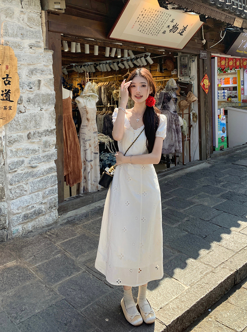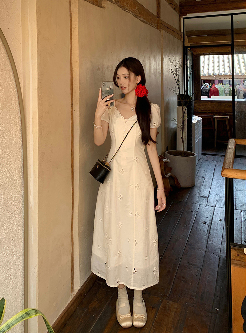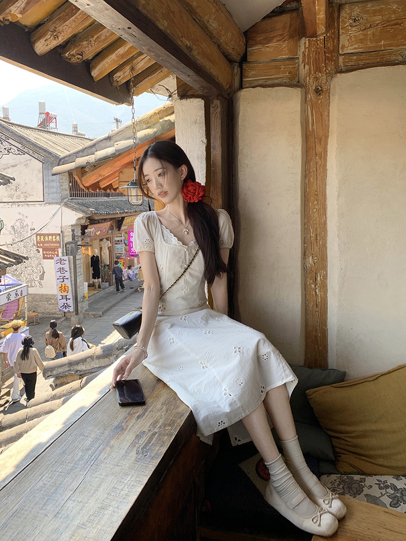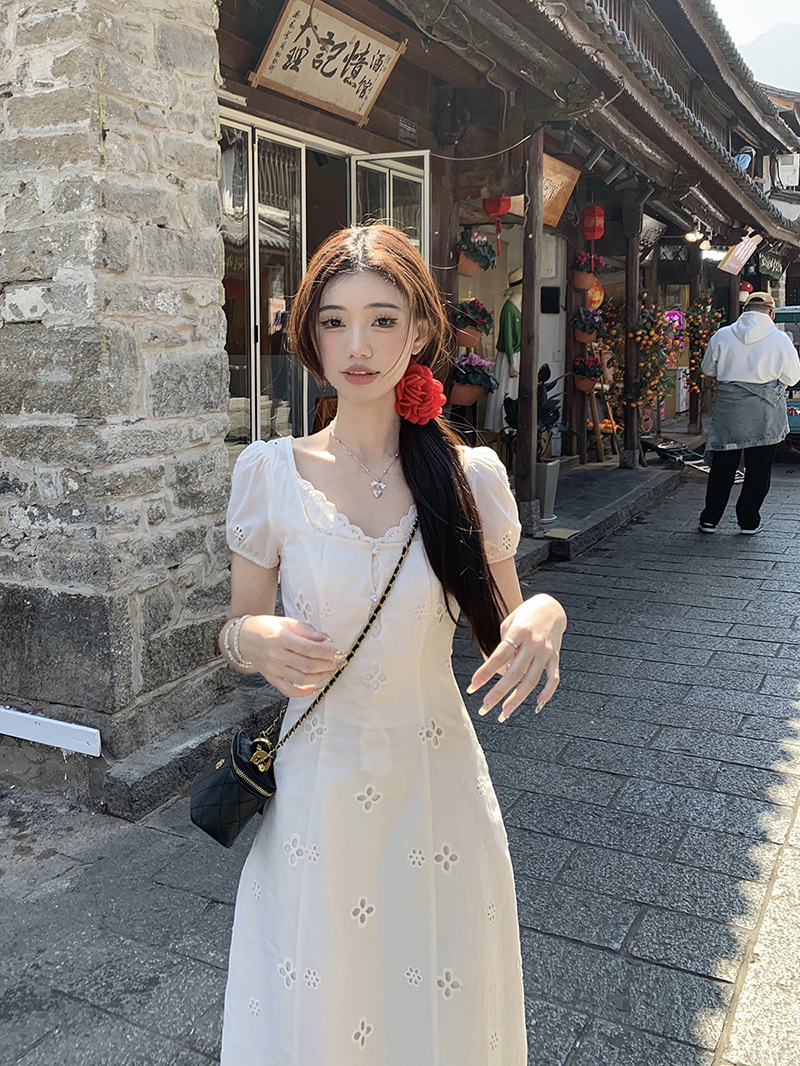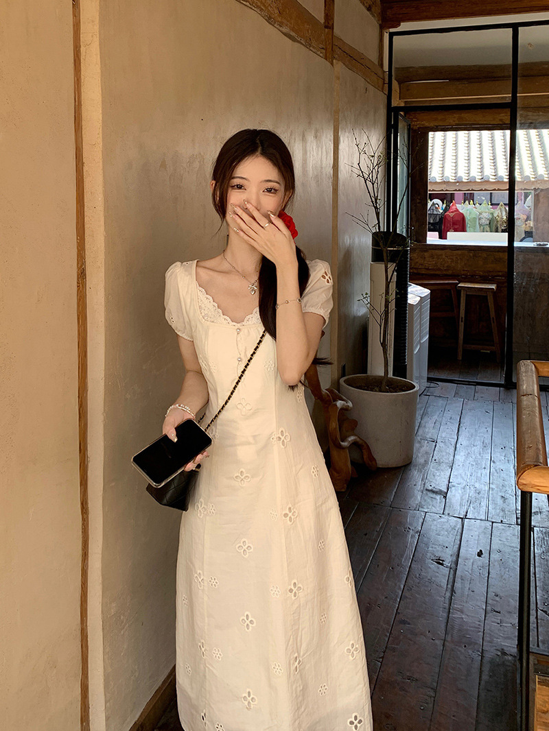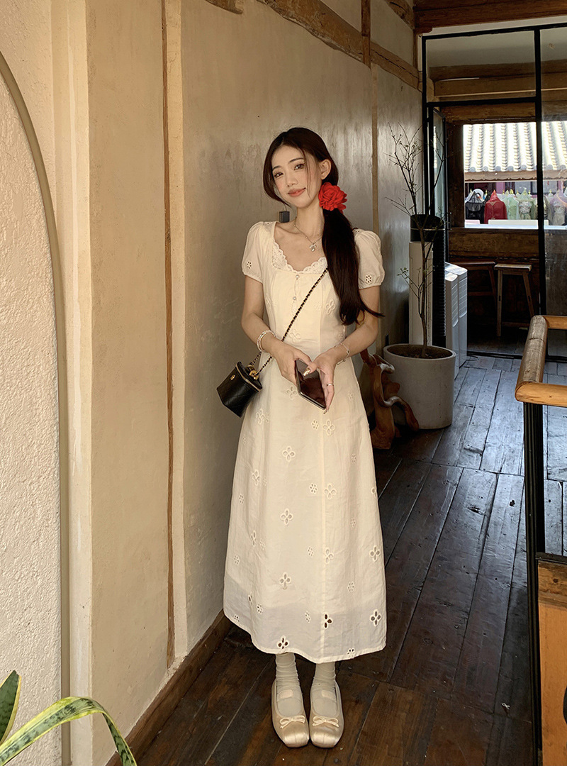 Vintage Hollow-out Embroidered Short-sleeved Dress Women's Spring and Summer French Style Romantic Pure Desire High Waist Slimming Long Dress First Love Dress