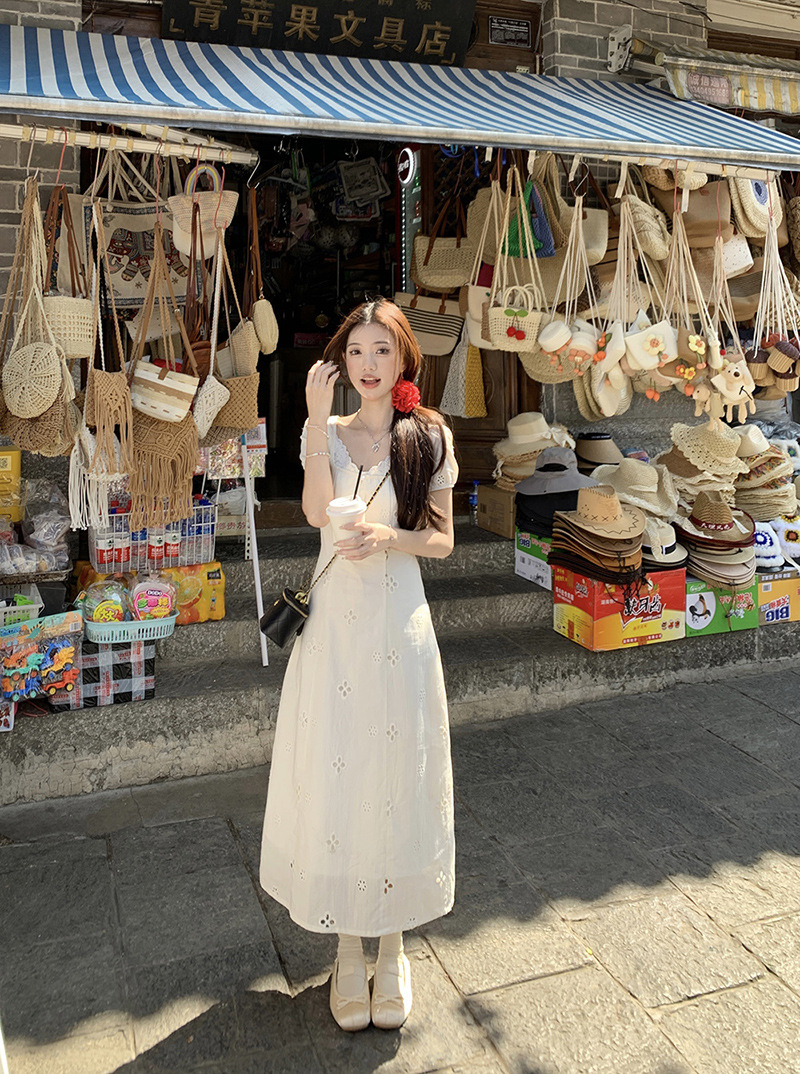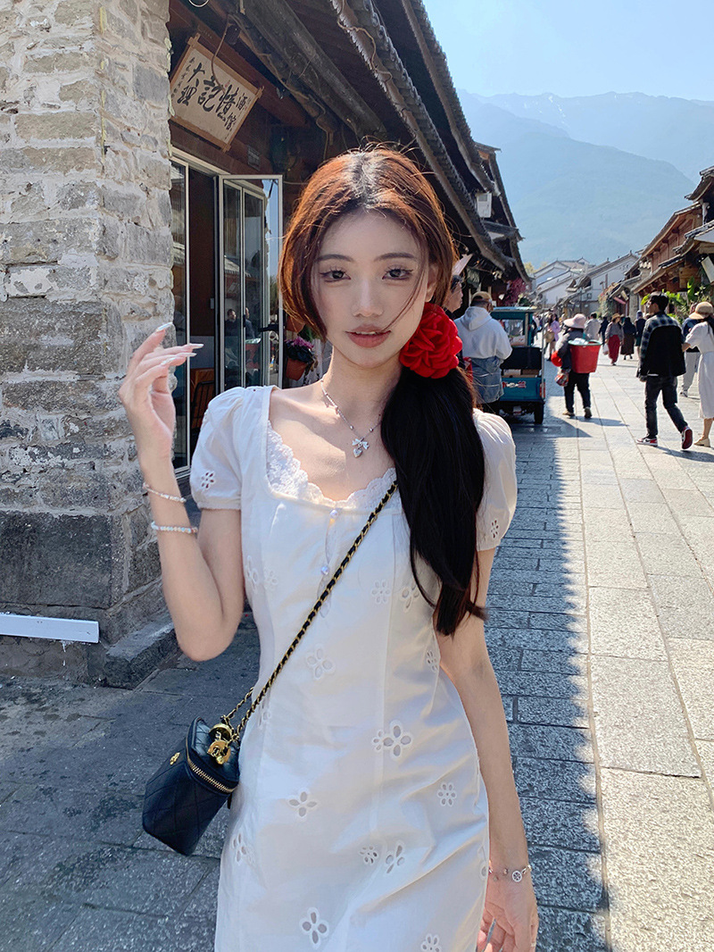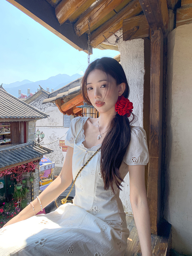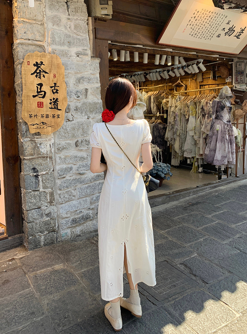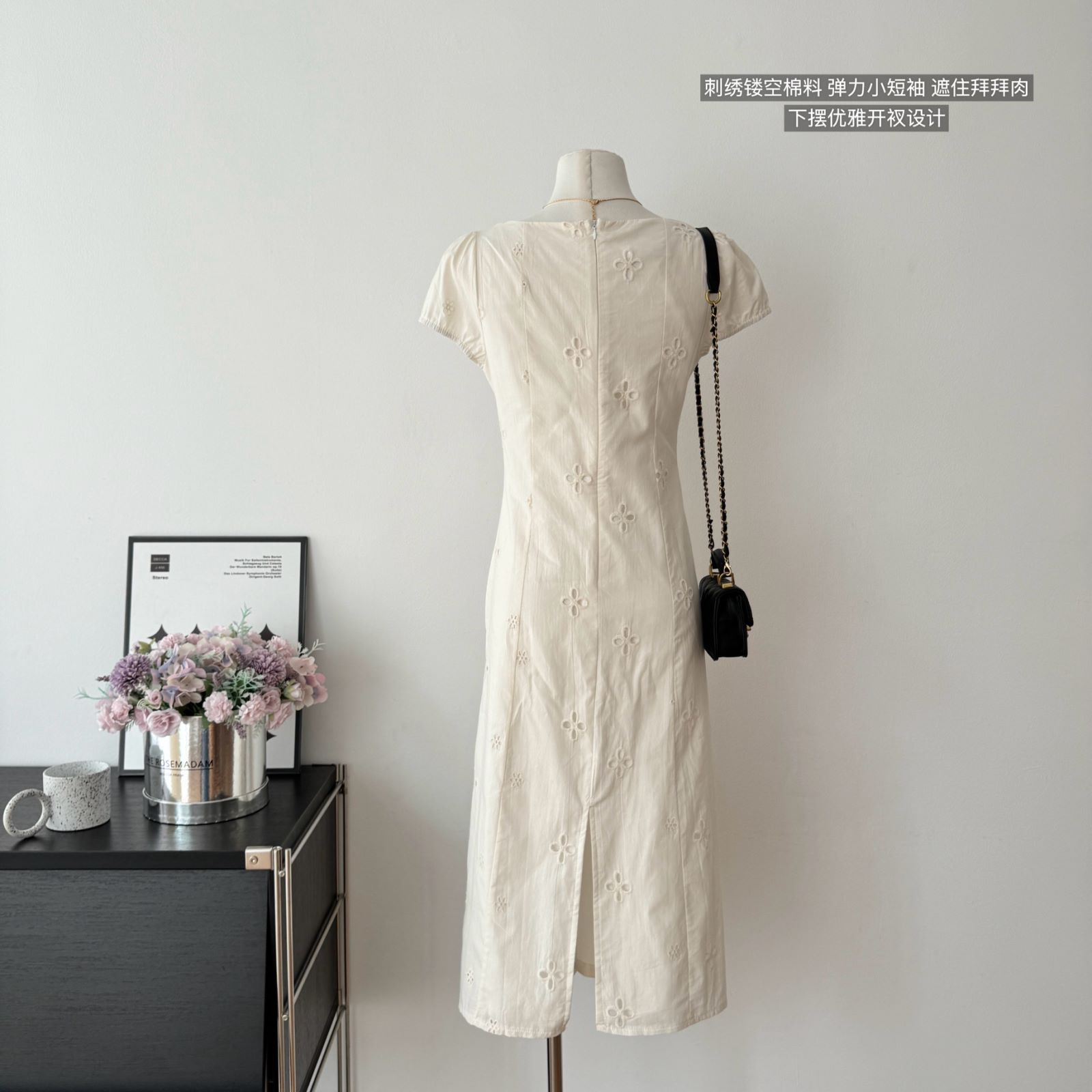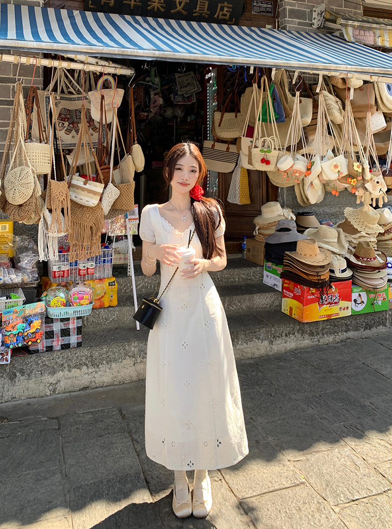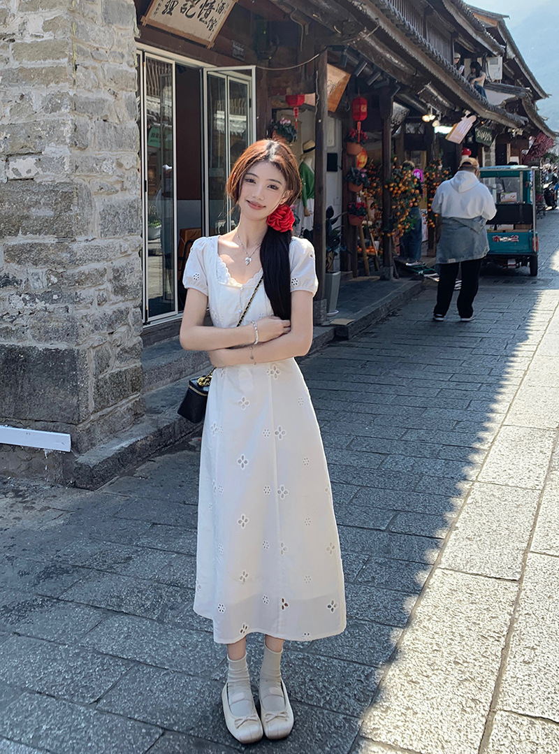 Vintage Hollow-out Embroidered Short-sleeved Dress Women's Spring and Summer French Style Romantic Pure Desire High Waist Slimming Long Dress First Love Dress