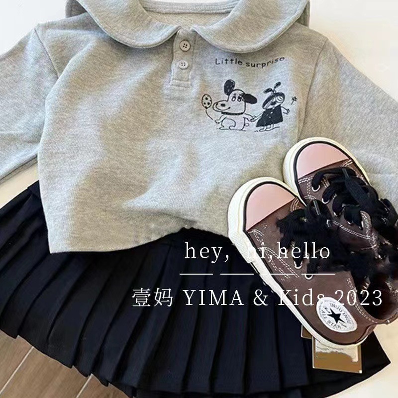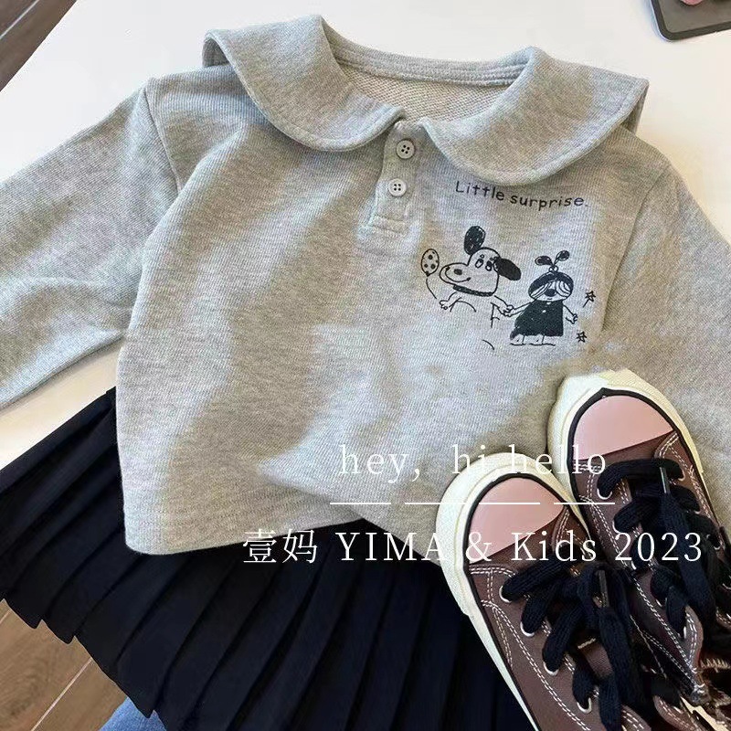 South Korea children's clothing girls' 2023 autumn clothes Gray small printed Korean cute navy collar baby girls' fashion sweater