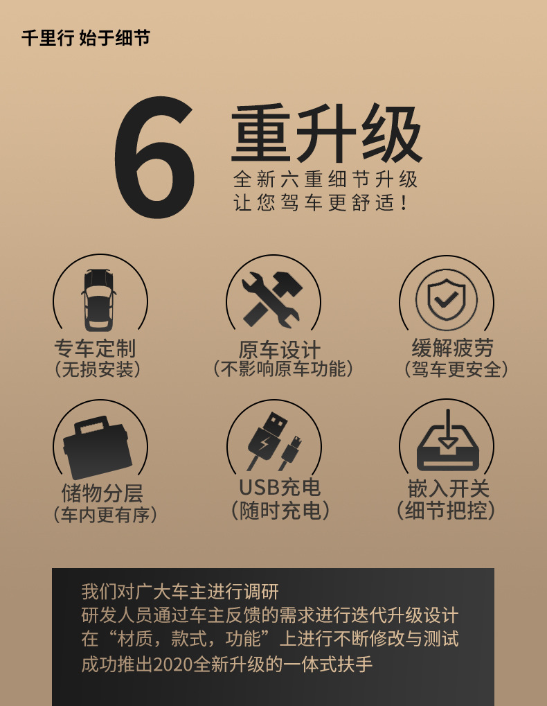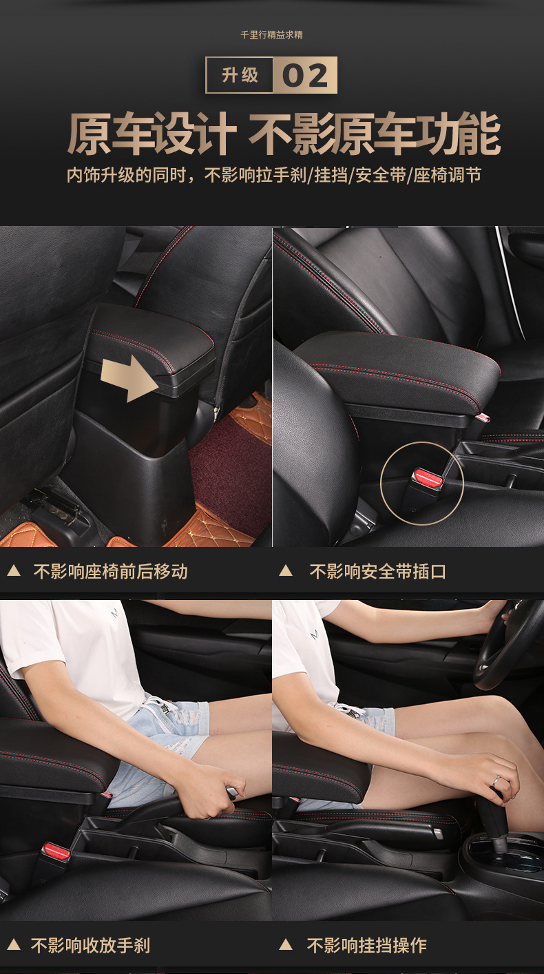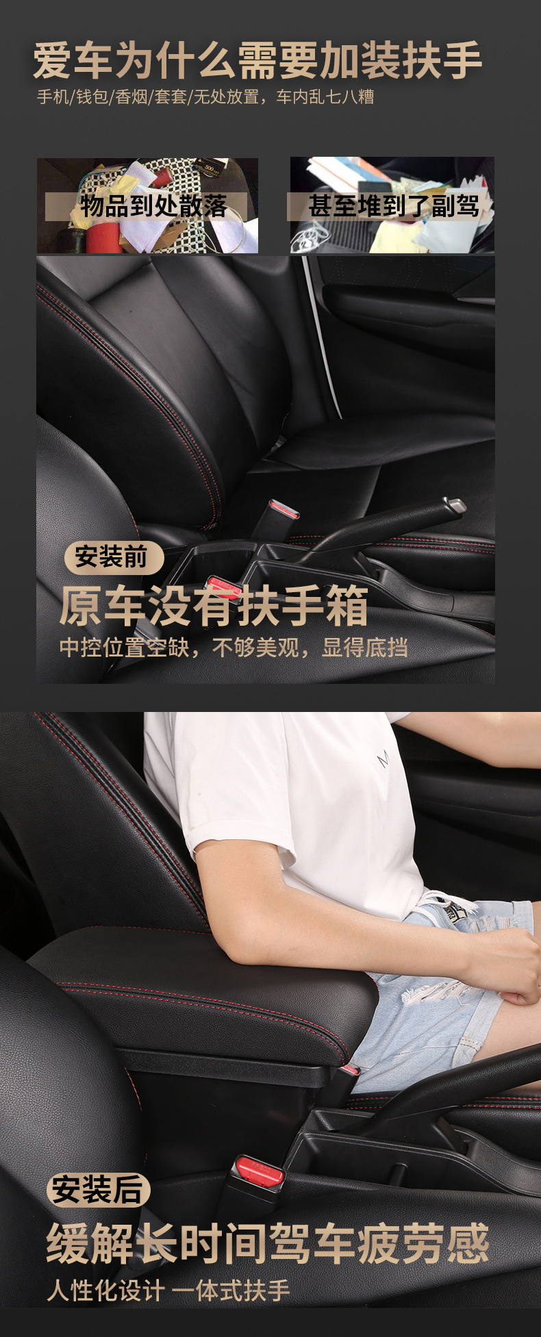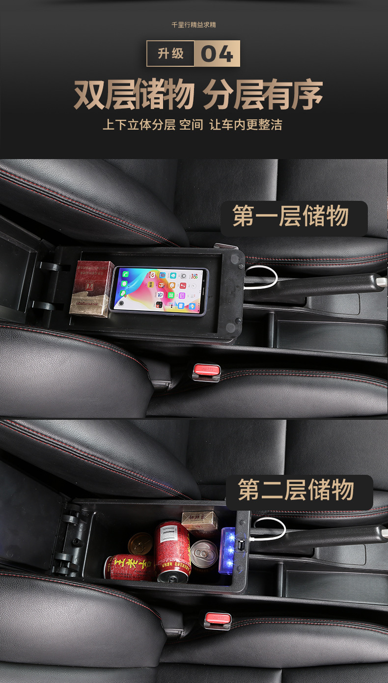 【产品特点】:本产品简约创意、设计独特、大容量收纳空间,适用于各类汽车原车没有中控扶手箱安装使用。主要功能为缓解胳膊疲劳,杂物收纳,保持车内整洁有序,增强坐车时的舒适体感,兼具USB供电和水杯架等功能。