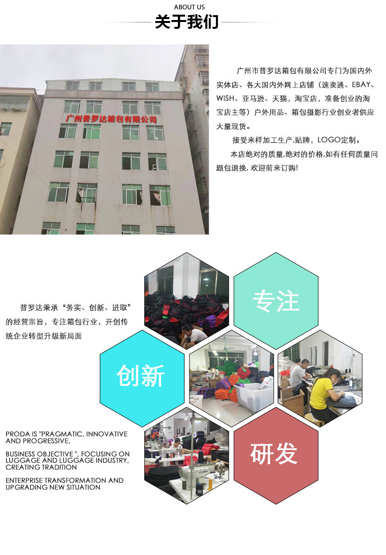 广州市普罗达箱包有限公司专门为国内外实体店、各大国内外网上店铺(速卖通、EBAY、WISH、亚马逊、天猫,淘宝店,准备创业的淘宝店主等)户外用品、箱包摄影行业创业者供应大量现货。接受来样加工生产,贴牌,logo定制,