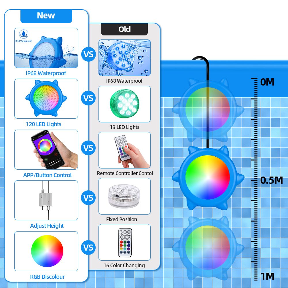 -扫描下载APP,将灯连接到手机上,使用和操作非常方便,摆脱简单的遥控器控制。户外泳池照明套件有无限的定制颜色,并配有高灵敏度的音频传感器,可以与音乐甚至你的声音同步闪烁。您可以设置工作时间自动开启/关闭。在游泳之夜,你会成为所有朋友和邻居羡慕的对象!